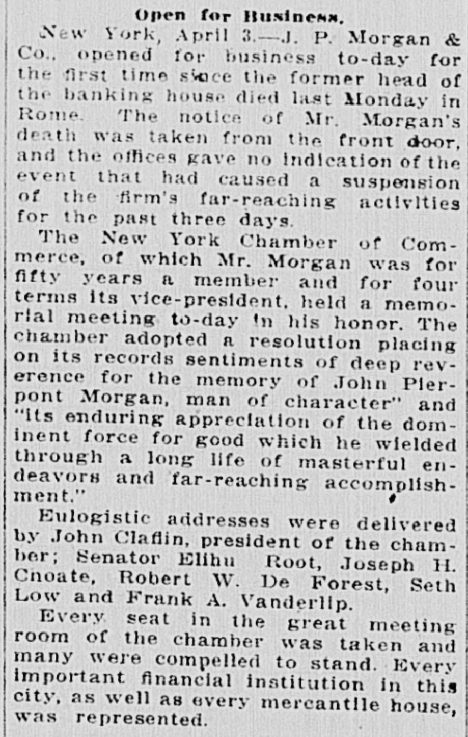 Open for Business. New York, April 3.-J. P. Morgan & Co., opened for business to-day for the first time since the former head of the banking house died last Monday in Rome. The notice of Mr. Morgan's death was taken from the front door, and the offices gave no indication of the event that had caused a suspension of the firm's far-reaching activities for the past three days. The New York Chamber of Commerce, of which Mr. Morgan was for fifty years a member and for four terms its vice-president, held a memorial meeting to-day in his honor. The chamber adopted a resolution placing on its records sentiments of deep reverence for the memory of John Plerpont Morgan, man of character" and "its enduring appreciation of the dominent force for good which he wielded through a long life of masterful endeavors and far-reaching accomplishment." Eulogistic addresses were delivered by John Claflin, president of the chamber; Senator Elihu Root, Joseph H. Choate, Robert W. De Forest, Seth Low and Frank A. Vanderlip. Every seat in the great meeting room of the chamber was taken and many were compelled to stand. Every important financial institution in this city, as well a8 every mercantile house, was represented.