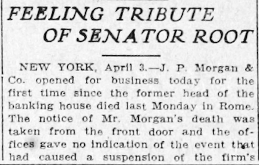 FEELING TRIBUTE OF SENATOR ROOT NEW YORK, April 3.-J. P. Morgan & Co. opened for business today for the first time since the former head of the banking house died last Monday in Rome. The notice of Mr. Morgan's death was taken from the front door and the offices gave no indication of the event that had caused a suspension of the firm's