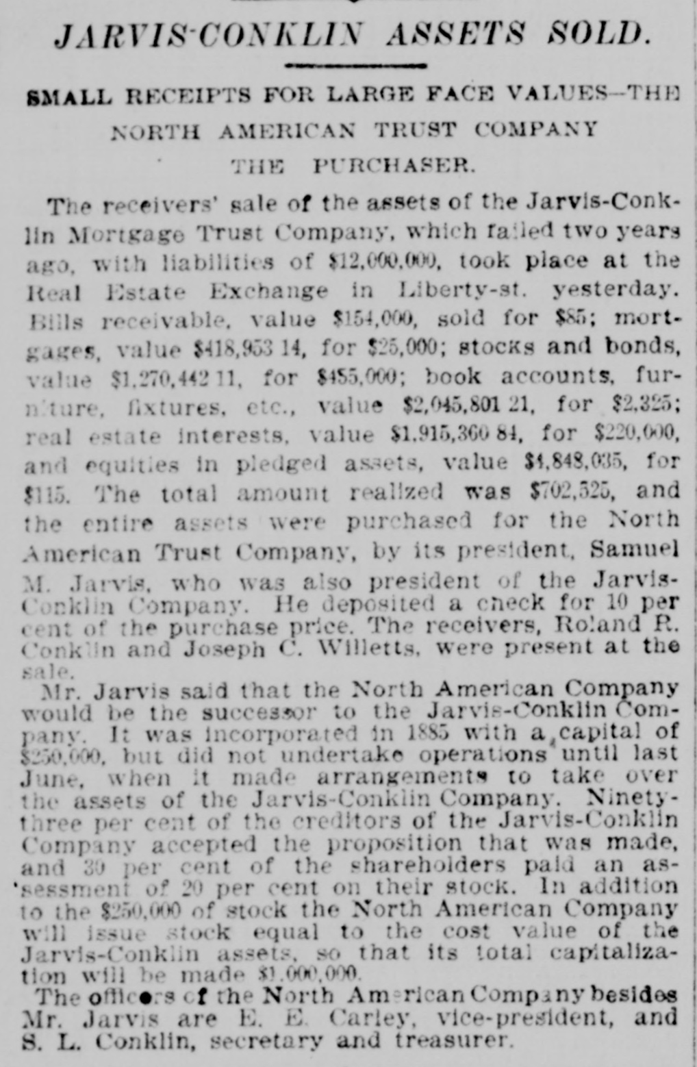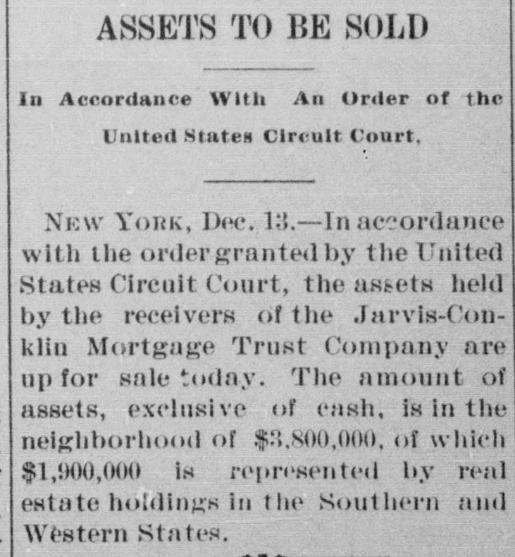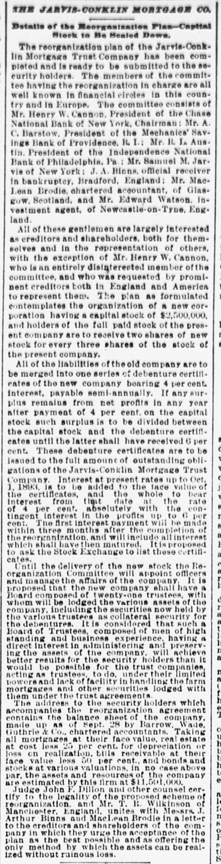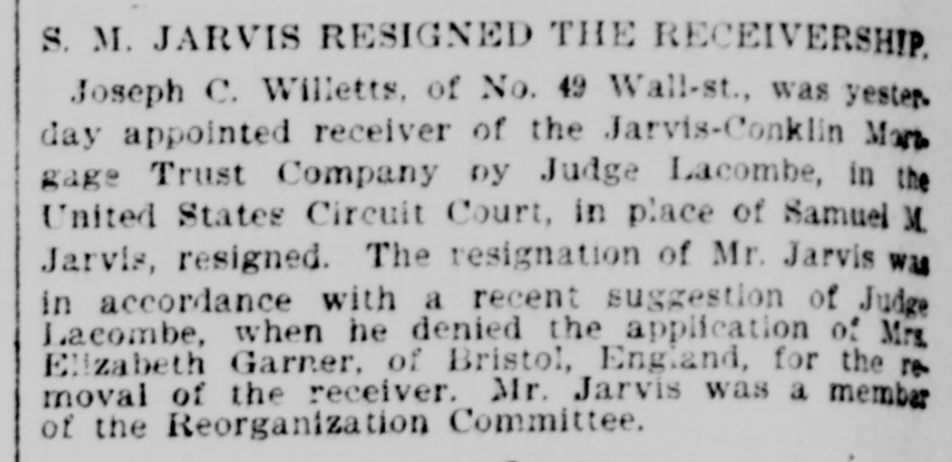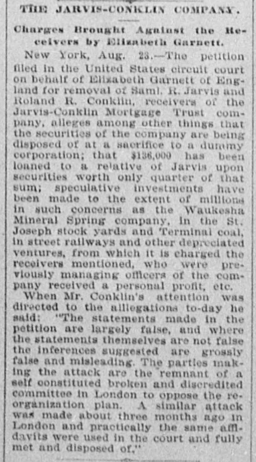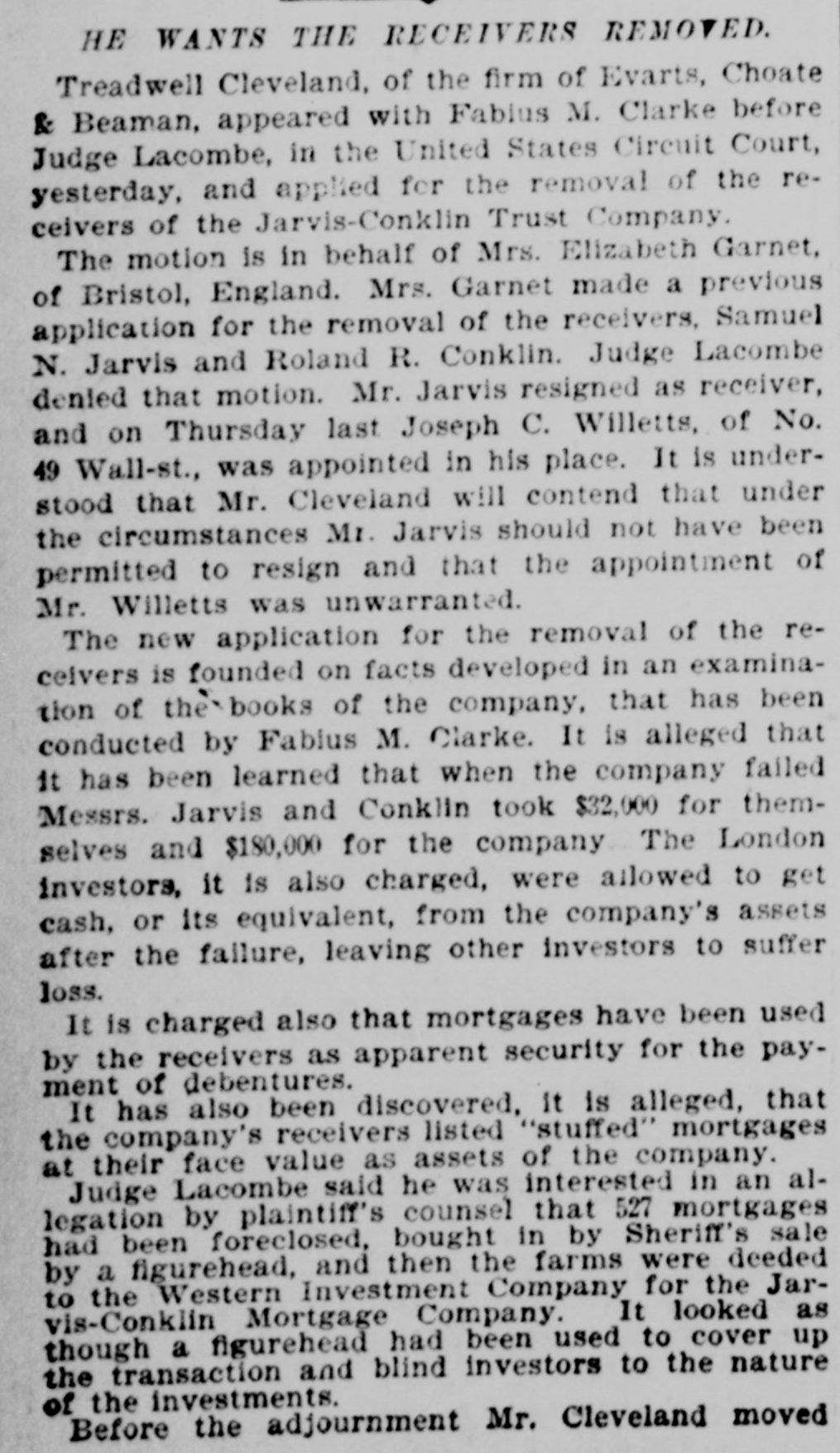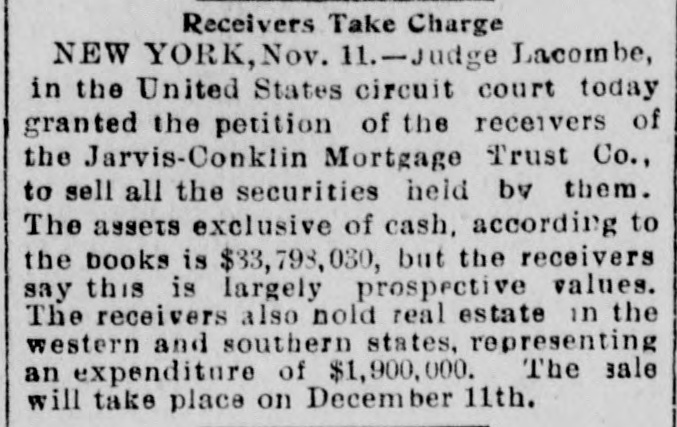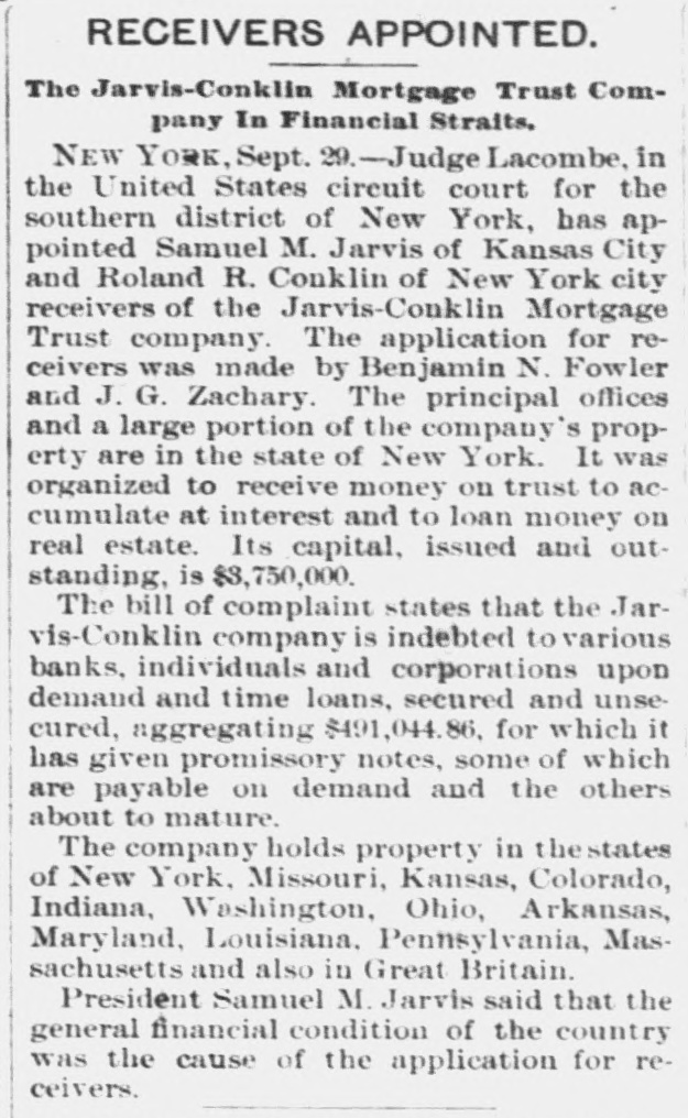 RECEIVERS APPOINTED. The Jarvis-Conklin Mortgage Trust Company In Financial Straits, NEW YORK, Sept. -Judge Lacombe, in the United States circuit court for the southern district of New York, has appointed Samuel M. Jarvis of Kansas City and Roland R. Conklin of New York city receivers of the Jarvis-Conklin Mortgage Trust company. The application for receivers was made by Benjamin N. Fowler and J. G. Zachary. The principal offices and a large portion of the company's property are in the state of New York. It was organized to receive money on trust to accumulate at interest and to loan money on real estate. Its capital, issued and outstanding, is $3,750,000. The bill of complaint states that the Jarvis-Conklin company is indebted to various banks, individuals and corporations upon demand and time loans, secured and unsecured, aggregating $491,044.86, for which it has given promissory notes, some of which are payable on demand and the others about to mature. The company holds property in thestates of New York, Missouri, Kansas, Colorado, Indiana, Washington, Ohio, Arkansas, Maryland, Louisiana, Pennsylvania, Massachusetts and also in Great Britain. President Samuel M. Jarvis said that the general financial condition of the country was the cause of the application for receivers.