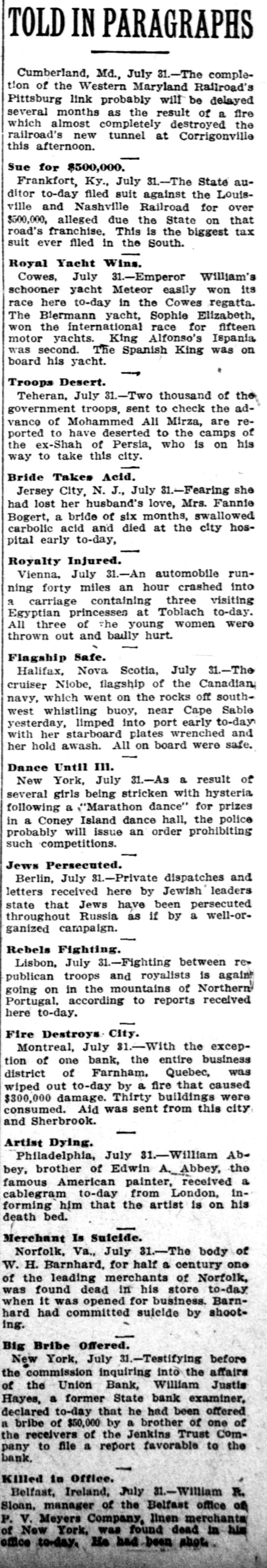 TOLD IN PARAGRAPHS Cumberland, Md., July 31.-The completion of the Western Maryland Railroad's Pittsburg link probably will be delayed several months as the result of a fire which almost completely destroyed the railroad's new tunnel at Corrigonville this afternoon. Sue for $500,000. Frankfort, Ky., July 31.-The State auditor to-day filed suit against the Louisville and Nashville Railroad for over $500,000, alleged due the State on that road's franchise. This is the biggest tax suit ever filed in the South. Royal Yacht Wins. Cowes, July 31.-Emperor William's schooner yacht Meteor easily won its race here to-day in the Cowes regatta. The Blermann yacht, Sophie Elizabeth, won the international race for fifteen motor yachts. King Alfonso's Ispania was second. The Spanish King was on board his yacht. 1 Troops Desert. Teheran, July 31.-Two thousand of the government troops, sent to check the advance of Mohammed All Mirza, are reported to have deserted to the camps of the ex-Shah of Persia, who is on his way to take this city. Bride Takes Acid. Jersey City, N. J., July 31.-Fearing she had lost her husband's love, Mrs. Fannie Bogert, a bride of six months, swallowed carbolic acid and died at the city hospital early to-day, Royalty Injured. Vienna, July 31.-An automobile running forty miles an hour crashed into a carriage containing three visiting Egyptian princesses at Toblach to-day. All three of the young women were thrown out and bailly hurt. Flagship Safe. Halifax, Nova Scotia, July 31.-The cruiser Niobe, flagship of the Canadian navy, which went on the rocks off southwest whistling buoy, near Cape Sable yesterday, limped into port early to-day with her starboard plates wrenched and her hold awash. All on board were safe. Dance Until III. New York, July 31.-As a result of several girls being stricken with hysteria following a "Marathon dance" for prizes in a Coney Island dance hall, the police probably will issue an order prohibiting such competitions. Jews Persecuted. Berlin, July 31.-Private dispatches and letters received here by Jewish leaders state that Jews have been persecuted throughout Russia as if by a well-organized campaign. Rebels Fighting. Lisbon, July 31.-Fighting between republican troops and royalists is agains going on in the mountains of Northern Portugal, according to reports received here to-day. Fire Destroys City. Montreal, July 31.-With the exception of one bank, the entire business district of Farnham, Quebec, was wiped out to-day by a fire that caused $300,000 damage. Thirty buildings were consumed. Aid was sent from this city and Sherbrook. Artist Dying. Philadelphia, July 31.-William Abbey, brother of Edwin _Abbey, the famous American painter, received a cablegram to-day from London, informing him that the artist is on his death bed. Merchant Is Suicide. Norfolk, Va., July 31.-The body of W. H. Barnhard, for half a century one of the leading merchants of Norfolk, was found dead in his store to-day when it was opened for business. Barnhard had committed suicide by shooting. Big Bribe Offered. New York, July 31.-Testifying before the commission inquiring into the affairs of the Union Bank, William Justis Hayes, a former State bank examiner, declared to-day that he had been offered a bribe of $50,000 by a brother of one of the receivers of the Jenkins Trust Company to file a report favorable to the bank. 1 Killed in Office. Belfast, Ireland, July 31.-William R. Sloan, manager of the Belfast office of P. V. Meyers Company, linen merchants of Now York, was found dead in him office to-day. He had been shot.