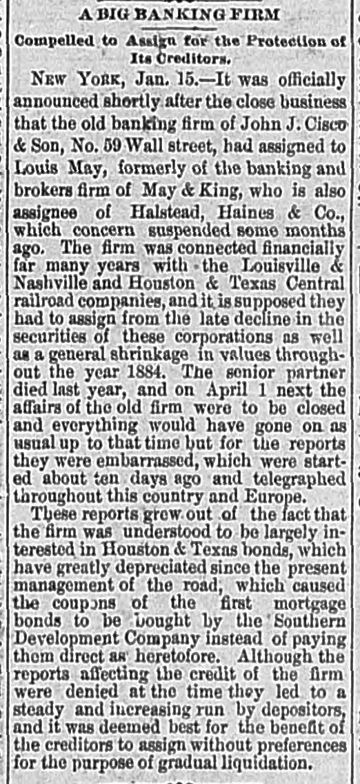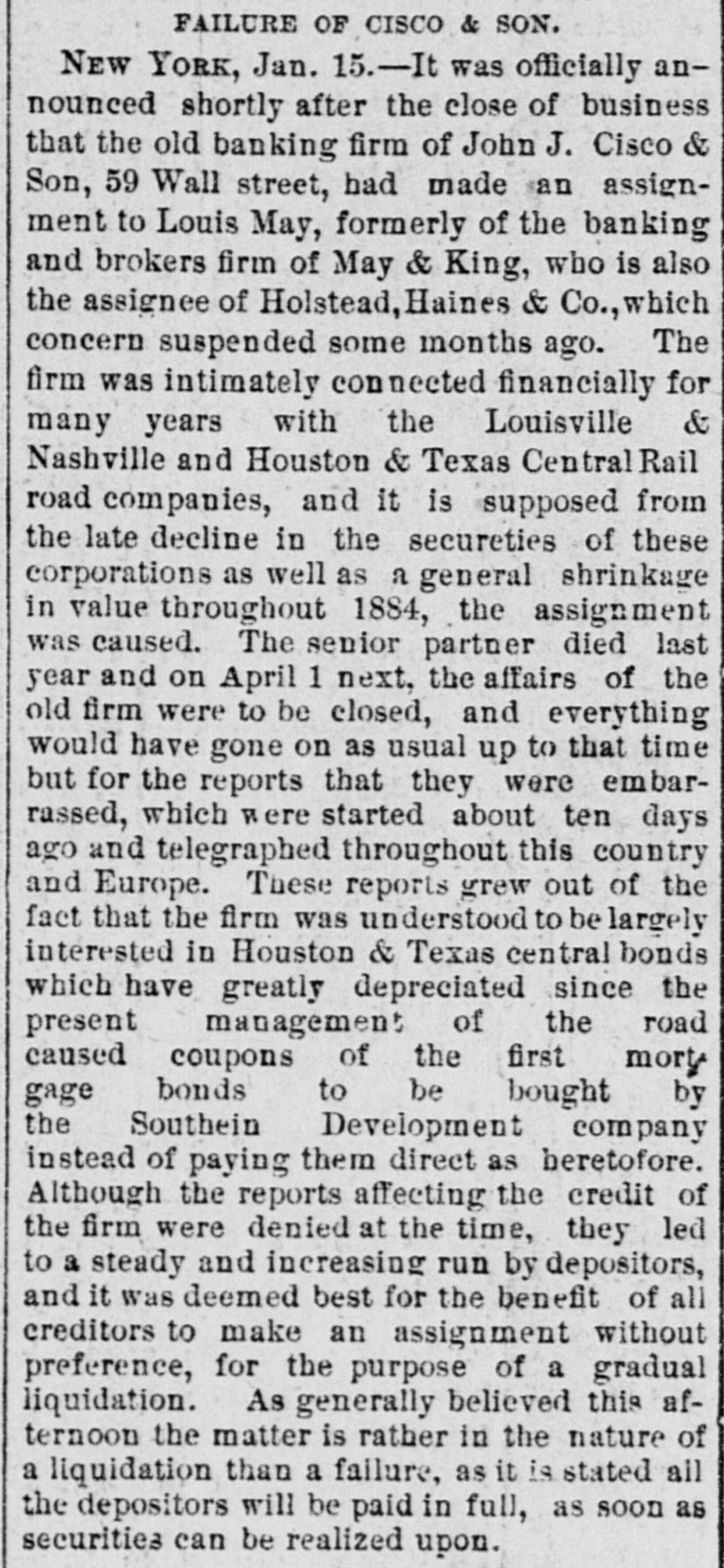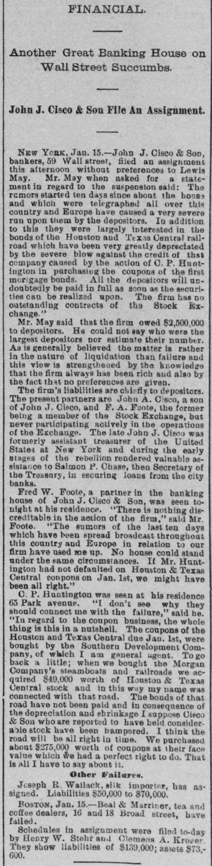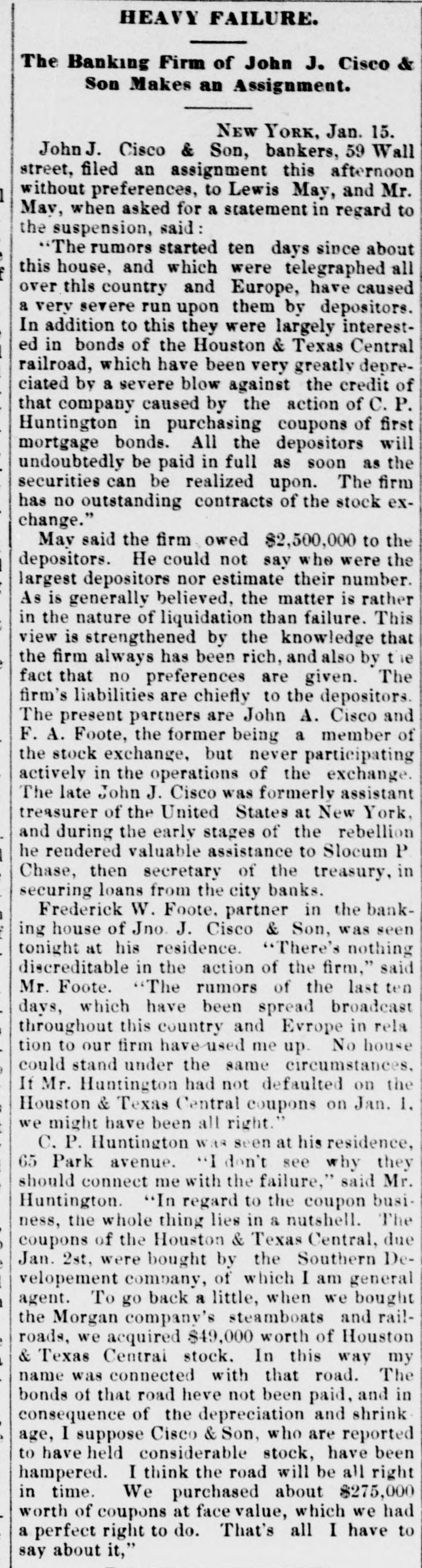 HEAVY FAILURE. The Banking Firm of John J. Cisco & Son Makes an Assignment. NEW YORK, Jan. 15. John J. Cisco & Son, bankers, 59 Wall street, filed an assignment this afternoon without preferences, to Lewis May, and Mr. 1 May, when asked for a statement in regard to the suspension, said: "The rumors started ten days since about this house, and which were telegraphed all over this country and Europe, have caused a very severe run upon them by depositors. In addition to this they were largely interested in bonds of the Houston & Texas Central railroad, which have been very greatly depreciated by a severe blow against the credit of that company caused by the action of C.P Huntington in purchasing coupons of first mortgage bonds. All the depositors will undoubtedly be paid in full as soon as the securities can be realized upon. The firm has no outstanding contracts of the stock exchange." May said the firm owed $2,500,000 to the depositors. He could not say who were the largest depositors nor estimate their number. As is generally believed, the matter is rather in the nature of liquidation than failure. This view is strengthened by the knowledge that the firm always has been rich, and also by e fact that no preferences are given. The firm's liabilities are chiefly to the depositors. The present partners are John A. Cisco and F. A. Foote, the former being a member of the stock exchange, but never participating actively in the operations of the exchange. The late John J. Cisco was formerly assistant treasurer of the United States at New York, and during the early stages of the rebellion he rendered valuable assistance to Slocum P Chase, then secretary of the treasury, in securing loans from the city banks. Frederick W. Foote, partner in the banking house of Jno. J. Cisco & Son, was seen tonight at his residence. "There's nothing discreditable in the action of the firm," said Mr. Foote. "The rumors of the last ten days, which have been spread broadcast throughout this country and Evrope in rela tion to our firm have-used me up. No house could stand under the same circumstances. If Mr. Huntington had not defaulted on the Houston & Texas Central coupons on Jan. 1. we might have been all right." C. P. Huntington was seen at his residence, 65 Park avenue. "I don't see why they should connect me with the failure," said Mr. Huntington. "In regard to the coupon business, the whole thing lies in a nutshell. The coupons of the Houston & Texas Central, due Jan. 2st, were bought by the Southern Developement company, of which I am general agent. To go back a little, when we bought the Morgan company's steamboats and railroads, we acquired $49,000 worth of Houston & Texas Central stock. In this way my name was connected with that road. The bonds of that road heve not been paid, and in consequence of the depreciation and shrink age, I suppose Cisco & Son, who are reported to have held considerable stock, have been hampered. I think the road will be all right in time. We purchased about $275,000 worth of coupons at face value, which we had a perfect right to do. That's all I have to say about it,"