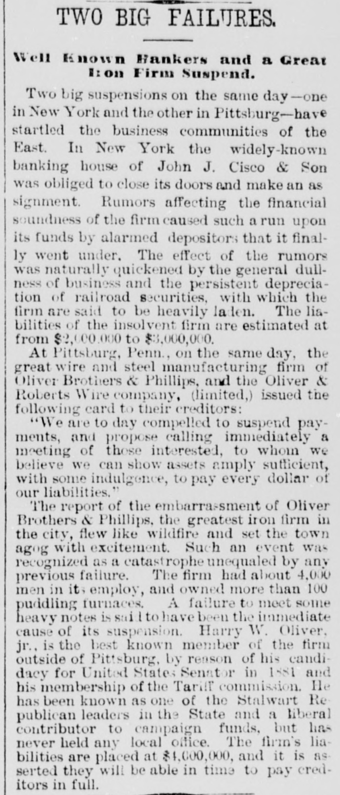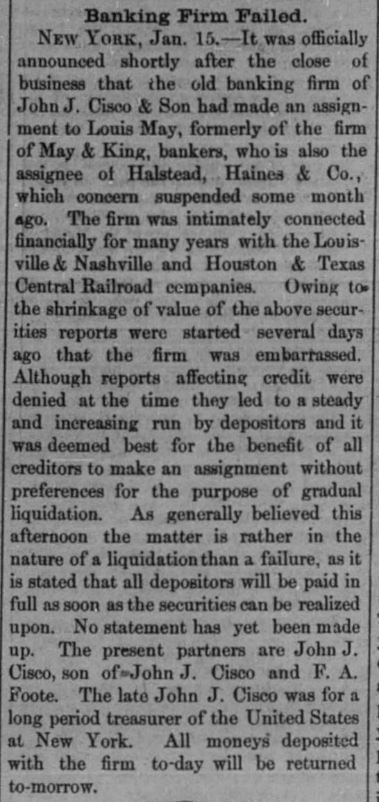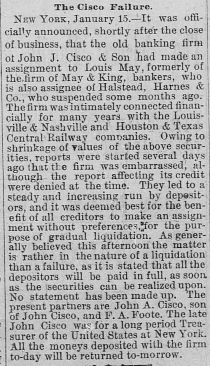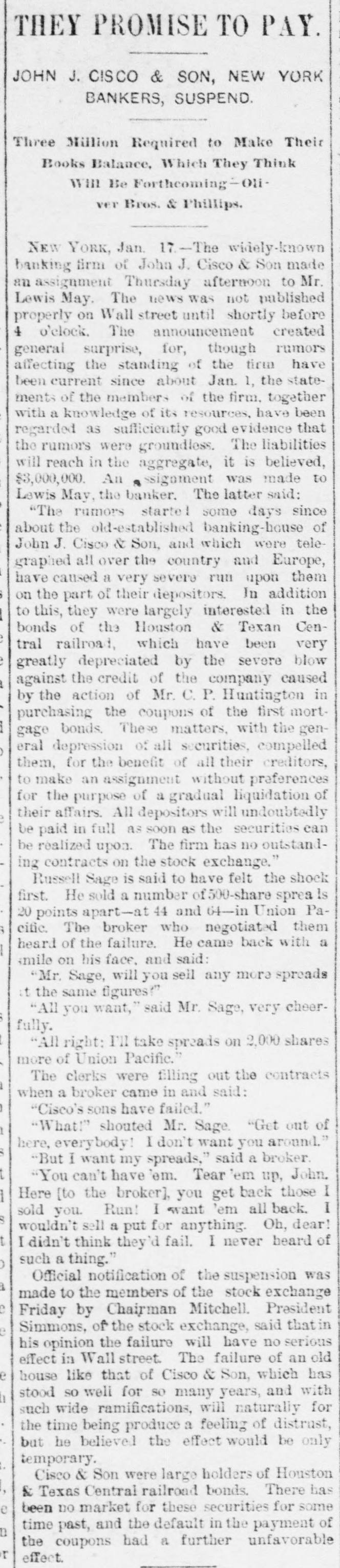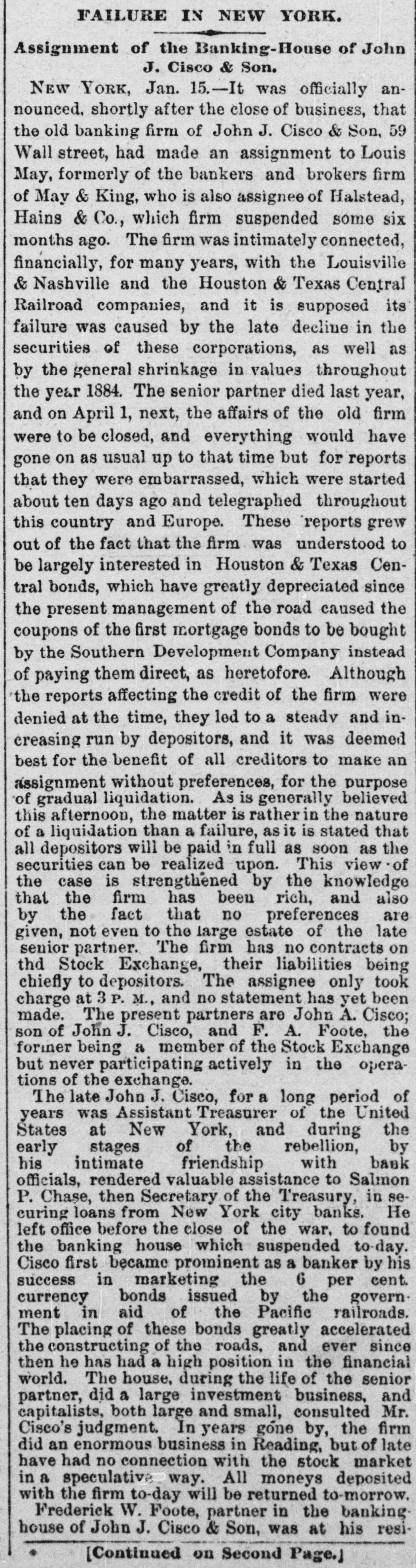 HEAVY FAILURE. The Banking Firm of John J. Cisco & Son Makes an Assignment. NEW YORK, Jan. 15. John J. Cisco & Son, bankers, 59 Wall street, filed an assignment this afternoon without preferences, to Lewis May, and Mr. 1 May, when asked for a statement in regard to the suspension, said: "The rumors started ten days since about this house, and which were telegraphed all over this country and Europe, have caused a very severe run upon them by depositors. In addition to this they were largely interested in bonds of the Houston & Texas Central railroad, which have been very greatly depreciated by a severe blow against the credit of that company caused by the action of C.P Huntington in purchasing coupons of first mortgage bonds. All the depositors will undoubtedly be paid in full as soon as the securities can be realized upon. The firm has no outstanding contracts of the stock exchange." May said the firm owed $2,500,000 to the depositors. He could not say who were the largest depositors nor estimate their number. As is generally believed, the matter is rather in the nature of liquidation than failure. This view is strengthened by the knowledge that the firm always has been rich, and also by e fact that no preferences are given. The firm's liabilities are chiefly to the depositors. The present partners are John A. Cisco and F. A. Foote, the former being a member of the stock exchange, but never participating actively in the operations of the exchange. The late John J. Cisco was formerly assistant treasurer of the United States at New York, and during the early stages of the rebellion he rendered valuable assistance to Slocum P Chase, then secretary of the treasury, in securing loans from the city banks. Frederick W. Foote, partner in the banking house of Jno. J. Cisco & Son, was seen tonight at his residence. "There's nothing discreditable in the action of the firm," said Mr. Foote. "The rumors of the last ten days, which have been spread broadcast throughout this country and Evrope in rela tion to our firm have-used me up. No house could stand under the same circumstances. If Mr. Huntington had not defaulted on the Houston & Texas Central coupons on Jan. 1. we might have been all right." C. P. Huntington was seen at his residence, 65 Park avenue. "I don't see why they should connect me with the failure," said Mr. Huntington. "In regard to the coupon business, the whole thing lies in a nutshell. The coupons of the Houston & Texas Central, due Jan. 2st, were bought by the Southern Developement company, of which I am general agent. To go back a little, when we bought the Morgan company's steamboats and railroads, we acquired $49,000 worth of Houston & Texas Central stock. In this way my name was connected with that road. The bonds of that road heve not been paid, and in consequence of the depreciation and shrink age, I suppose Cisco & Son, who are reported to have held considerable stock, have been hampered. I think the road will be all right in time. We purchased about $275,000 worth of coupons at face value, which we had a perfect right to do. That's all I have to say about it,"