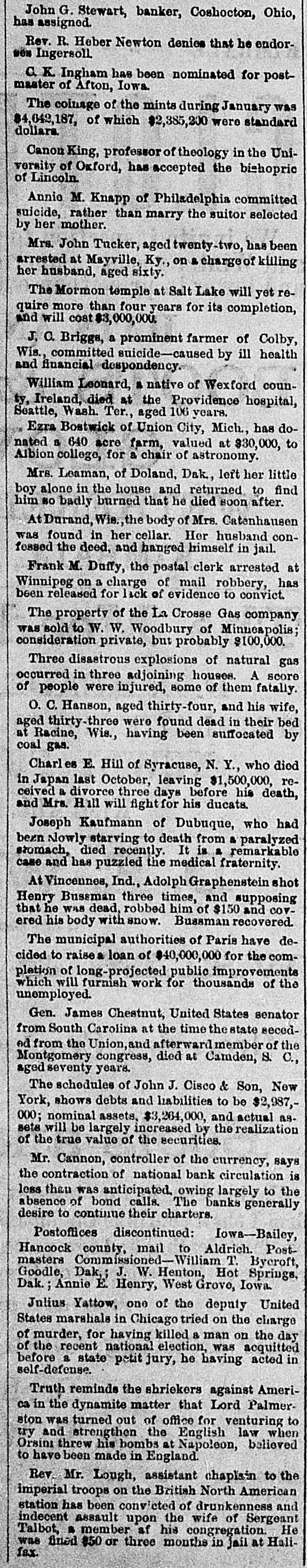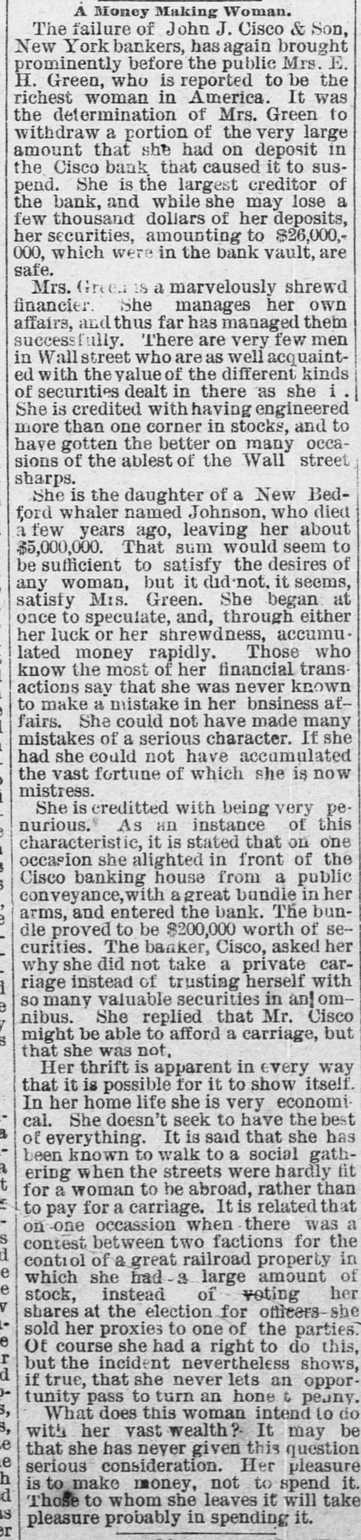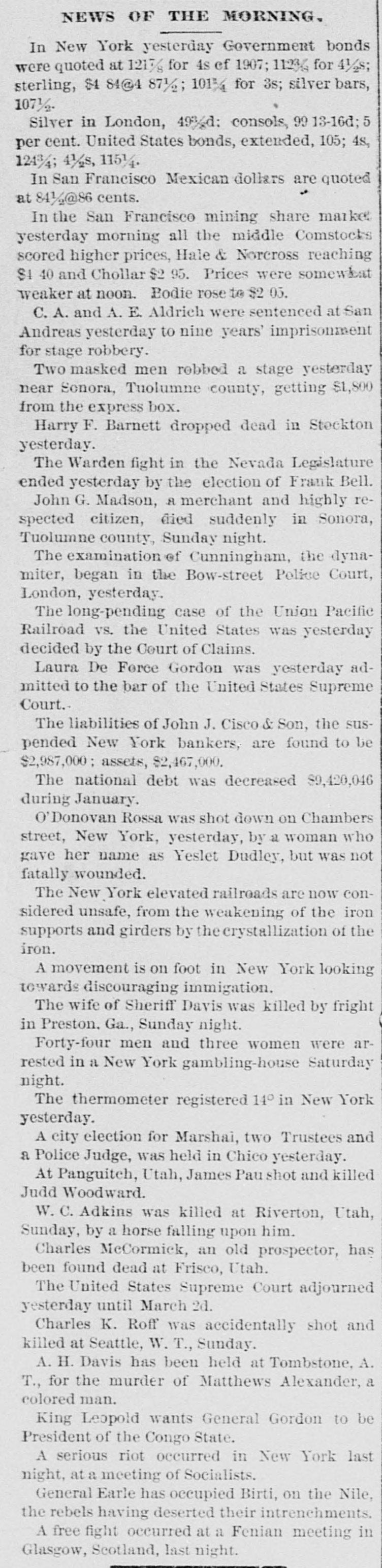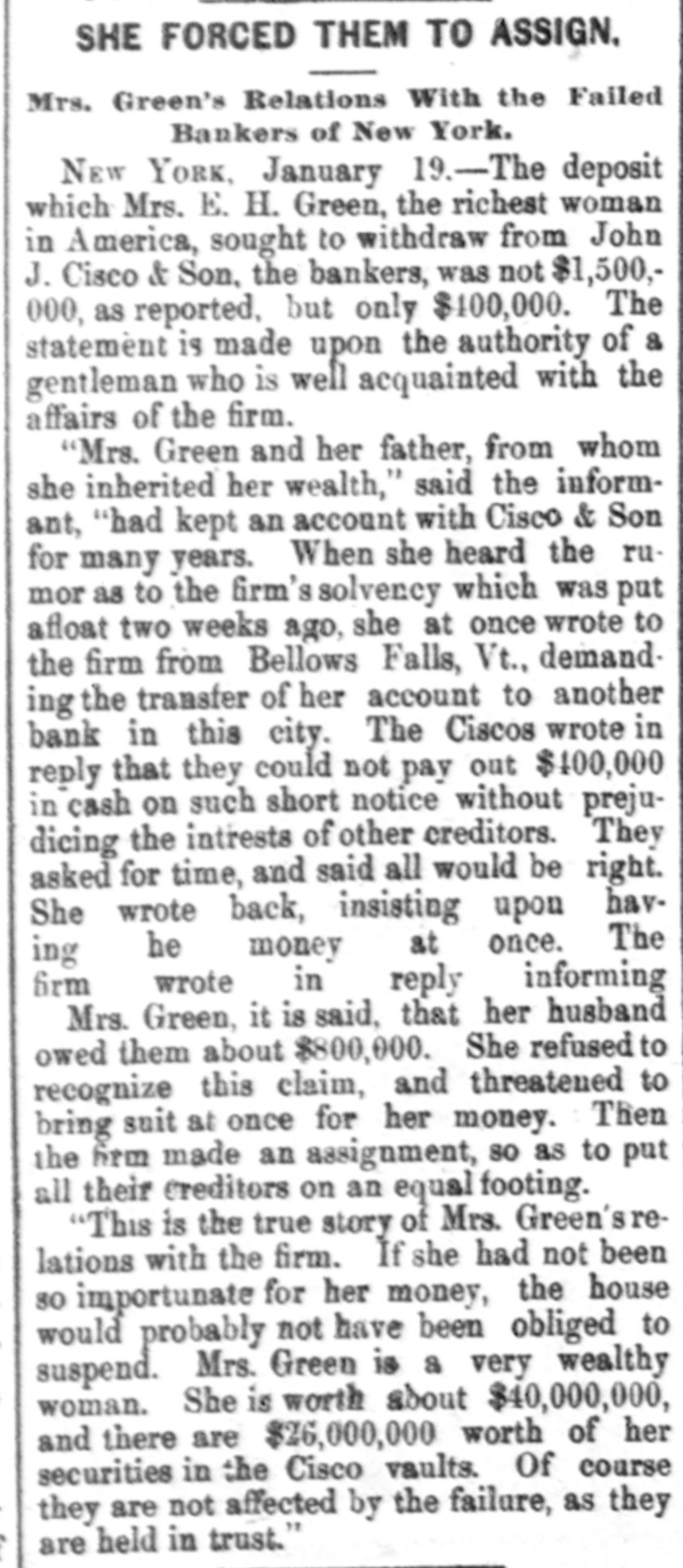HEAVY FAILURE. The Banking Firm of John J. Cisco & Son Makes an Assignment. NEW YORK, Jan. 15. John J. Cisco & Son, bankers, 59 Wall street, filed an assignment this afternoon without preferences, to Lewis May, and Mr. 1 May, when asked for a statement in regard to the suspension, said: "The rumors started ten days since about this house, and which were telegraphed all over this country and Europe, have caused a very severe run upon them by depositors. In addition to this they were largely interested in bonds of the Houston & Texas Central railroad, which have been very greatly depreciated by a severe blow against the credit of that company caused by the action of C.P Huntington in purchasing coupons of first mortgage bonds. All the depositors will undoubtedly be paid in full as soon as the securities can be realized upon. The firm has no outstanding contracts of the stock exchange." May said the firm owed $2,500,000 to the depositors. He could not say who were the largest depositors nor estimate their number. As is generally believed, the matter is rather in the nature of liquidation than failure. This view is strengthened by the knowledge that the firm always has been rich, and also by e fact that no preferences are given. The firm's liabilities are chiefly to the depositors. The present partners are John A. Cisco and F. A. Foote, the former being a member of the stock exchange, but never participating actively in the operations of the exchange. The late John J. Cisco was formerly assistant treasurer of the United States at New York, and during the early stages of the rebellion he rendered valuable assistance to Slocum P Chase, then secretary of the treasury, in securing loans from the city banks. Frederick W. Foote, partner in the banking house of Jno. J. Cisco & Son, was seen tonight at his residence. "There's nothing discreditable in the action of the firm," said Mr. Foote. "The rumors of the last ten days, which have been spread broadcast throughout this country and Evrope in rela tion to our firm have-used me up. No house could stand under the same circumstances. If Mr. Huntington had not defaulted on the Houston & Texas Central coupons on Jan. 1. we might have been all right." C. P. Huntington was seen at his residence, 65 Park avenue. "I don't see why they should connect me with the failure," said Mr. Huntington. "In regard to the coupon business, the whole thing lies in a nutshell. The coupons of the Houston & Texas Central, due Jan. 2st, were bought by the Southern Developement company, of which I am general agent. To go back a little, when we bought the Morgan company's steamboats and railroads, we acquired $49,000 worth of Houston & Texas Central stock. In this way my name was connected with that road. The bonds of that road heve not been paid, and in consequence of the depreciation and shrink age, I suppose Cisco & Son, who are reported to have held considerable stock, have been hampered. I think the road will be all right in time. We purchased about $275,000 worth of coupons at face value, which we had a perfect right to do. That's all I have to say about it,"