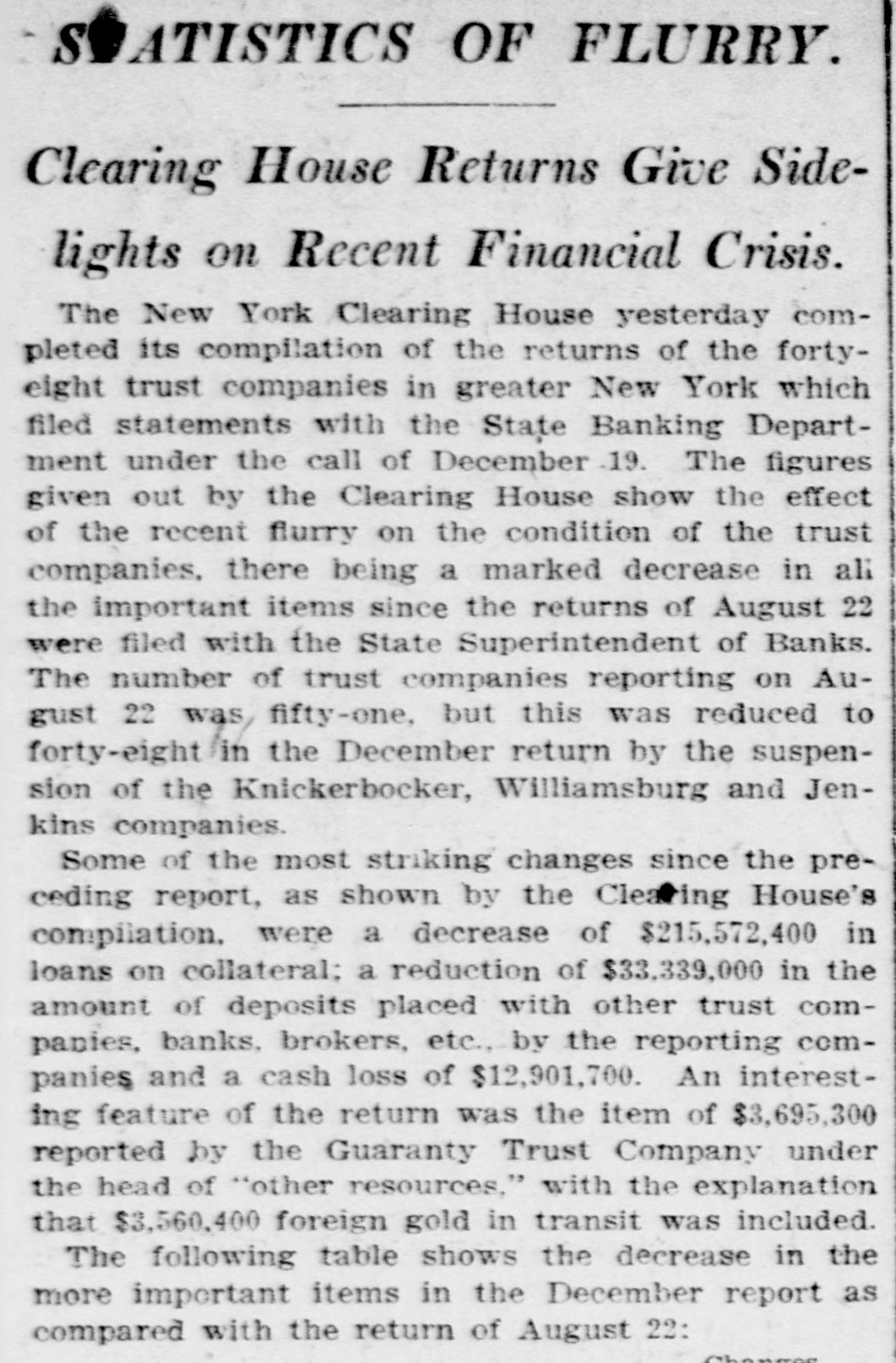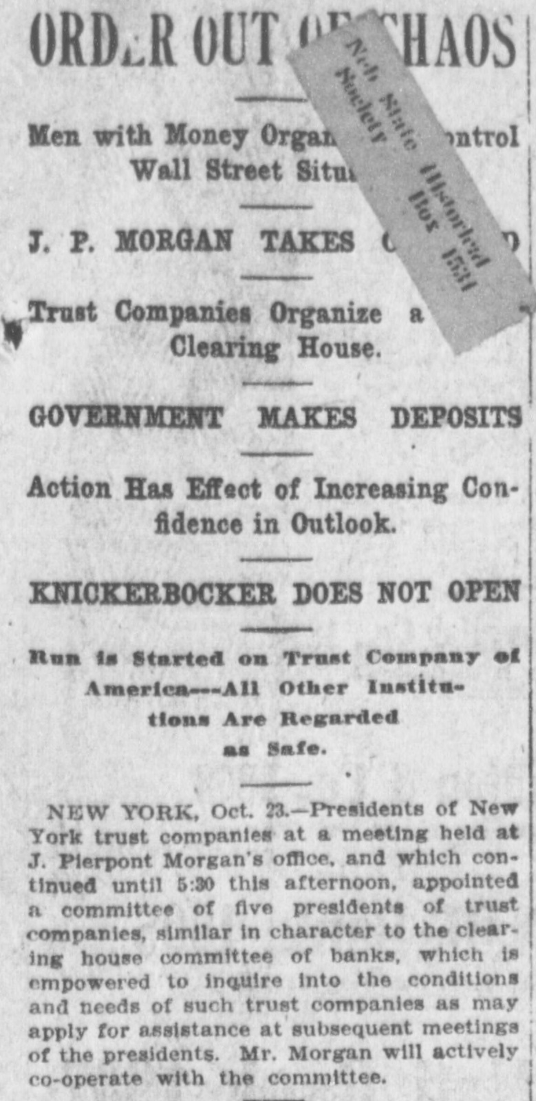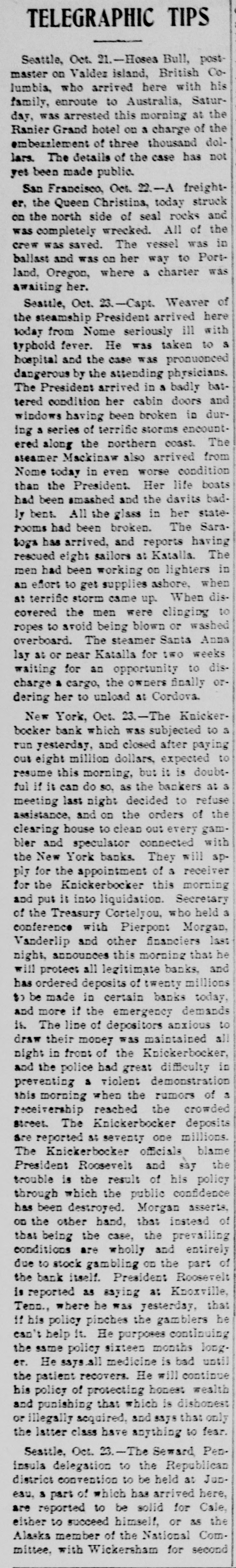 TELEGRAPHIC TIPS Seattle, Oct. 21.-Hoses Bull, postmaster on Valdez island, British Columbia, who arrived here with his family, enroute to Australia, Saturday, was arrested this morning at the Ranier Grand hotel on 3 charge of the emberzlement of three thousand dollars. The details of the case has not yes been made public. San Francisco, Oct. 22-A freighter. the Queen Christina, today struck on the north side of seal rocks and wss completely wrecked. All of the crew was saved. The vessel was in ballast and was on her way to Portland, Oregon, where 3 charter was awaiting her. Seattle, Oct. 23.-Capt. Weaver of the steamship President arrived here today from Nome seriously ill with S typhoid fever. He was taken to hospital and the case was pronuenced dangerous by the attending physicians. The President arrived in s badly battered condition her cabin doors and windows having been broken in during s series of terrific storms encountered along the northern coast. The steamer Mackinaw also arrived from Nome today in even worse condition than the President. Her life boats had been smashed and the davits badby bent. All the glass in her staterooms had been broken. The Saratoga has arrived, and reports having The rescued eight sailors at Katalla. men had been working 00 lighters in an effort to get supplies ashore, when a: terrific storm came up. When discovered the men were clinging to ropes to avoid being blown or washed overboard. The steamer Santa Anna lay at or near Katalla for two weeks waiting for an opportunity to discharge 2 cargo, the owners finally ordering her to unload at Cordova. New York, Oct. 23.-The Knicker3 bocker bank which was subjected to run yesterday, and closed after paying out eight million dollars, expected to resume this morning, but it is doubtful if it C&D do so, as the bankers at last night decided to refuse and on the assistance, meeting orders of the clearing house to clean out every gambier and speculator connected with New York banks. They will spfor the appointment of 3 ply the this morning receiver for the Knickerbocker and put it into liquidation. Secretary of the Treasury Cortelyou, who held conference with Pierpont Morgan, Vanderlip and other financiers last night, announces this morning that he will protect all legitimate banks, and has ordered deposits of twenty millions to be made in certain banks today, and more if the emergency demands is The line of depositors anxious to draw their money was maintained all night in front of the Knickerbocker, and the police had great difficulty in preventing s violent demonstration 3 this morning when the rumors of receivership reached the crowded street. The Knickerbocker deposits are reported a: seventy one millions. The Knickerbocker officials blame President Roosevelt and say the trouble is the result of his policy through which the public confidence has been destroyed. Morgan asserts, of on the other hand, that instead that being the case, the prevailing conditions are wholly and entirely due to stock gambling on the part of the bank itself. President Roosevelt is reported as saying at Knoxville, Tenn., where be was yesterday, that be if his policy pinches the gamblers can't help it. He purposes continuing the same policy sixteen months longer. He 5378.31 medicine is bad until the patient recovers. He will continue his policy of protecting honest wealth and punishing that which is dishonest or illegally acquired, and says that only the latter class have anything to fear. Seattle, Oct. 23.-The Seward Peninsula delegation to the Republican district convention to be held at Juneau, & part of which has arrived here, are reported to be solid for Cale either to succeed himself, or as the Alaska member of the National Com. mittee, with Wickersham for second