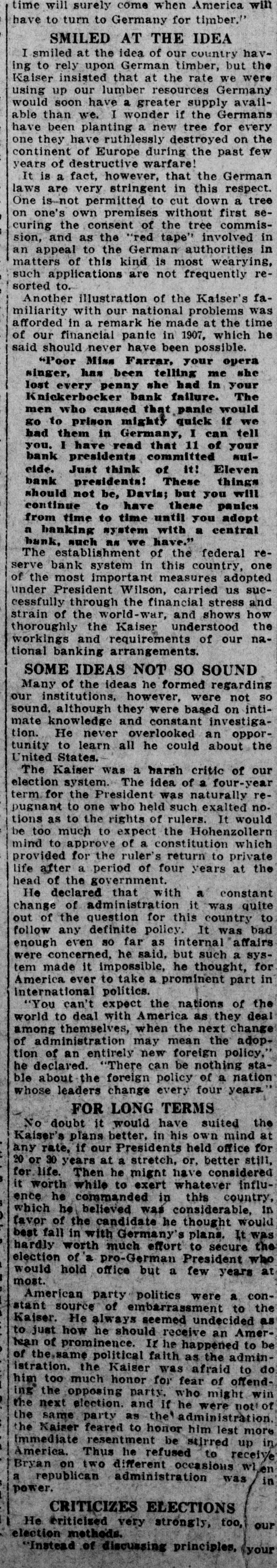 will will surely come when America timber." time have to turn to Germany for SMILED AT THE IDEA at the idea of our country but hav- the I smiled upon German timber, we were ing to rely insisted that at the rate Germany Kaiser our lumber resources supply availusing up have a greater Germans would soon we. I wonder if the for every have able than been planting a new destroyed tree on the one they have of Europe ruthlessly during the past few continent years of destructive fact, however, warfare! that the German respect. It is a stringent in this a tree are not permitted to cut first own premises commislaws One one's is very of the without tree down seon curing and the as consent the "red tape" authorities involved in in sion, to the German wearying, an appeal this kind is most resorted such matters applications of are not frequently fato. illustration of the Kaiser's was Another with our national problems at the time afforded miliarity financial in a remark panic he in made 1907, possible. which he said of our should never Farrar, have been your opera "Poor Miss tellinz me she singer, has been she had in your every penny failure. The Knickerbocker lost bank would caused that panic if we men who prinon mighty quick can tell go to in Germany, I of your had them have read that 11 suiyou. bank I presidents committed it! Eleven Just think of These things cide. presidents: you will bank should not be, Davis; these but panics continue to time have until you adopt from time to with a central banking system have." a such as we the federal rebank, establishment of country, one The bank system in this adopted serve important measures us sucof the President most Wilson, carried stress and under cessfully through the financial and shows how strain of the the world-war, Kaiser understood na- the thoroughly and requirements of our tional workings banking arrangements. IDEAS NOT so SOUND regarding SOME of the ideas he formed were not so Many institutions. however, based on intiour sound. knowledge although they and were constant investiga- opportunity United States. mate tion. He to learn never all overlooked he could an about the of our The Kaiser was The a harsh idea of critic a four-year reelection system. the President was naturally term to one who held It as to the rights of the pugnant for rulers. such Hohenzollern exalted would no. be tions too much to expect of a constitution which a mind to approve ruler's return to private the after provided for period the of four years at head life of declared the government. that with a was constant quite He of Administration it country to change question for this bad out of the policy. It was enough follow any even definite so far as but internal such affairs a sysconcerned, he said, he thought, for America ever to tem were made it impossible, take a prominent part in International can't expect politics. the nations as they of deal the "You deal with America the next change world to themselves, when mean the adopamong administration may foreign policy," tion of an can be nothing foreign policy of he declared. entirely "There new of a years nation stable whose about leaders the change every four FOR LONG TERMS the suited No doubt it better. would in have his held own office mind for at Kaiser's plans Presidents better still, any 20 or rate, 30 years if our at a stretch, have or, considered for life. Then exert whatever ence it worth he he while commanded believed he to might was in considerable, thought this country, would influ- in favor which of the with candidate Germany's he plans. It was the best fall worth in much effort President to secure who would hardly of a pro-German years at election hold office but a few conmost. party politics were a to the American of embarrassment as stant source He always seemed undecided an AmerKaiser. how he should receive to be to just prominence. If he happened the adminlean of same political faith as to do of the the Kaiser was afraid of offendmuch honor for fear too party. who him istration, opposing might not' win of as ing the next the election. and the if he administration. were the same party feared to honor him lest up more in the Kaiser resentment be stirred receive immediate Thus he refused to wl.en a America. two different occasions was in power. Bryan republican on administration CRITICIZES ELECTIONS our He criticised very strongly, too, election Instead methods. of discussing principles, your