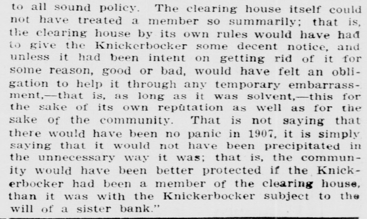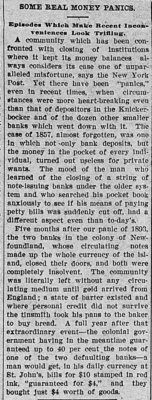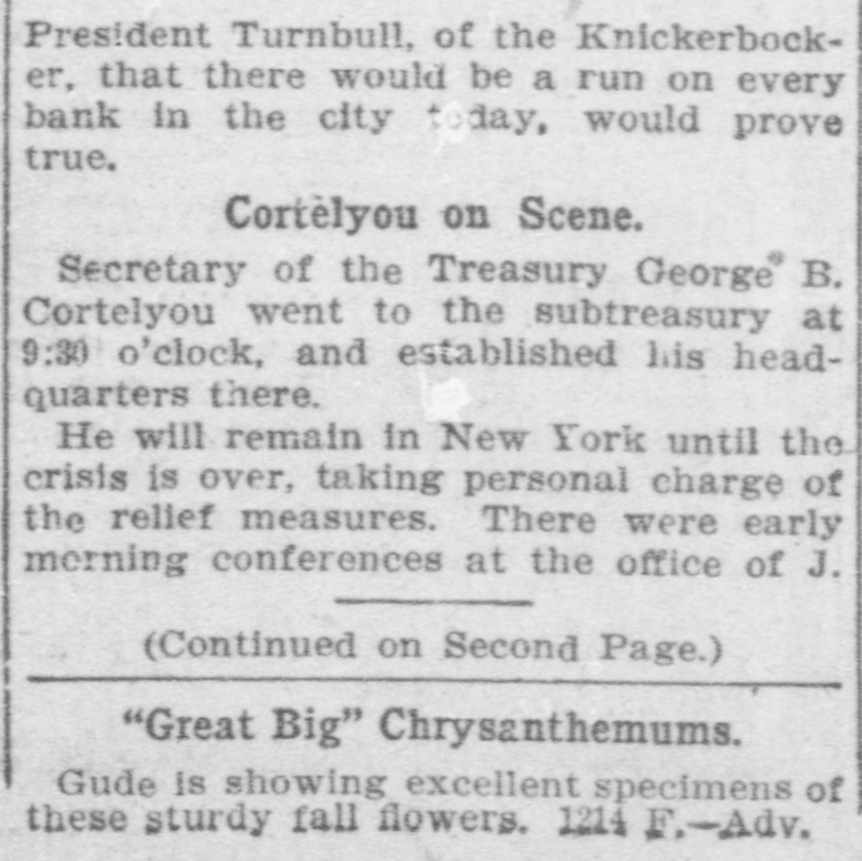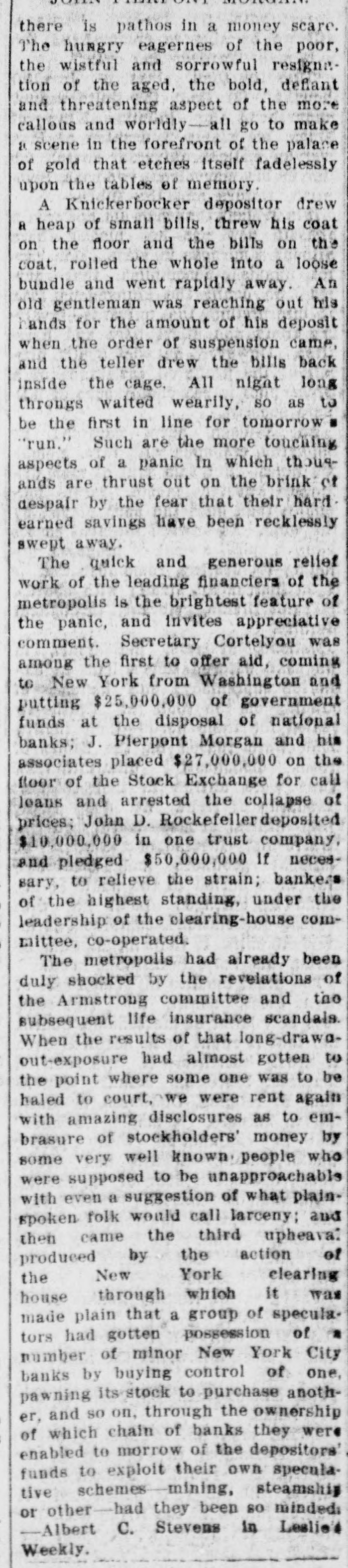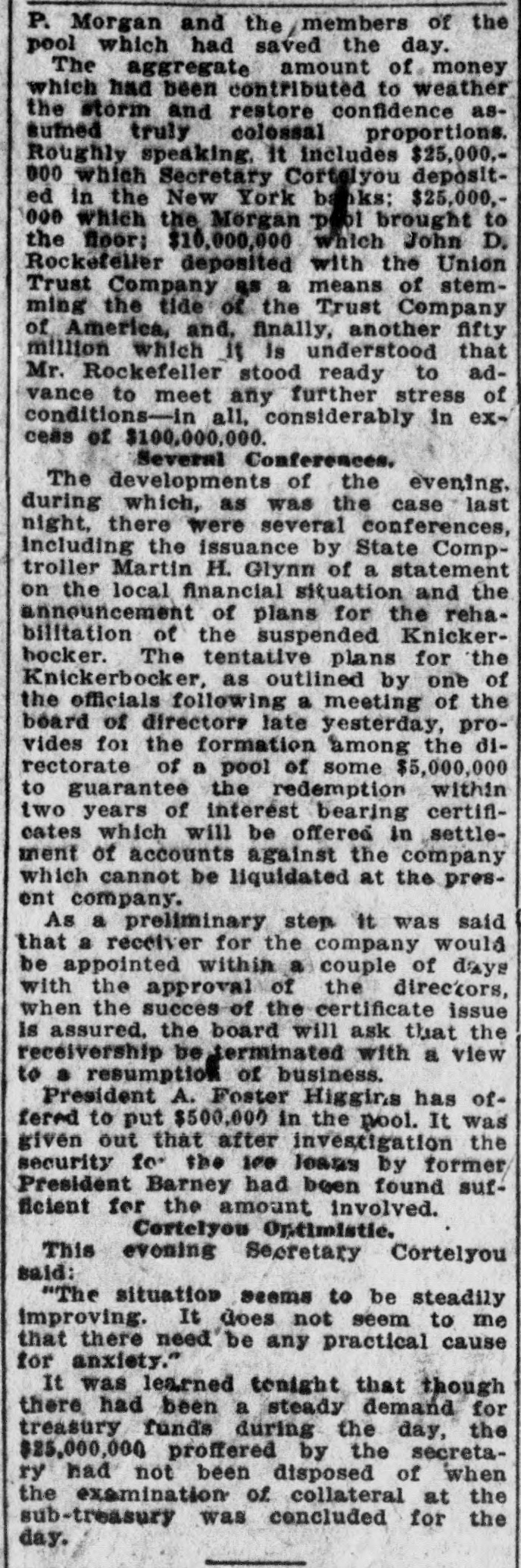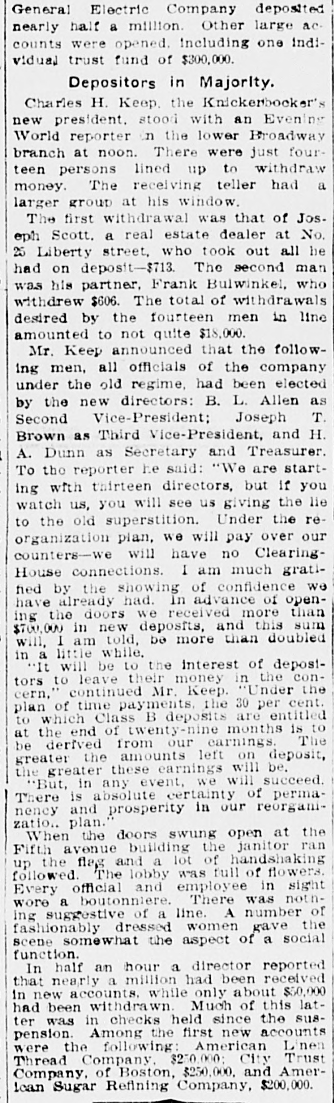 General Electric Company deposited nearly half a million. Other large accounts were opened. including one individual trust fund of $300,000. Depositors in Majority. Charles H. Keep. the Knickerbocker's new president. stood with an Evening World reporter in the lower Broadway branch at noon. There were just fourteen persons lined up to withdraw money. The receiving teller had a larger group at his window. The first withdrawal was that of Jos. eph Scott. a real estate dealer at No. 25 Liberty street, who took out all he had on deposit-$713. The second man was his partner, Frank Bulwinkel, who withdrew $606. The total of withdrawals desired by the fourteen men in line amounted to not quite $18,000. Mr. Keep announced that the following men, all officials of the company under the old regime, had been elected by the new directors: B. L. Allen as Second Vice-President; Joseph T. Brown as Third Vice-President, and H. A. Dunn as Secretary and Treasurer. To the reporter he said: "We are starting with thirteen directors, but if you watch us, you will see us giving the lie to the old superstition. Under the reorganization plan, we will pay over our counters-we will have no ClearingHouse connections. I am much gratified by the showing of confidence we have already had. In advance of opening the doors we received more than $700,000 in new deposits, and this sum will, I am told, be more than doubled in a little while. "It will be to the interest of deposttors to leave their money in the concern," continued Mr. Keep. "Under the plan of time payments, the 30 per cent. to which Class B deposits are entitled at the end of twenty-nine months is to be derived from our earnings. The greater the amounts left on deposit, the greater these earnings will be. "But, in any event, we will succeed. There is absolute certainty of permanency and prosperity in our reorganization. plan." When the doors swung open at the Fifth avenue building the janitor ran up the flag and a lot of handshaking followed. The lobby was full of flowers. Every official and employee in sight wore a boutonniere. There was nothing suggestive of a line. A number of fashionably dressed women gave the scene somewhat the aspect of a social function. In half an hour a director reported that nearly a million had been received in new accounts. while only about $50,000 had been withdrawn. Much of this latter was in checks held since the suspension. Among the first new accounts were the following: American Linen Thread Company. $250.000: City Trust Company, of Boston, $250,000. and Amerloan Sugar Refining Company, $200,000.