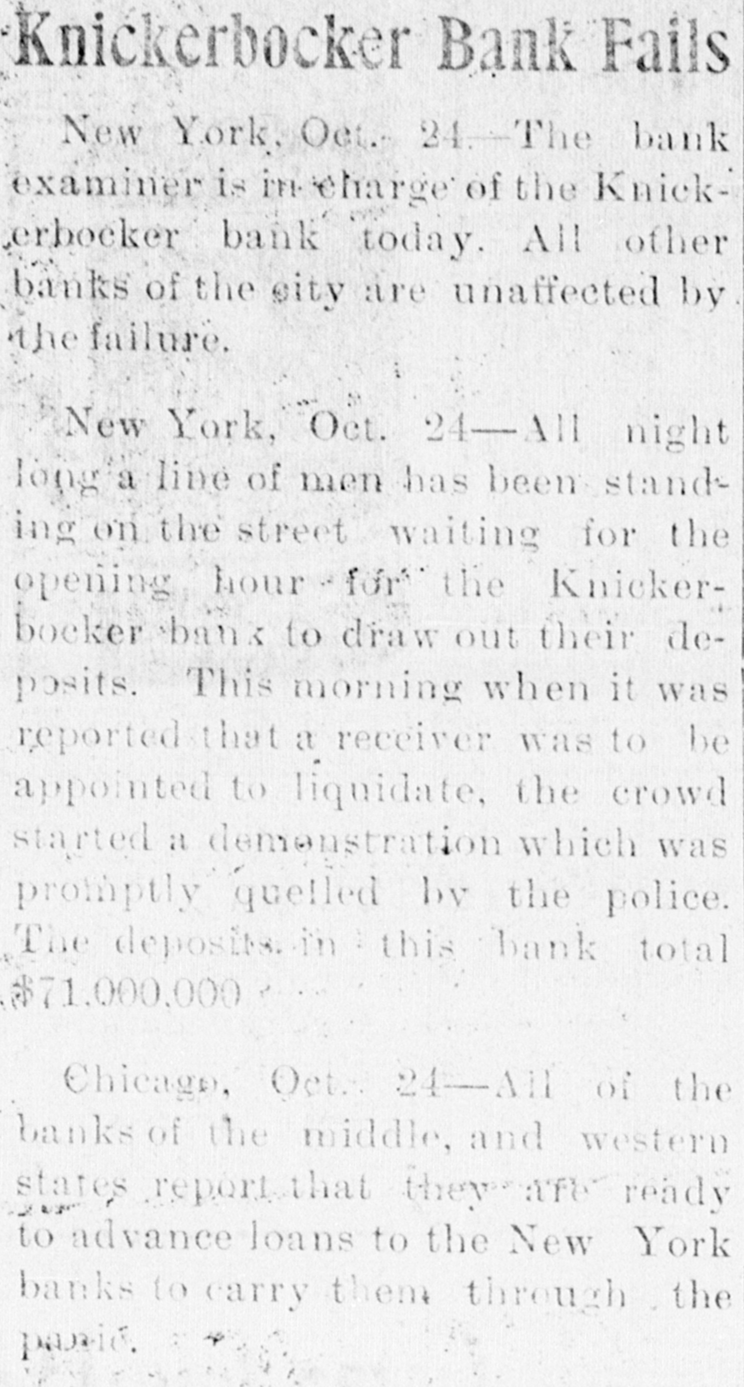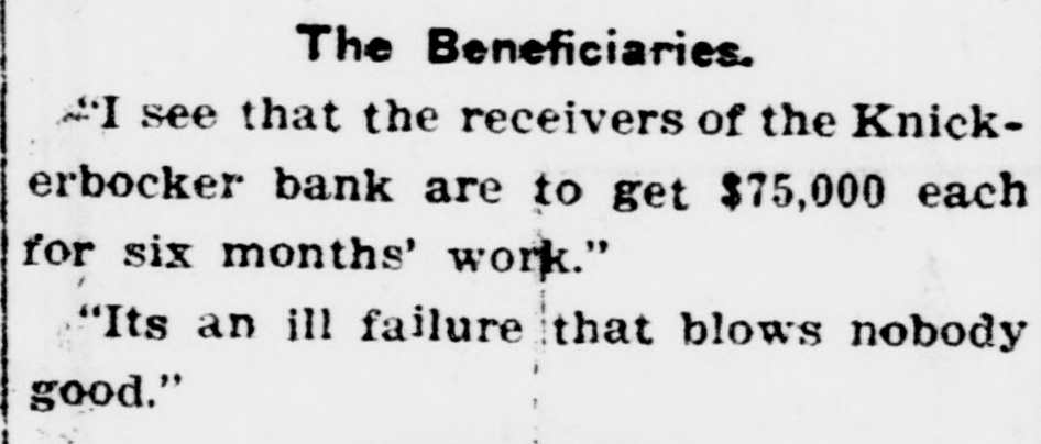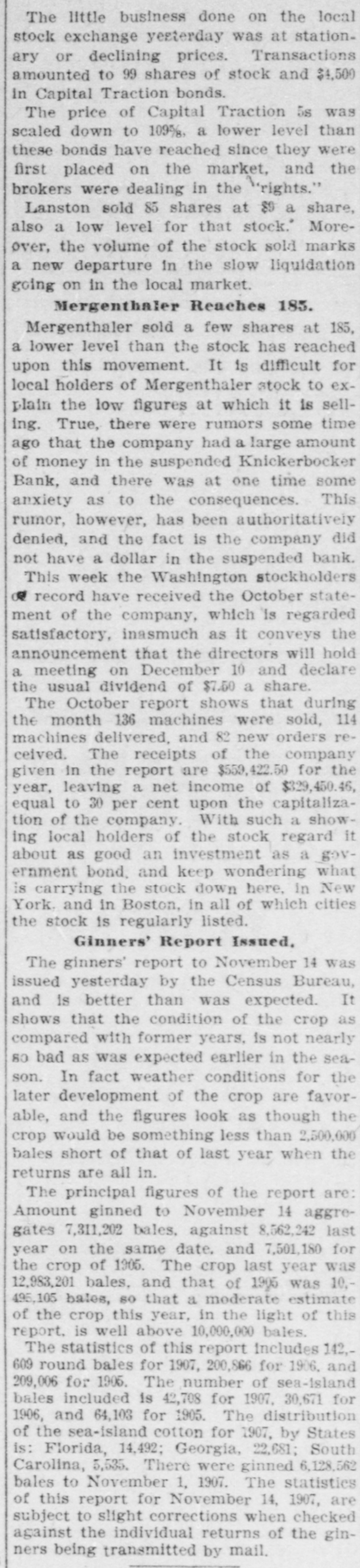 Mergenthaler sold a few shares at 185, a lower level than the stock has reached upon this movement. It is difficult for local holders of Mergenthaler stock to explain the low figures at which it is selling. True, there were rumors some time ago that the company had a large amount of money in the suspended Knickerbocker Bank, and there was at one time some anxiety as to the consequences. This rumor, however, has been authoritatively denied, and the fact is the company did not have a dollar in the suspended bank.