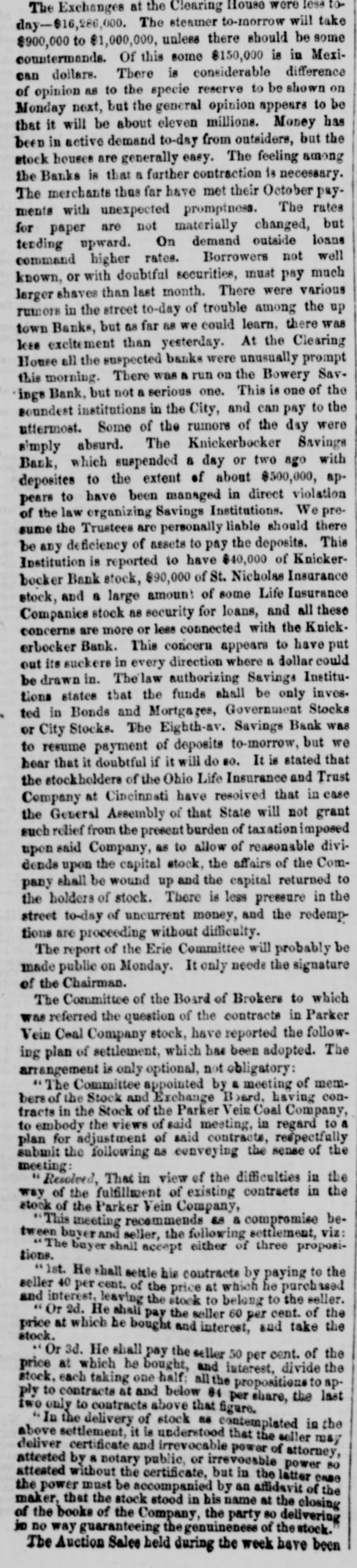 The Exchanges at the Clearing House were less today-$16,286,000. The steamer to-morrow will take $900,000 to $1,000,000, unless there should be some countermands. Of this some $150,000 is in Mexican dollars. There is considerable difference of opinion as to the specie reserve to be shown on Monday next, but the general opinion appears to be that it will be about eleven millions. Money has been in active demand to-day from outsiders, but the stock houses are generally easy. The feeling among the Banks is that a further contraction is necessary. The merchants thus far have met their October payments with unexpected promptness. The rates for paper are not materially changed, but tending upward. On demand outside loans command higher rates. Borrowers not well known, or with doubtful securities, must pay much larger shaves than last month. There were various rumors in the street to-day of trouble among the up town Banks, but as far as we could learn, there was less excitement than yesterday. At the Clearing House all the suspected banks were unusually prompt this morning. There was a run on the Bowery Savings Bank, but not a serious one. This is one of the soundest institutions in the City, and can pay to the uttermost. Some of the rumors of the day were simply absurd. The Knickerbocker Savings Bank, which suspended a day or two ago with deposites to the extent of about $500,000, appears to have been managed in direct violation of the law organizing Savings Institutions. We presume the Trustees are personally liable should there be any deficiency of assets to pay the deposits. This Institution is reported to have $40,000 of Knickerbocker Bank stock, $90,000 of St. Nicholas Insurance stock, and a large amount of some Life Insurance Companies stock as security for loans, and all these concerns are more or less connected with the Knickerbocker Bank. This concern appears to have put out its suckers in every direction where a dollar could be drawn in. Thelaw authorizing Savings Institutions states that the funds shall be only inves. ted in Bonds and Mortgages, Government Stocks or City Stocks. The Eighth-av. Savings Bank was to resume payment of deposits to-morrow, but we hear that it doubtful if it will do so. It is stated that the stockholders of the Ohio Life Insurance and Trust Company at Cincinnati have resolved that in case the General Assembly of that State will not grant such relief from the present burden of taxation imposed upon said Company, as to allow of reasonable dividends upon the capital stock, the affairs of the Company shall be wound up and the capital returned to the holders of stock. There is less pressure in the street to-day of uncurrent money, and the redemptions are proceeding without difficulty. The report of the Erie Committee will probably be made public on Monday. It only needs the signature of the Chairman. The Committee of the Board of Brokers to which was referred the question of the contracts in Parker Vein Ceal Company stock, have reported the following plan of settlement, which has been adopted. The arrangement is only optional, not obligatory: The Committee appointed by & meeting of members of the Stock and Exchange Board, having contracts in the Stock of the Parker Vein Coal Company, to embody the views of said meeting, in regard to a plan for adjustment of said contracts, respectfully submit the following as conveying the sense of the meeting: Resolved, That in view of the difficulties in the way of the fulfillment of existing contracts in the stock of the Parker Vein Company, This meeting recommends as a compromise between buyer and seller, the following settlement, viz: The buyer shall accept either of three propositions. 1st. He shall settle his contracts by paying to the seller 40 per cent. of the price at which he purchased and interest, leaving the stock to belong to the seller. Or 2d. He shall pay the seller 60 per cent. of the stock. price at which he bought and interest, and take the Or 3d. He shall pay the seller 50 per cent. of the price at which be bought, and interest, divide the stock, each taking one half; all the propositions to apply to contracts at and below 84 per share, the last two only to contracts above that figure. In the delivery of stock as contemplated in the above settlement, it is understood that the seller may deliver certificate and irrevocable power of attorney, attested by & notary public, or irrevocable power 80 attested without the certificate, but in the latter case the power must be accompanied by an affidavit of the maker, that the stock stood in his name at the closing of the books of the Company, the party so delivering in no way guaranteeing the genuineness of the stock. The Auction Sales held during the week have been