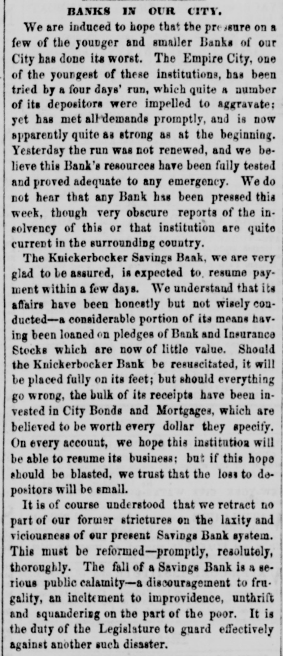 BANKS IN OUR CITY. We are induced to hope that the pressure on a few of the younger and smaller Banks of our City has done its worst. The Empire City, one of the youngest of these institutions, has been tried by a four days' run, which quite a number of its depositors were impelled to aggravate; yet has met all demands promptly, and is now apparently quite as strong as at the beginning. Yesterday the run was not renewed, and we believe this Bank's resources have been fully tested and proved adequate to any emergency. We do not hear that any Bank has been pressed this week, though very obscure reports of the insolvency of this or that institution are quite current in the surrounding country. The Knickerbocker Savings Bank, we are very glad to be assured, is expected to. resume payment within a few days. We understand that its affairs have been honestly but not wisely conducted-a considerable portion of its means having been loaned on pledges of Bank and Insurance Stocks which are now of little value. Should the Knickerbocker Bank be resuscitated, it will be placed fully on its feet; but should everything go wrong, the bulk of its receipts have been invested in City Bonds and Mortgages, which are believed to be worth every dollar they specify. On every account, we hope this institution will be able to resume its business; but if this hope should be blasted, we trust that the loss to depositors will be small. It is of course understood that we retract no part of our former strictures on the laxity and viciousness of our present Savings Bank system. This must be reformed-promptly, resolutely, thoroughly. The fall of a Savings Bank is a serious public calamity-a discouragement to frugality, an incitement to improvidence, unthrift and squandering on the part of the poor. It is the duty of the Legislature to guard effectively against another such disaster.
