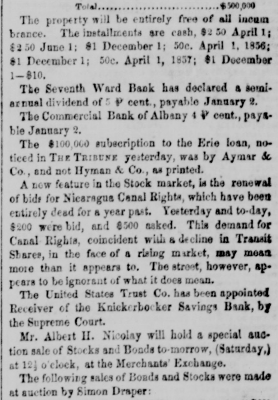 Total $500,000 The property will be entirely free of all incum brance. The installments are cash, $2.50 April 1; $2.50 June 1; 81 December 1; 50c. April 1, 1856; $1 December 1; 50c. April 1, 1857; BL December 1-$10. The Seventh Ward Bank has declared a semiarnual dividend of 5 P cent., payable January 2. The Commercial Bank of Albany 4 P cent., paysble January 2. The $100,000 subscription to the Erie loan, noticed in THE TRIBUNE yesterday, was by Aymar & Co., and not Hyman & Co., as printed. A now feature in the Stock market, is the renewal of bids for Nicaragua Canal Rights, which have been entirely dead for 8 year past. Yesterday and to-day, $200 were bid, and $500 asked. This demand for Canal Rights, coincident with & decline in Transit Shares, in the face of a rising market, may mean more than it appears to. The street, however, appears to be ignorant of what it does mean. The United States Trust Co. has been appointed Receiver of the Knickerbocker Savings Bank, by the Supreme Court. Mr. Albert H. Nicolay will hold a special auction sale of Stocks and Bonds to-morrow, (Saturday,) at 12} o'clock, at the Merchants' Exchange. The following sales of Bonds and Stocks were made at auction by Simon Draper:
