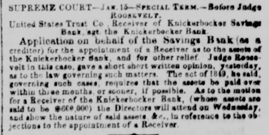 SUPREME COURT-JAN. 15-SPECIAL Judge ROOSEVELT. United States Trust Co, Receiver of Knickerbocker Savings Bank, agt. the Knickerbecker Bank. Application on behalf of the Savings Bank (as a creditor) for the appointment of a Receiver as to the assets of the Knickerbocker Bank, and for other relief. Judge Reaseveit in this case, gave a short short written opinion, yesterday, as to the law governing such matters. The act of 1849, he said, governing such cases, requires that the assets be paid over within three months, or sconer, if possible. As to the motion for a Receiver of the Knickerbocker Bank, (whose assets are said to be $600,000) the Directors will attend on Wednesday, and show the nature of said assets. &e., in reference to the 00jections to the appointment of a Receiver.