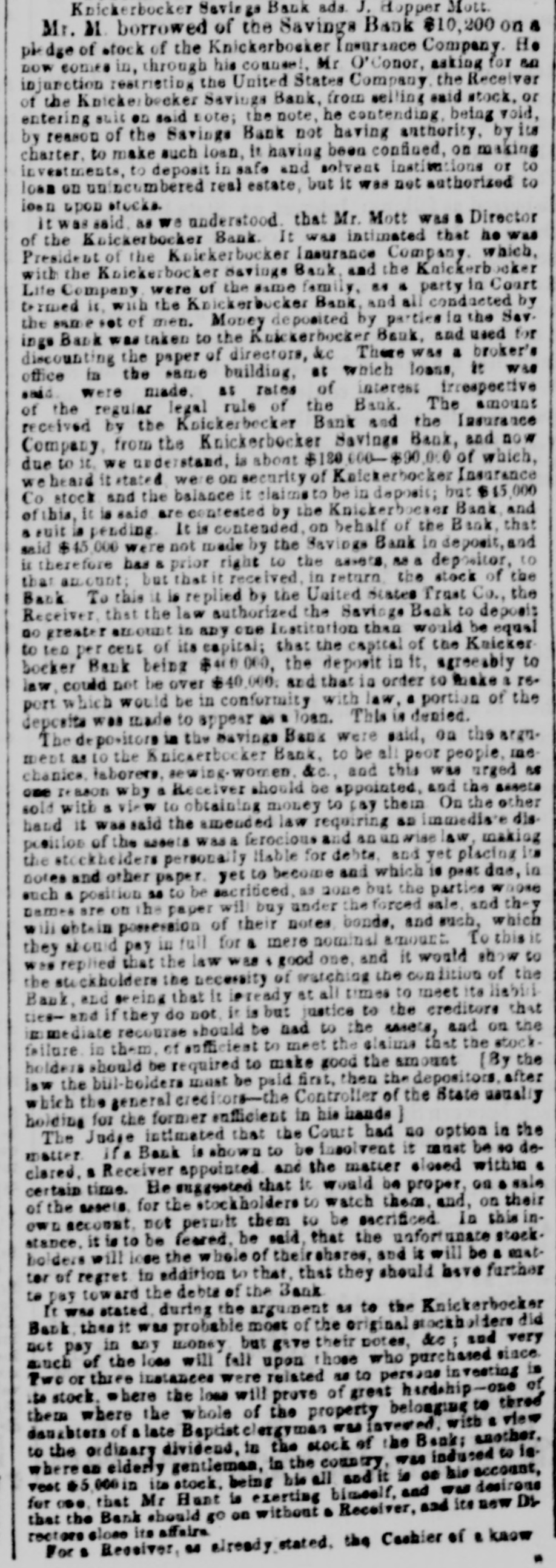 Knickerbocker Sevings Bank ada. J. Hopper Mott. Mr. M. borrowed of the Savings Bank $10,200 on a pledge of stock of the Knickerbocker Insurance Company. He DOW somes in, through his counse!, Mr O'Conor, asking for & injurction restricting the United States Company. the Receiver of the Knickerbecker Savings Bank, from welling said stock, or entering suit on said note; the note, he contending, being void, by reason of the Savings Bank not having authority, by its charter, to make such loan, it having been confined, on making investments, to deposit in safe and solvent institutions or to loan on unincumbered real estate, but it was net authorized to loan upon stocks. it was said, as we understood. that Mr. Mott was a Director of the Knickerbocker Bank. It was intimated that he was President of the Knickerbocker Insurance Company. which, with the Knickerbocker Savings Bank, and the Knickerb ocker Life Company were of the same family, 84 . party In Court termed it, with the Knickerbocker Bank, and all conducted by the same set of men. Money deposited by parties la the Sev. ings Bank was taken to the Knickerbocker Bank, and used for discounting the paper of directors, dec There was a broker's office in the same building, at which loass, It was said. were made, as rates of interest irrespective of the regular legal rule of the Bank. The amount received by the Knickerbecker Bank and the Insurance Company, from the Knickerbocker Savings Bank, and now due to it, we understand, is about 180,000-$90,000 of which, we heard it stated were on security of Knickerbocker Insurance Co stock and the balance it claims to be in deposit; but $15,000 of this, It is said are contested by the Knickerboeser Bank, and a suit is pending. It is contended, on behalf of the Bank, that said $45,000 were not made by the Savings Bank in deposit, and is therefore has & prior right to the assets, as a depositor, to that amount; but that it received, in return. the stock of the Bank To this it is replied by the United States Trust Co., the Receiver, that the law authorized the Savings Bank to deposit no greater amount in any one Institution than would be equal to teo per cent of its capital; that the capital of the Knicker bocker Bank being the deposit in It, agreeably to law, could not be over $40,000; and that is order to Make a re. port which would be in conformity with law, a portion of the deposits was made to appear as . loan. This is denied. The depositors in the savings Bank were said, on the argnment as to the Knickerbocker Bank, to be all poor people, mechanics. laborers, sewing.women, &c., and this was urged as one reason why a Receiver should be appointed, and the assets sold with a view to obtaining money to pay them On the other hand it was said the amended law requiring an immedia'e disposition of the assets was a ferocious and an an wise law, making the stockholders personally liable for debts, and yet placing its notes and other paper. yet to become and which is past due, in such a position as to be sacriticed, as none but the parties whose names are on the paper will buy under the forced sale, and they will obtain possession of their notes, bonds, and such, which they sbould pay in full for a mere nominal amount. To this it was replied that the law was $ good one, and it would show to the stockholders the necessity of watching the condition of the Bank, and seeing that It ioready at all times to meet its liabidties- and if they do not, it is but justice to the creditors that immediate recourse should be had to the assets, and on the failure. in them. of sufficiest to meet the claims that the stock. holders should be required to make good the amount [By the law the bill-bolders must be paid first, then the depositors, after which the general creditors-the Controller of the State usually holding for the former enfficient in his hands] The Judge intimated that the Court had no option in the matter. ifa Bank is shown to be insolvent it must be so declared, a Receiver appointed and the matter slosed within & certain time. Be suggested that It would be proper, on a sale of the for the stockholders to watch them. and, on their own account, not permit them to be sacrificed. In this instance, it is to be feared, be said, that the unfortunate stockholders will lose the whole of theirahares, and it will be a matter of regret to addition to that, that they should have further to pay toward the debta of the Bank It was stated, during the argument as to the Knickerbocker Bank, thes it was probable most of the original stockholders did not pay in any money but give their notes, &e and very much of the loss will fall upon those who purchased since. 7wc or three instances were related as to persons investing is its stock. where the loss will prove of great herdship-one of them where the whole of the property belonging to thred denabters of a late Beptist clergyman was invested. with a view to the ordinary dividend, in the stock of the Bank: another, is. wherean elderly gentleman, in the country, was induced to $5,000 in its stock, being bis all and it is on his account, desirous vest that Mr Hunt is exerting bimself, and ww Dr for that use, the Bank should 50 on without . Receiver, and its new rections close its affaire. For s Receiver, as already stated, the Cashier of a know