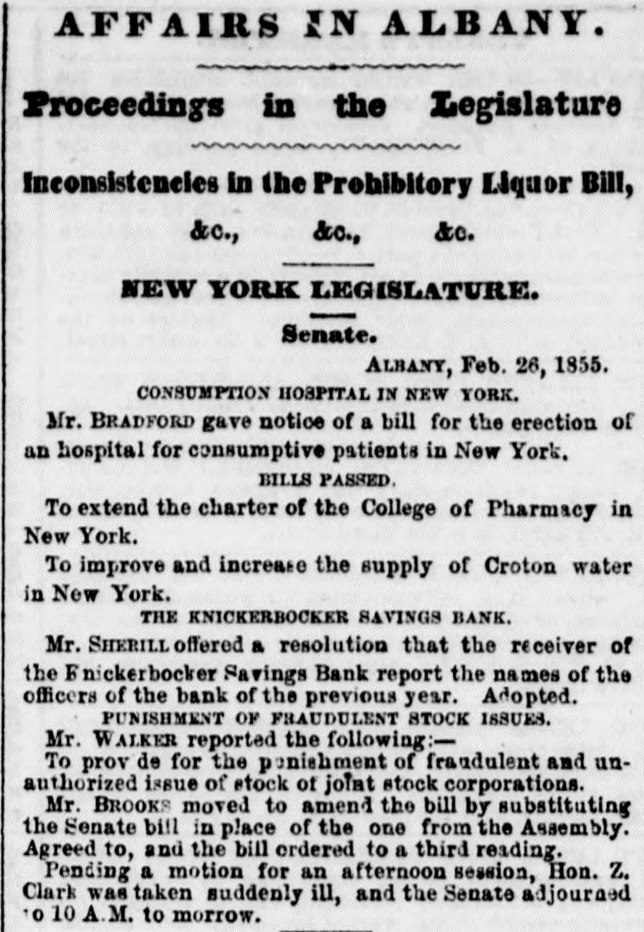 AFFAIRS IN ALBANY. Proceedings in the Legislature Inconsistencies in the Prohibitory Liquor Bill, &c. &c., &c., NEW YORK LEGISLATURE. Senate. Albany, Feb. 26, 1855. CONSUMPTION HOSPITAL IN NEW YORK. Mr. BRADFORD gave notice of a bill for the erection of an hospital for consumptive patients in New York. BILLS PASSED. To extend the charter of the College of Pharmacy in New York. To improve and increase the supply of Croton water in New York. THE KNICKERBOCKER SAVINGS BANK. Mr. SHERILL offered a resolution that the receiver of the Enickerbocker Savings Bank report the names of the officers of the bank of the previous year. Adopted. PUNISHMENT OF FRAUDULENT STOCK ISSUES. Mr. WALKER reported the following:To prov de for the ponishment of fraudulent and unauthorized issue of stock of joint stock corporations. Mr. BROOKS moved to amend the bill by substituting the Senate bill in place of the one from the Assembly. Agreed to, and the bill ordered to a third reading. Pending a motion for an afternoon session, Hon. Z. Clark was taken suddenly ill, and the Senate adjouraed 10 10 A.M. to morrow.