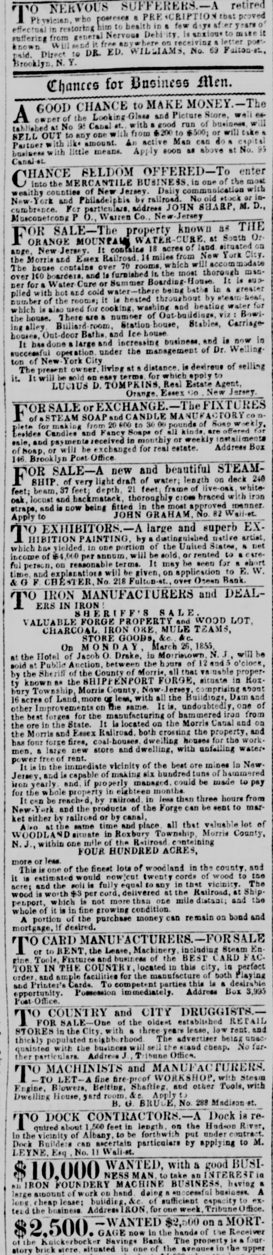 TO NERVOUS SUFFERERS.-A retired Physician, who posreses & PRESCRIPTION that proved effectual in restoring him to health in a few days after years of suffering from general Nervous Debivity, is anxious to mare it known. Will send it free anywhere on receiving a letter post paid. Direct to DR. ED. WILLIAMS, No. 69 Fulton-st., Brooklyn, N. Y. # Chances for Business Men. A GOOD CHANCE to MAKE MONEY.-The owner of the Looking-Glass and Picture Store, weli es- tablished at No 95 Canal st., with a good run of business, will SELL OUT to any one with from $200 to $500; or will take a Partner with like amount. An active Man can dos capital business with little means. Apply soon as above at No. 95 Canal-st. CHANCE SELDOM OFFERED-To enter into the MERCANTILE BUSINESS, in one of the most wealthy counties of New Jersey. Daily communication with New-York and Philadelphis by railroad. No oid stock or in- cumbrance. For particulars, address JOHN SHARP, M. D., Musconetcong P. O., Warren Co., New-Jersey FOR SALE-The property known as THE ORANGE MOUNTAIN WATER-CURE, at South Or- ange, New Jersey. It containe 18 acres of land, situated on the Morris and Essex Railroad, 14 miles from New York City. The beuse contains over 70 rooms, which will accommodate over 100 boardera, and is furnished in the most thorough man- ner for a Water Cure or Summer Boarding-House. It is sup- plied with hot and cold water-there being batos in a greater number of the rooms; it is heated throughout by steam-heat, which is also used for cooking, washing and heating water for the house. There are a number of Out-buildings, viz: Bowi- ing alley, Buliard-room, Station-house, Stables, Carriage- houses, Out-door Baths, and Ice house. It has done a large and increasing business, and is now in successful operation, under the management of Dr. Welling- ton of New-York City The present owner, living at a distance, is desirous of selling it. It will be sold on easy terme, for which apply to LUCIUS D. TOMPKINS, Real Estate Agent, Orange. Essex Co. New Jersey. FOR SALE or EXCHANGE. -The FIXTURES of & STEAM SOAP and CANDLE MANUFACTORY con- plete for making from 20 600 to 3000 pounds of Soap weekly, besides Candles and Fancy Soaps of all kinds, are offered for sale, and paymente received in monthly or weekly instaliments of soap, or will be exchanged for real estate. Address Box 146. Brooklyn Post Office. FOR SALE-A new and beautiful STEAM- SHIP, of very light draft of water; length on deck 240 feet; beam, 37 feet; depth, 21 feet, frame of live-oak, white- oak, locust and hackmatack, thoroughly cross braced with iron straps, and is now being fitted in the most approved manner. Apply to JOHN GRAHAM, No. 82 Wall-et. TO EXHIBITORS.-A large and superb EX- HIBITION PAINTING, by a distinguished native artist, which bas yielded, in one portion of the United States, a net income of $4,000 per annum, will be sold, or rented to a care- ful person, on reasonable terms. It may be seen for a short time, and explanations will be given, on application to E. W. & G F. CHESTER, No. 218 Fulton-st., over Ocean Bank. TO IRON MANUFACTURERS and DEAL- ERS IN IRON! SHERIFF'S SALE. VALUABLE FORGE PROPERTY and WOOD LOT, CHARCOAL, IRON ORE, MULE TEAMS, STORE GOODS, &c. &c. On MONDAY, March 26, 1855, at the Hotel of Jacob O. Drake, in Morristown, N. J., will be sold at Public Auction, between the hours of 12 and 5 o'clock, by the Sheriff of the County of Morris, all that varuable proper ty known as the SHIPFENPORT FORGE, situate in Kox- bury Township, Morris County, New Jersey, comprising about 16 acres of Land, more of less, with all the Buildings, Dam and other Improvements on the same. It is, undoubtedly, one of the best forges for the manufacturing of hammered iron from the ore in the State. It is located on the Morris Canal and on the Morris and Essex Railroad, both crossing the property, and has four forge fires, coal-houses, dwelling houses for the work- men, a large new store and dwelling, with unfailing water power free of rent. It is in the immediate vicinity of the best ore mines in New- Jersey, and is capable of making six hundred tuns of hammered iron yearly, and, if properly managed, could be made to pay for the whole property in eighteen months. It can be reached, by railroad, in less than three hours from New-York, and the products of the Forge can be sent to mar- ket either by railroad or by canal, Alro at the same time and place, all that valuable lot of WOODLAND situate in Roxbury Township, Morris County, N. J., within one mile of the Retiroad. containing FOUR HUNDRED ACRES, more or less. This is one of the finest lots of woodland in the county, and it is estimated would now cut twenty cords of wood to the acre; and the soil is fully equal to any in that vicinity. The wood is worth $3 per cord, delivered at the Railroad, at Ship- penport, which is not more than one mile distant; and the whole of it is in fine growing condition. A portion of the purchase money can remain on bond and mortgage, if desired. TO CARD MANUFACTURERS.-FOR SALE or to RENT, the Lease, Machinery, including Steam En- gine, Toole, Fixtures and business of the BEST CARD FAC- TORY IN THE COUNTRY, located in this city, in perfect order, and ample facilities for the manufacture of both Playing and Printer's Cards. To competent parties this is a desirable opportunity. Possession immediately. Address Box 3,995 Post-Office. TO COUNTRY and CITY DRUGGISTS.- FOR SALE-One of the oldest established RETAIL STORES in the City, with a three-years lease, low rent, and thickly populated neighborhood. The advertiser being unac quainted with the business will sell the stand cheap. No far- ther particulars. Address J., Tribune Office. TO MACHINISTS and MANUFACTURERS. -TO LET-A fine fire-proof WORKSHOP, with Steam Engine, Blowers, Belting, Shaftieg, and other Tools, with Dwelling House, sard room, &c. Apply to B. G. BRUCE, No. 288 Madison-st. TO DOCK CONTRACTORS.-A Dock is re- quired about 1,500 feet in len