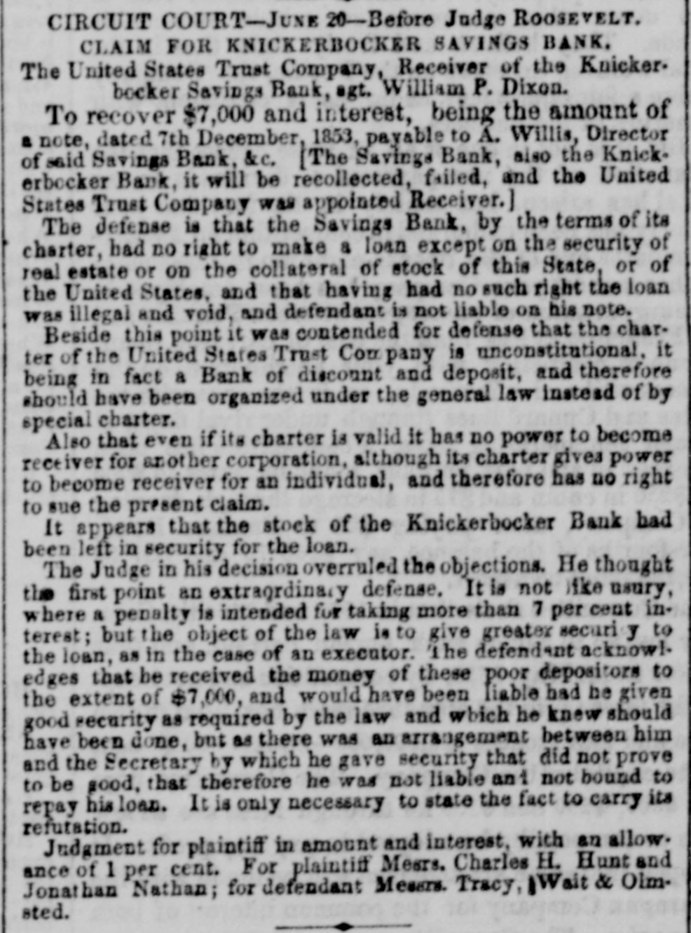 CIRCUIT COURT-JUNE 20-Before Judge ROOSEVELT. CLAIM FOR KNICKERBOCKER SAVINGS BANK. The United States Trust Company, Receiver of the Knickerbocker Savings Bank, agt, William P. Dixon. To recover $7,000 and interest, being the amount of a note, dated 7th December, 1853, payable to A. Willis, Director of said Savings Bank, &c. [The Savings Bank, also the Knickerbocker Bank, it will be recollected, failed, and the United States Trust Company was appointed Receiver.] The defense is that the Savings Bank, by the terms of its charter, had no right to make & loan except on the security of real estate or on the collateral of stock of this State, or of the United States, and that having had no such right the loan was illegal and void, and defendant is not liable on his note. Beside this point it was contended for defense that the charter of the United States Trust Com pany is unconstitutional, it being in fact a Bank of discount and deposit, and therefore should have been organized under the general law instead of by special charter. Also that even if its charter is valid it has no power to become receiver for another corporation, although its charter gives power to become receiver for an individual, and therefore has no right to sue the present claim. It appears that the stock of the Knickerbocker Bank had been left in security for the loan. The Judge in his decision overruled the objections. He thought the first point an extragrdinary defense. It is not like usury, where a penalty is intended for taking more than 7 per cent interest; but the object of the law is to give greater securi y to the loan, as in the case of an executor. The defendant acknowl. edges that be received the money of these poor depositors to the extent of $7,000, and would have been liable had he given good security as required by the law and which he knew should have been done, but as there was an arrangement between him and the Secretary by which he gave security that did not prove to be good, that therefore he was not liable ani not bound to repay his loan. It is only necessary to state the fact to carry its refutation. Judgment for plaintiff in amount and interest, with an allow. ance of 1 per cent. For plaintiff Mesrs. Charles H. Hunt and Jonathan Nathan; for defendant Messrs. Tracy, Wait & Olmsted.