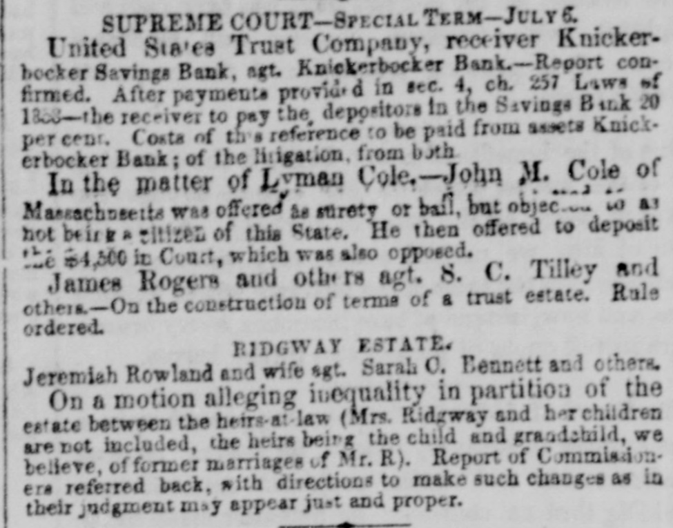 SUPREME COURT-SPECIAL TERM-JULY6. United States Trust Company, receiver Knickerbocker Savings Bank, ngt. Knickerbocker Bank.-Report confirmed. After payments provided in sec. 4, ch. 257 Laws of 1858-the receiver to pay the depositors in the Savings Bank 20 per cent. Costa of this reference to be paid from assets Knickerbocker Bank; of the litigation, from both. In the matter of Lyman Cole-John M. Cole of Massachusetts was offered as stirety or ball, but objectou to as not being A citizen of this State. He then offered to deposit the $4,500 in Court, which was also opposed. James Rogers and other rs agt. 8. C. Tilley and others-On the construction of terms of & trust estate. Rule ordered. RIDGWAY ESTATE. Jeremiah Rowland and wife agt. Sarah C. Bennett and others. On a motion alleging inequality in partition of the estate between the heirs-at-law (Mrs. Ridgway and her children are not included, the heirs being the child and grandsbild, we believe, of former marriages of Mr. R.). Report of Commissionera referred back, with directions to make such changes as in their judgment may appear just and proper.