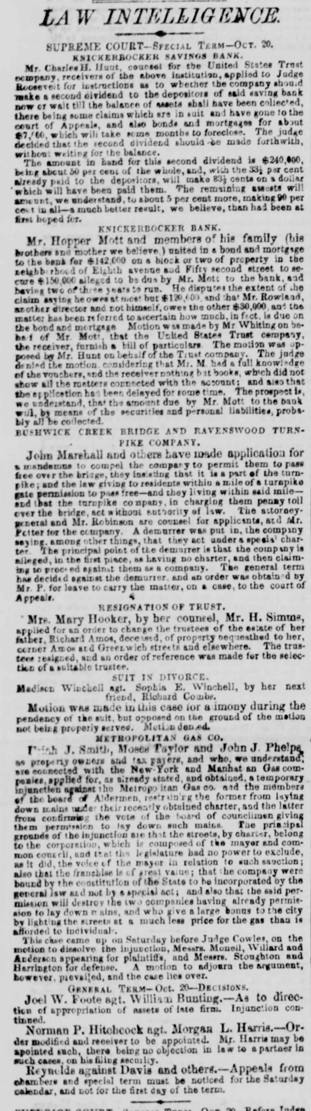 LA W INTELLIGENCE SUPREME COURT-SPECIAL TERM-OCT. 20. KNICKERBOCKER SAVINGS BANK. Mr. CharlesH. Hunt, counsel for the United States Trust company, receivers of the above institution, applied to Judge Rooseveit for instructions as to whether the company should make a second dividend to the depositors of said saving bank now or wait till the balance of assets shall have been collected, there being some claims which are in suit and have gone to the court of Appeals, and also bonds and mortgages for about $7,500, which will take some months to foreclose. The judge decided that the second dividend should be made forthwith, without waiting for the balance. The amount in hand for this second dividend is $240,000, being about 50 per cent of the whole, and, with the 331 per cent already paid to the depositors, will make 83} cents on a dollar which will have been paid them. The remaining assests will amount, we understand, to about 5 per cent more, making 90 per cent in all-a much better result, we believe, than had been at first hoped for. KNICKERBOCKER BANK. Mr. Hopper Mott and members of his family (his brothers and mother we believe,) united in a bond and mortgage to the bank for $142,000 on a block or two of property in the neighb rhood of Eighth avenue and Fifty second street to secare $150,000 alleged to be due by Mr. Mott to the bank, and beving two of three years to run. He disputes the extent of the claim saying he owes at most but $120,000, and that Mr. Rowland, another director and not himself, owes the other $30,000, and the matter has been ferred to avcertain how much, in fact. is due on the bond and mortgage Motion 18 made by Mr Whiting on be. bed of Mr. Mott, that the United States Trust company, the receiver, furnish 8 bill of particulars The motion was op. posed by Mr. Hunt on behalf of the Trust company. The judge denied the motion considering that Mr. M had a full knowledge of the vouchers, and the receiver nothing but books, which did not show all the roatters connected with the account; and also that the application had been delayed for some time. The prospect is, we understand, that the amount due by Mr. Mott to the bank will, by means of the securities and personal liabilities, probabiy all be collected. BUSHWICK CREEK BRIDGE AND RAVENSWOOD TURNPIKE COMPANY. John Marshall and others have made application for & mandemus to compel the company to permit them to pass free over the bridge, they insisting that it is a part of the turnpike; and the law giving to residents within 8 mile of a turnpike gate pennission to pass free-and they living within said mileand that the turnpike CO npany, in charging them penny toll over the bridge, act without authority of law. The attorneygeneral and Mr. Robinson are counsel for applicants, and Mr. Potter for the company. A demurrer was put in, the compiny saying, among other things, that they act under a special charter. The principal point of the demurrer is that the company is alleged, in the first place, as having no charter, and then claimtog to proce ed against them as a company. The general term has decided against the demurrer, and an order was obtain by Mr. P. for leave to carry the matter, on a case, to the court of % Appeals. RESIGNATION OF TRUST. Mrs. Mary Hooker, by her counsel, Mr. H. Simms, applied for an order to change the trustees of the estate of her father, Richard Amos, deceased, of property bequeathed to her, corner Arnos and Greezwich streets and elsewhere. The trusteer resigned, and an order of reference was made for the selection of & suitable trustee. SUIT IN DIVORCE. Madison Winchell agt. Sophia E. Winchell, by her next friend, Richard Combe. Motion was made in this case for a imony during the pendency of the suit, but opposed on the ground of the mation not being properly served. Motion dened. METROPOLITAN GAS CO. Unioh J. Smith, Moses Taylor and John J. Phelps as property owners and tax payers, and who, we understand; are connected with the New York and Manhat an Gas companies, applied for, as already stated, and obtained, a temporary injunction against the Metropo itan Gas co. and the members of the board of Aldermen, restr aining the former from laying down mains under their recently obtained charter, and the latter from confirming the vote of the board of councilmen giving them permission to lay down such mains. The principal grounds of the injunction are that the streets, by charter, belong to the corporation, which is composed of the mayor and common conxcil, and that the legislature had no power to exclude, as It did, the voice of the mayor in relation to such sauction; also that the franchise is of great value; that the company were bound by the constitution of the State to be incorporated by the general lsw and not by & special act; and also that the said permission will destroy the two companies having already permission to lay down B ains, and who give a large bonus to the city by lighting the streets at a much less price for the gas than is afforded to individuals. This case came up on Saturday before Judge Cowles, on the motion to dissolve the injunction, Messrs. Moneil, Willard and Anderson appearing for plaintiffs, and Mesers. Stoughton and Harrington for defense. A motion to adjourn the argument, however, prevailed, and the case lies over. GENERAL TERM-Oct. 20-DECISIONS. Joel W. Foote agt. William Bunting.-As to direction of appropriation of assets of late firm. Injunction continned. Norman P. Hitchcock agt. Morgan L. Harris.-Order modified and receiver to be appointed. Mr. Harris may be spointed such, there being no objection in law to a partner in such cases, on his filing security. Reynolds against Davis and others.-Appeals from chambers and special term must be noticed for the Saturday calendar, and not for the first day of the term. Oct Refore Indge