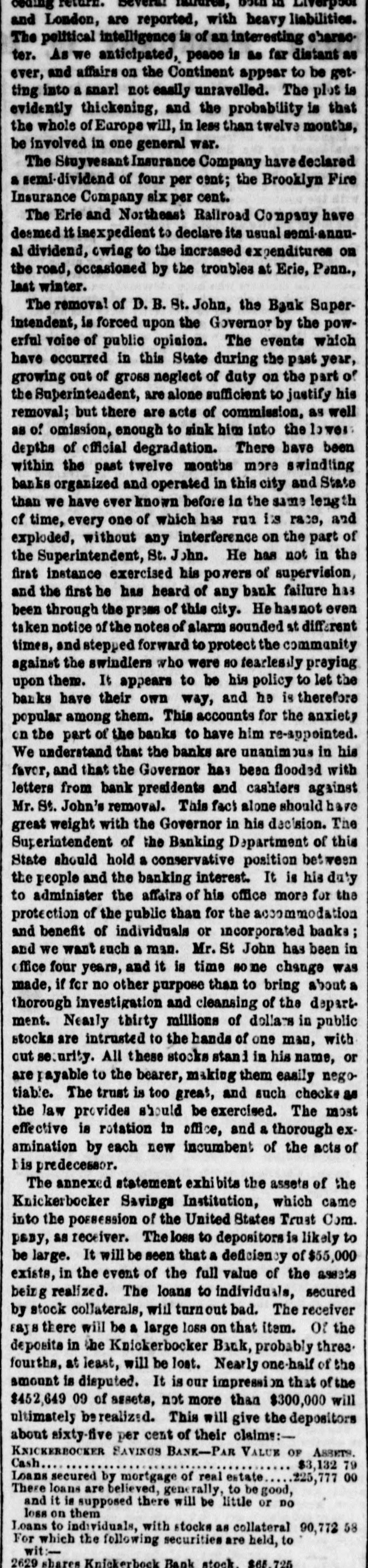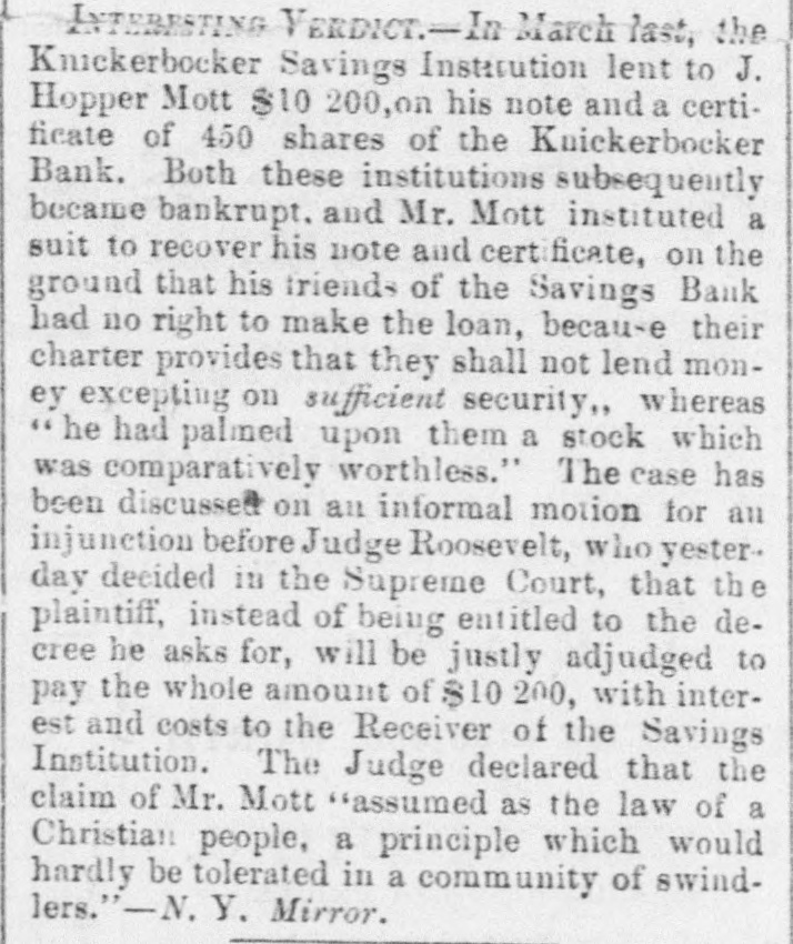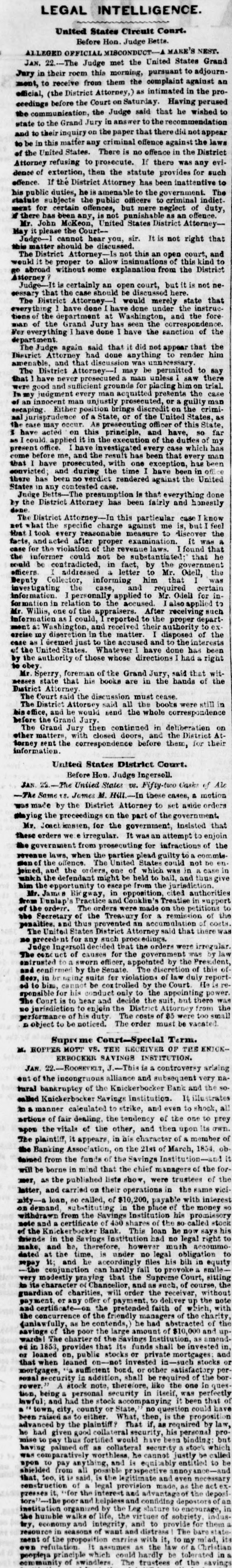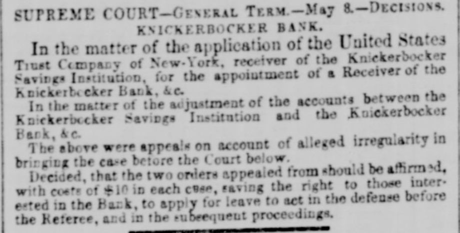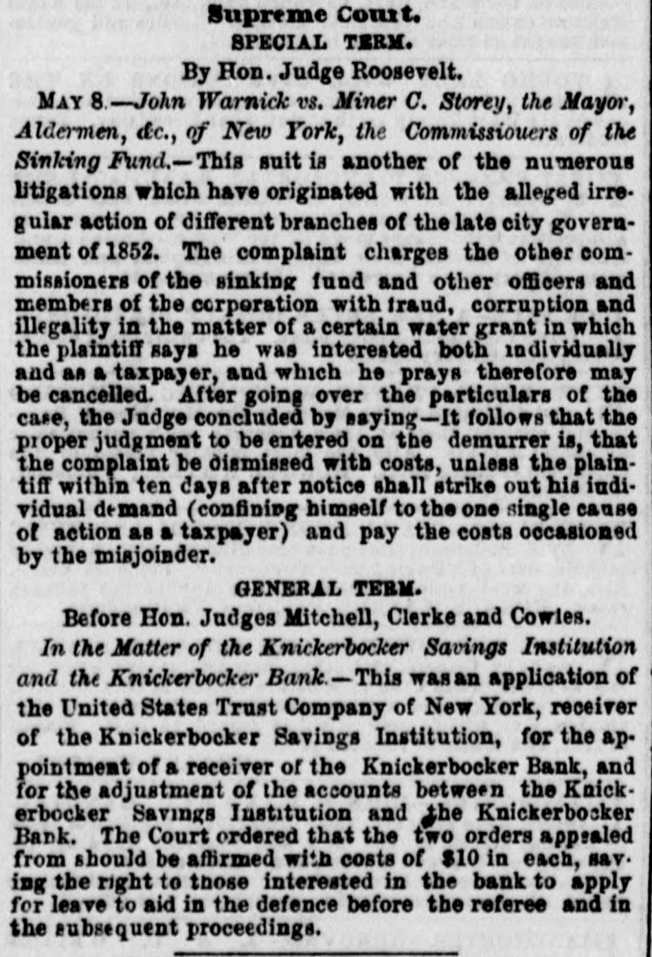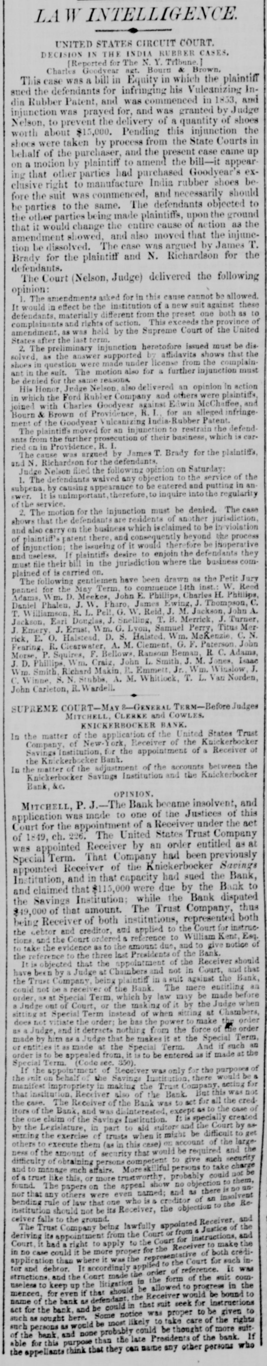 LA W INTELLIGENCE. UNITED STATES CIRCUIT COURT. DECISION IN THE INDIA RUBBER CASES. [Reported for The N. Y. Tribune Charles Goodyear agt. Bourn & Brown. This case was a bill in Equity in which the plaintiff sued the defendants for infringing his Vulcanizing India Rubber Patent, and was commenced in 1853, and injunction was prayed for, and was granted by Judge Nelson, to prevent the delivery of a quantity of shoes worth about $15,000. Pending this injunction the shoes were taken by process from the State Courts in behalf of the purchaser, and the present case came up on a motion by plaintiff to amend the bill-it appearing that other parties had purchased Goodyear's exclusive right to manufacture India rubber shoes before the suit was commenced, and necessarily should be parties to the same. The defendants objected to the other parties being made plaintiffs, upon the ground that it would change the entire cause of action as the amendment showed, and also moved that the injunetion be dissolved. The case was argued by James T. Brady for the plaintiff and N. Richardson for the defendants. The Court (Nelson, Judge) delivered the following opinion: 1. The amendments asked for in this cause cannot be allowed. It would in effect be the institution of a new suit against these defendants, materially different from the preset one both as to complainants and rights of action. This exceeds the province of amendment, as was held by the Supreme Court of the United States after the last term. 2. The preliminary injunction heretofore issued must be dissolved, as the answer supported by affidavits shows that the shoes in question were made under license from the complainant in the suit. The motion also for a further injunction must be denied for the same reasons, His Honor, Judge Nelson, also delivered an opinion in action in which the Ford Rubber Company and others were plaintiffs, joined with Charles Goodyear against Edwin McChaffee, and Bourn & Brown of Providence, R. I., for an alleged infringement of the Goodyear Vuleanizing India Rubber Patent. The plaintiffs moved for an injunction to restrain the defend. ants from the further prosecution of their business, which is carried on in Providence, R. I. The cause was argued by James T. Brady for the plaintiffs, and N. Richardson for the defendants. Judge Nelson filed the following opinion on Saturday: 1. The defendants waived any objection to the service of the subpena, by causing appearance to be entered and putting in an swer. It is unimportant, therefore, to inquire into the regularity of the service. 2. The motion for the injunction must be denied. The case shows that the defendants are residents of another jurisdiction, and also carry on the business which isclaimed to be inviolation of plaintiff's patent there, and consequently beyond the process of injunction; the issueing of it would therefore be inoperative and useless. If plaintiffs desire to enjoin the defendants they must file their bill in the jurisdiction where the business complained of is carried on. The following gentlemen have been drawn as the Petit Jury pannel for the May Term, to commence 14th inst.: W. Reed Adams, W m. D. Meekes, John E. Phillips, Charles H. Phillips, Daniel Phalen, J. W. Pharo, James Ewing, J. Thompson, C. T. illiamson, R. L. Pell, G. W. Reid, J. M. Jackson, John A. Jackson, Earl Douglas, J. Snelling, T. B. Merrick, J. Turner, J. Emery, J. Ernst, m. G. Lyon, Samuel Perry, Titus Merrick, E. O. Halstead, D. S. Halsted. Wm. McKenzie, C. N. Fearing, R. Clearwater, A. M. Clement, G. F. Paterson John Morse, P. Squires, F. Bellows, Ransom Beman, R C. Adams, J. D. Phillips, Wm. Craig, John L. Smith, J. M. Jones, Isaac Wm. Smith, Richard Makin, R. Emmett, Jr. Wm. inslow, J. C. Winne, S. N. Stubbs, A. M. Whitlock, T. L. Van Norden, John Carleton, R. ardell. SUPREME COURT-MAY 8-GENERAL TERM-Before Judges MITCHELL, CLERKE and COWLES. KNICKERBOCKER BANK. In the matter of the application of the United States Trust Company, of New-York, Receiver of the Knickerbocker Savings Institution, for the appointment of a Receiver of the Knickerbocker Bank. In the matter of the adjustment of the accounts between the Knickerbocker Savings Institution and the Knickerbocker Bank, &c, OPINION. MITCHELL, P. J.-The Bank became insolvent, and application was made to one of the Justices of this Court for the appointment of a Receiver under the act of 1849, ch. 226. The United States Trust Company was appointed Receiver by an order entitled as at Special Term. That Company had been previously appointed Receiver of the Knickerbocker Savings Institution, and in that capacity had sued the Bank, and claimed that $115,000 were due by the Bank to the Savings Institution: while the Bank disputed $49,000 of that amount. The Trust Company, thus being Receiver of both institutions, represented both the debtor and creditor, and applied to the Court for instruc. tions, and the Court ordered a reference to William Kent, Esq. to take the evidence as to the amount due, and to give notice of the reference to the three last Presidents of the Bank. It is objected that the appointment of the Receiver should have been by a Judge at Chambers and not in Court, and that the Trust Company, being plaintiff in a suit against the Bank, could not be a receiver of the Bank. The mere entitling an order, as at Special Term, which by law may be made before a Judge out of Court, or the mak of it by the Judge when sitting at Special Term instead of when sitting at Chambers, does not vitiate the order; he has the power to make the order as a Judge, and it detracts nothing from the force of the order made by him as a Judge that he makes it at the Special Term, or entitles it as made at the Special Term. And if such an order is to be appealed from, it is to be entered as if made at the Special Term. (Code sec. 350). If the appointment of Receiver was only for the purposes of the mit on behalf the Savings Institution, there would be & ma