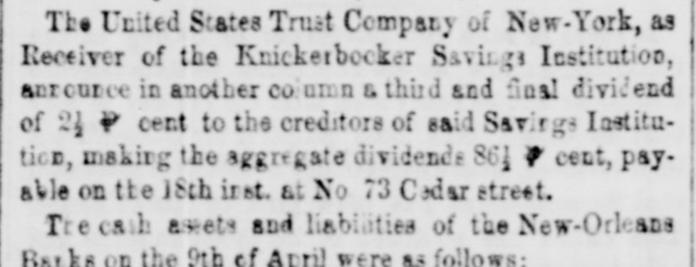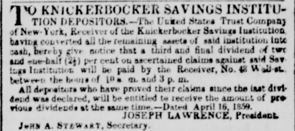 TOHN B. MURRAY & CO., BANKING, DISCOUNT AND COLLECTING HOUSE, No. 40 WALL STREET, NEW YORK CITY. Orders from correspondents promptly executed. NICKERBOCKER ICE COMPANY'S OFFICE, NO. 432 K Canal street, N, Y., April 12, 1859 We, the undersigned, inspectors of election for nine trustees of the Knickerbocker Ice Company of the city of New York, and also for three inspectors of the election for said company, held at their office, 432 Canal street, in said city, on the second Tuesday (12th) of April, eighteen hundred and fifty nine, between the hours of 12 and 1 P. M., in pursuance of the by-laws of said company, do hereby certify that the total number of shares voted on at said election was six thousand and ninetythree, of which number of votes Messra Richard T. Comptoa, Horace Dennett, Cornelins R. Wortendyke, Joseph Britton, Alfred Barmore, Moses G. Leonard, Theodore Browning, Anthony Compton and Samuel Hiscox received each an equal number. And we further certify that the abovenamed persons were duly elected trustees of said company for the ensuing year. they having each received the greatest number of votes.cas at said election. t Also, the following named persons were duly elected inspecters of election for the next election for trustees of said company, they having each received the greatest number of votes said election:-David D. Egan, C.Stephens and G. Cohen. GERSHON COHEN, DAVID D. EGAN, Inspectors. C. STEPHENS, At a meeting of the Board of Trustees of the Knickerbocker Ice Company elected on the 12th instant, held at their office, 432 Canal street, 14th April, 1859. On motion the Board proceeded to elect a President and Secretary for the ensuing year, when. after balloting, Mr. R. T. Compton was unanimously elected President, and Mr. Wm. J. Wilcox unanimously elected Secretary. Mr. Wm. J. Wiloox tendered his resignation as Secretary of the Board, which was accepted; whereupon a committee was appointed. who reported the following resolution:Resolved. That as our former Secretary, Win. J. Wilcox, now retires from the active business walks of life, and declines a re-election to the office that he has filled with us for the past four years, we, the Trustees of the Knickerbocker Ice Company, gladly take this opportunity to express our kindest regards towards that gentleman, thankful that the past connection has been of no pleasant a character to us: and assure him that, as he now sees fit voluntarily to retire to the more peaceful purguits of the farmer's life, we heartily trust that his happiness will thereby be promoted, and that he will always recur with unalloyed pleasure to that portion of the past spent in the comnection, which is by his own act this day dissolved. THEO. BROWNING, JAS. BRITTON, Committee. A. BARMORE, MOSES G. LEONARD, The above resolution was unanimously adopted. On motion. of Moses G. Leonard, the Board now proceeded to elect a Secretary in place of Wm. J. Wilcox, resigned, when Cornellus R. Wortendyke was unanimously elected Secretary for the ensuing year. By order of the Board. R. T. COMPTON, President. C. R. WORTENDYRE, Secretary. FFICE OF FULTON FIRE INSURANCE COMPANY, 40 O Wall street.-The board of directors of this company have this day declared a semi annual dividend of ten per cent payable on demand. JAMES M. RANKIN, Secretary. NEW YORK, April 12, 1859. T° KNICKERBOCKER SAVINGS INSTITUTION DEpositore.-The United States Trust Company of New York, Receiver of the Knickerbocker Savings Institution, having converted all the remaining assets of said instituti in into cash, hereby gives notice that a third and final dividend of two and one-half (23/2) per cent on ascertained claims against said Savings Institution will be paid by the Receiver, in the basement et the marble building No. 73 Cedar street, between the hours of 9 A. M. and 3 P. M, from the 18th to the 30th of April, 1859. All depositors who have proved their claims since the last dividend was declared will be entitled to receive the amount of previous dividends at the same time. Dated April 16, 1859. JOSEPH LAWRENCE, President. JOHN A. STEWART, Secretary. $200.000.-MONEY TO for a LEND term of ON five BOND years. in AND any sum from $1,000 to $60,000, to suit applicants, on improved