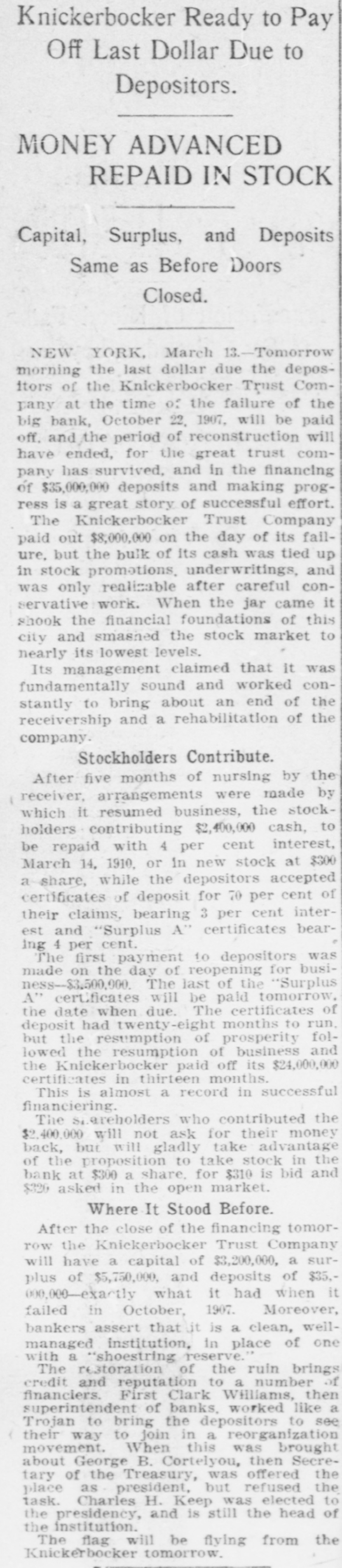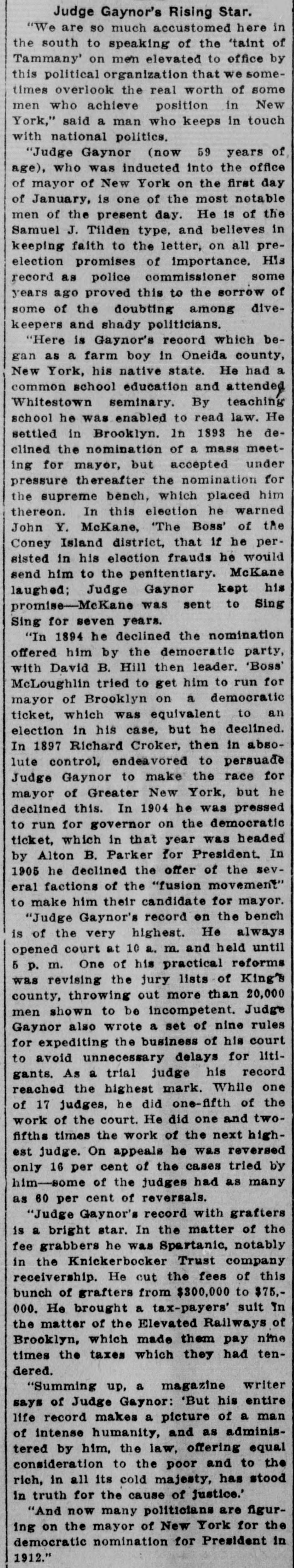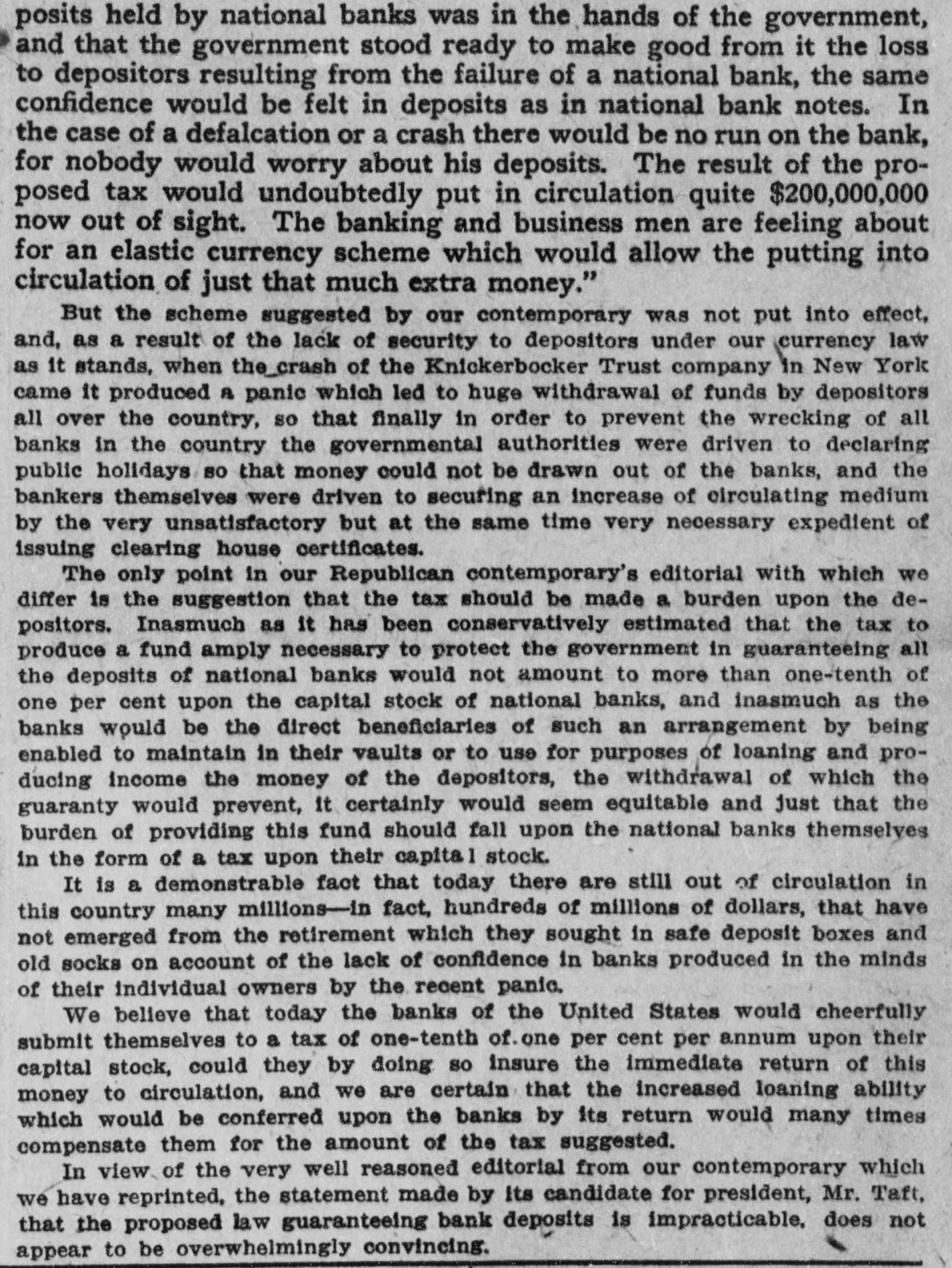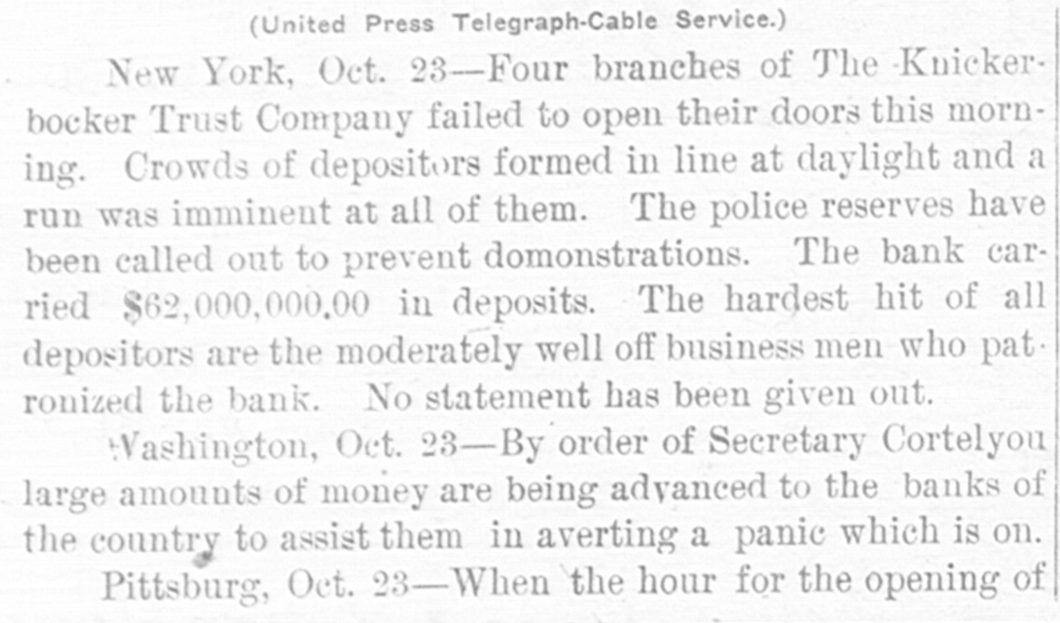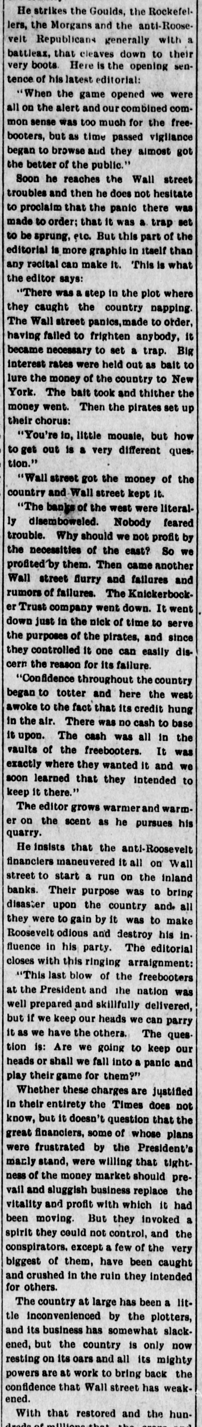 age estimated at $100,000. Charles Aldrich, curator and founder of the state historical department of Iowa, died at Boone, Ia. Congressman Adolph Meyer, for- in merly an assistant adjutant general New the confederate army, died in Orleans. Giuseppe Alla was placed on trial He in the Denver (Col.) criminal court. shot down Father Leo Heinrichs. An effort is being made before conto secure a new apportionment by of gress the recompensation now given the government for the transportation of United States mails by rail. The Point Loma (Cal.) wireless station reported a dispatch for the navy on department from Admiral Evans board his flagship, the Connecticut. Warden Frank Conley of the Deer Lodge (Mont.) state penitentiary was dangerously wounded and his first assistant warden, James Robinson, was killed when three life convicts made a dash for liberty. ultimatum in the case of Maru has been the foreign board at the Japan's Tatsu Chinese presented Peking, to and the board has the matter under consideration. The Tatsu Maru was seized off Macao by Chinese customs cruisers. Gov. Charles E. Hughes was formally indorsed as New York's candidate for president by the Republican state New committee at its meeting in York. The Argentine elections resulted in a complete victory for the existing government. David Waldo, a wealthy horseman throughout the a and who formerly well-known States, owned United was killed near Indepenin a runaway race dence, track, Mo., accident. Colombian Raminez Arbelaez, the died at Lima, Peru. Lumber charge The Union d'affaires, company, over St. Paul, Minn., which will take than seven sawmill plants and more 3,000,000,000 feet of standing timber, the has been granted a charter by Manitoba government. A battle between farmers and three robbers, in which two of the latter were wounded, followed the daring robbery of the post offices at Pedricktown and Bridgeport, N. J. Twenty-six railroad laborers were overcome by gas in the Pennsylvania Md. railroad tunnel at Baltimore, Four died and ten badly affected. The Knickerbocker Trust company, New York, which suspended business at the beginning of the financial panic, resumes business soon. Mme. Anna Gould, who recently sea divorce from her husband, cured Count Boni de Castellane, in married Paris, denied the report that she Prince Helie de Sagan. In court at Waukegan, Ill., a verdict cf $14,000 was returned in libel suit of Attorney Philip W. Mothersill against Overseer W. G. Voliva of Zion City The army auto car, carried a York mesfrom Gen. Grant in New sage to Col. R. H. R. Loughborough, city commandant at Fort Leavenworth, Kan. Germany's first mammoth war ship suclaunched at Wilhelmshaven cessfully was and named Nassau. supreme court at Nashville, saThe law. This law confines the tion upheld the Nashville segrega- terriloons Tenn., of the city to a certain tory. destroyed the boys' dormitory AgriculFire New Mexico School of many at the at Mesilla park, Tex., and sleeping ture students had narrow Appalache escapes. While boating on the skiff pond near Greers, S. C., a three mill carrying ten people capsized and women were drowned. young fire at Nilgata, Japan, the 1,500 In a were totally destroyed, was dishouses trict being swept clean. There some loss J. of Ainsworth, life. commander of the Daniel revenue cutter Wash. Rush, committed suicide at Seattle, were reported throughout was Floods Indiana. The Wabash northern its banks for miles northeast partly of out Lafayette. of South Peru was under water. conKansas Republicans in instructed state to at Topeka, Kan., vention vote for the nomination of Secretary W. H. Taft for president. States Senator Redfield ProcUnited Vermont died in Washington at tor after of a short illness following an tack of grippe. Mount blowers robbed the 40 miles Safe bank, Mount Orab, O., curreneast Orab of Cincinnati, of $3,000 in cy and complete securities. shut-down of the 15,000 coal A in Iowa, worked by mines miners, is threatened. The agreement expires March 31.