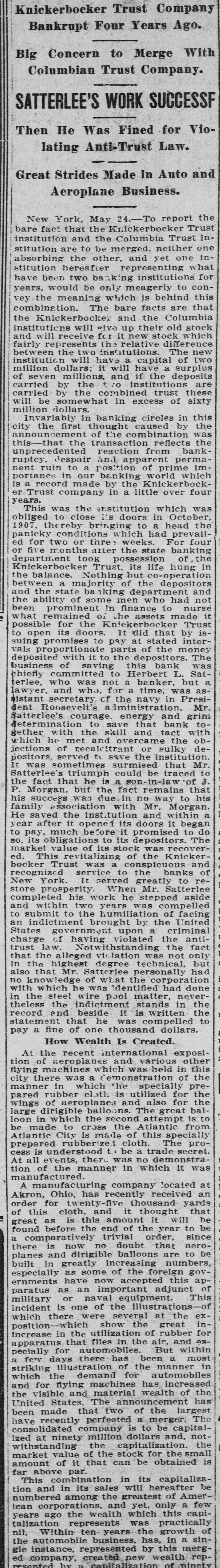 Knickerbocker Trust Company Bankrupt Four Years Ago. Big Concern to Merge With Columbian Trust Company. SATTERLEE'S WORK SUCCESSF Then He Was Fined for Violating Anti-Trust Law. Great Strides Made in Auto and Aeroplane Business. New York, May 24.-To report the bare fact that the Knickerbocker Trust institution and the Columbia Trust institution are to be merged, neither one absorbing the other, and yet one institution hereafter representing what have been two banking institutions for years, would be only meagerly to convey the meaning which is behind this combination. The bare facts are that the Knickerbocker and the Columbia institutions will give up their old stock and will receive for it new stock which fairly represents the relative difference between the two institutions. The new institution will have a capital of two million dollars; it will have a surplus of seven millions, and if the deposits carried by the two institutions are carried by the combined trust these will be somewhat in excess of sixty million dollars. Invariably in banking circles in this city the first thought caused by the announcement of the combination was this-that the transaction reflects the unprecedented reaction from bankruptcy. Jespair and apparent permanent ruin to a position of prime importance in our banking world which is a record made by the Knickerbocker Trust company in a little over four years. This was the institution which was obliged to close its doors in October, 1907, thereby bringing to a head the panicky conditions which had prevailed for two or three weeks. For four or five months arter the state banking department took possession of the Knickerbocker Trust. its life hung in the balance. Nothing but co-operation between a majority of the depositors and the state nking department and the ability of some men who had not been prominent in finance to nurse what remained O1 the assets made it possible for the Knickerbocker Trust to open its doors. It did that by issuing promises to pay at stated intervals proportionate parts of the money deposited with it to the depositors. The business of saving this bank was chiefly committed to Herbert L. Satterlee, who was not a banker, but a lawyer, and who, for a time, was assistant secretary cf the navy in President Roosevelt's administration. Mr. Satterlee's courage energy and grim determination to save that bank together with the skill and tact with which he met and overcame the objections of recalcitrant or sulky depositors, served to save the institution. It was sometimes surmised that Mr. Satterlee's triumph could be traced to the fact that he is a son-in-law of J. P. Morgan, but the fact remains that his success was due in no way to his family essociation with Mr. Morgan. He saved the institution and within a year after It opened its doors it began to pay, much before it promised to do SO, its obligations to its depositors. The market value of its stock was recovered. This revitalizing of the Knickerbocker Trust was a conspicuous and recognized service to the banks of New York. It served greatly to restore prosperity. When Mr. Satterlee completed his work he stepped aside and within two years was compelled to submit to the humiliation of facing an indictment brought by the United States government upon a criminal charge of having violated the antitrust law. Notwithstanding the fact that the alleged vi lation was not only in the highest degree technical, but also that Mr. Satterlee personally had no knowledge of what the corporation with which he was identified had done in the steel wire pool matter, nevertheless the indictment stands in the record and beside It is written the statement that he was compelled to pay a fine of one thousand dollars. How Wealth Is Created. At the recent international exposition of aeroplanes and various other flying machines which was held in this city there was a cemonstration of the manner in which the specially prepared rubber cloth is utilized for the wings of aeroplanes and also for the large dirigible balloons. The great balloon in which the second attempt is to be made to cross the Atlantic from Atlantic City is made of this specially prepared rubberized cloth. The process is understood to be a trade secret. At all events, there was no demonstration of the manner in which it was manufactured. A manufacturing company located at Akron, Ohio, has recently received an order for twenty-five thousand yards of this cloth. and it thought that great as is this amount it will be found before the end of the year to be a comparatively trivial order, since there is now no doubt that aeroplanes and dirigible balloons are to be built in greatly increasing numbers, especially as some of the foreign governments have now accepted this ap-