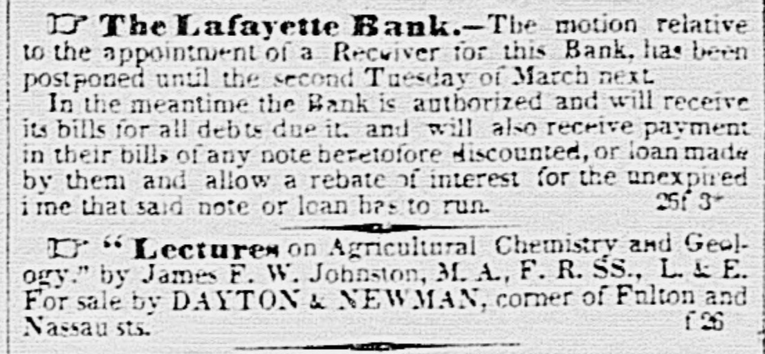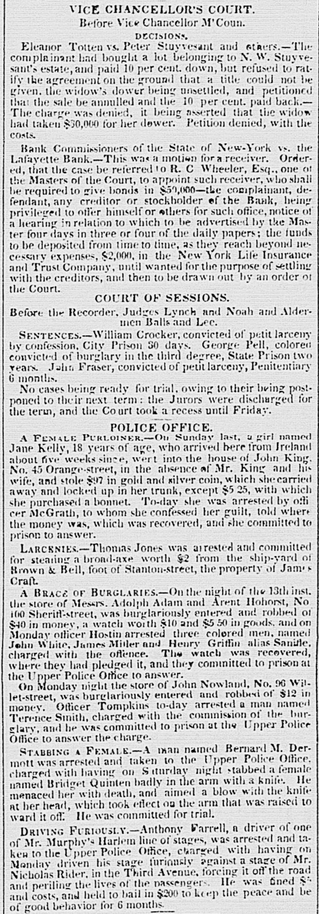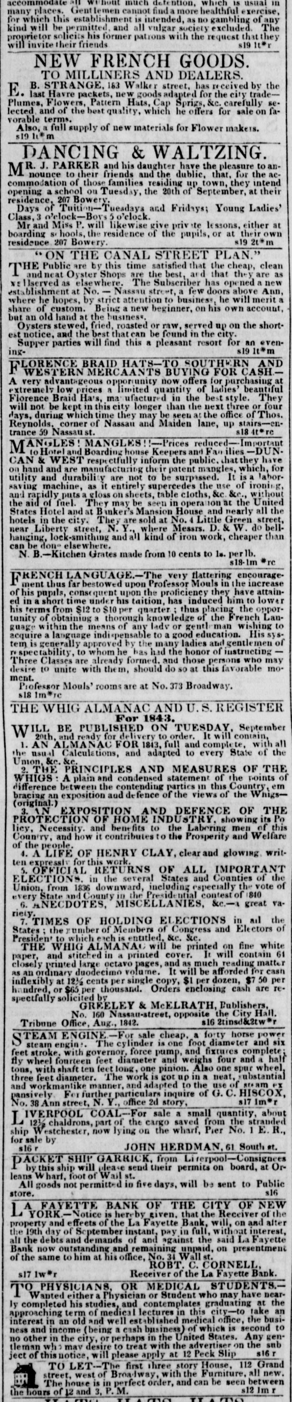 much is detention, which many places. Gentlemen cannot find more healthful which this establishment is intended, as no gambling of any kind will be permitted and all vulgar society excluded The proprietor solicits his former patrons with the request that they s19 tt*, will invite their friends NEW FRENCH GOODS. TO MILLINERS AND DEALERS. B. STRANGE, 163 Walker street, has received by the E last Havre packets, ne goods adapted for the city tradePlumes, Flowers, Pattern Hats, Cap Sprigs, &c. carefully selected and of the best quality, which he offers for sale on favorable terms. Also, full supply of new materials for Flower makers. $19 lt*m DANCING & WALTZING. R. J. PARKER and his daughter have the pleasure to anM nounce to their friends and the dublic, that, for the accommodation of those families residing up town, they intend opening a school ou Tuesday, the 20th of September, at their residence, 207 Bowery Days of Tuition-Tuesdaya and Fridays; Young Ladies' Class, 3 o'clock-Boys 5 o'clock. Mr and Miss P. will likewise give priv te lessons, either at boarding hools the residence of the pupils, or at their own 19 2t*m residence 207 Bowery ON THE CANAL STREET PLAN." THE Public are by this time satisfied that the cheap, clean and neat Oyster Shops are the best, and that they are as Ilserved as elsewhere. The Subscriber has opened a new establishment at No. Nassau street, a few doors above Ann, where he hopes, by strict attention to business, he will merit share of custom. Being a new beginner, on his own account, but an old hand at the business. Oysters stewed, fried. roasted or raw, served up on the shortest notice, and the best that can be found in the city. Supper parties will find this a pleasant resort for an evens19 It*m ingFLORENCE BRAID HATS- TO SOUTHERN AND F WESTERN MERCAANTS BUYING FOR CASHA very advantageous opportunity now offers for purchasing at extremely low prices a limited quantity of ladies' beautiful Florence Braid Ha's, ma ufactured in the best style. They will not be kept in this city longer than the next three or four days, during which time they may be seen at the office of Thos. Reynolds corner of Nassau and Maiden lane, up stairs-en18 4t*re trance 59 Nassau st. MANGLES MANGLES! reduced-Important toHoteland Boarding house Keepers and Fan ilies-DUN CAN & WEST respectfully inform the public. that they have on hand and are manufacturing thei ir patent mangles, which, for utility and durability are not to be surpassed. It is laborsaving machine, as it entirely supercedes the use of ironing. and rapidly puts gloss on sheets, table cloths, &c &c. without the aid of fuel. They may be seen in operation at the United States Hotel and at Banker's Mansion House and nearly all the hotels in the city. They are sold at No. Little Green street, near Liberty street, N. Y. where Messrs. W. do bellhanging, lock-smithing and all kind of iron work, cheaper than can be don elsewhere. B.-Kitchen Grates made from 10 cents to 1s. perlb. s18-1m *re FRENCH LANGUAGE.-The very flattering encouragement thus far bestowed upon Professor Mouls in the increase of his pupils, consequent upon the proficiency they have attained in a short time under his taition, has induced him to lower his terms from $12 $10 per quarter thus placing the opportunity of obtaining a thorough knowledge of the French Language within the means of any ladv or gentl man wishing to acquire a language indispensable to a good education. His system is generally approved by the many ladies and gentlemen of re spectability, to whom he has had the honor of instructing Three Classes are already formed. and those persons who may desire to unite with them, should do so at this favorable mo ment. Professor Mouls' rooms are at No. 373 Broadway. s18 Im*re THE WHIG ALMANAC AND U.S. REGISTER For 1843. WILL BE PUBLISHED ON TUESDAY, September 20th, and ready for delivery to order. It will contain, 1. AN ALMANAC FOR 1843, full and complete, with the all the usual Calculations, and adapted to every State of &c Umon,&c. THE PRINCIPLES AND MEASURES OF THE WHIGS A plain and condensed statement of the points of difference between the contending parties in this Country, em bracing an exposition and defence of the views of the Whigs(original.) 3. AN EXPOSITION AND DEFENCE OF THE PROTECTION OF HOME INDUSTRY. showing its Po licy, Necessity. and benefits to the Labering men of this Country, and how it contributes to the Prosperity and Welfare of the people 4. A LIFE OF HENRY CLAY, clear and glowing written expressive for this work OFFICIAL RETURNS OF ALL IMPORTANT ELECTIONS. in the several States and Counties of the of Union, from 1836 downward, including especially the vote every State and 1 County in the Presidential contest of 840 6. NECDOTES, MISCELLANIES, &c.- great variely, TIMES OF HOLDING ELECTIONS in ail the States the number of Members of Congress and Electors of President to which each entitled, &c. Stc. THE WHIG ALMANA will be printed on fine white and stitched in a printed cover. It will contain 61 closely paper, printed large octavo pages, and as much reading matter an ordinary duodecimo volume. It will be afforded for cash inflexibly at 121/2 cents per single copy, $1 per dozen, $7.50 per rehandred, or $65 per thousand. Orders enclosing cash are spectfully solicited by GREELEY & McELRATH, Publishers, No. 160 Nassau-street, opposite the City Hall s16 2tinsd&2tw* Tribune Office, Aug., 1842. TEAM ENGINE sale cheap. a forty horse power The cylinder is one foot diameter and six feet steam stroke engin with governor, force pump and fixtures complete fly wheel fourteen feet diameter and weighs four and a half with shaft ten feet long. one pinion. Also one spur wheel, tons, feet diameter. The work is got up in neat, substantial three and adapted to the use of steam pansively and workmanlike For further manner, particulars inquire of G. C. HISCOX, s17 Im*r No. 38 Ann street, N.Y. office 2d story, IVERPOOL COAL-For sale a small quantity, about L 12