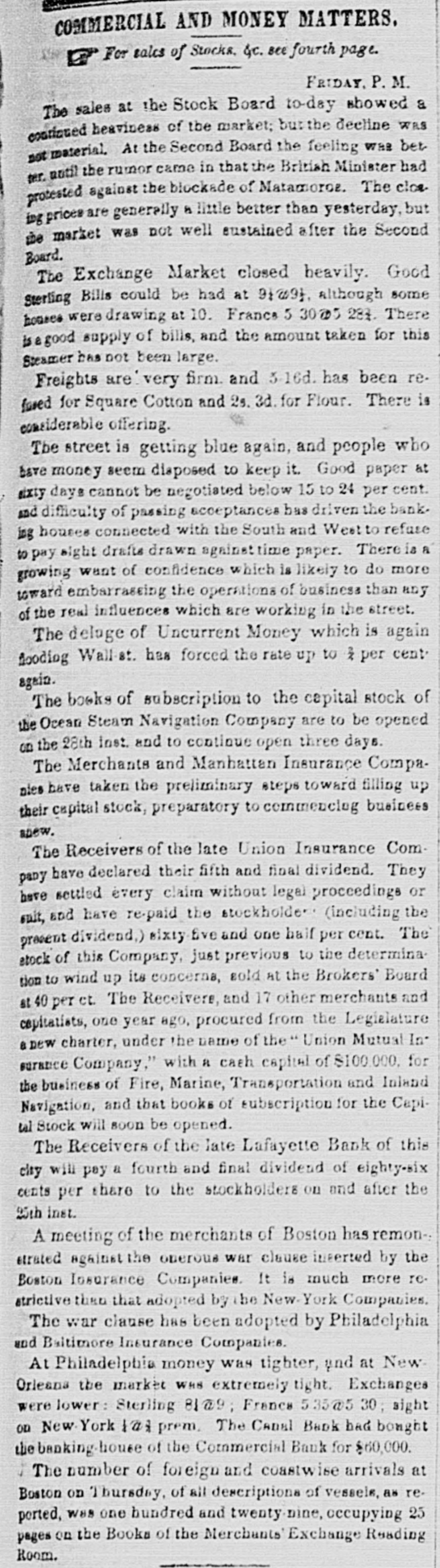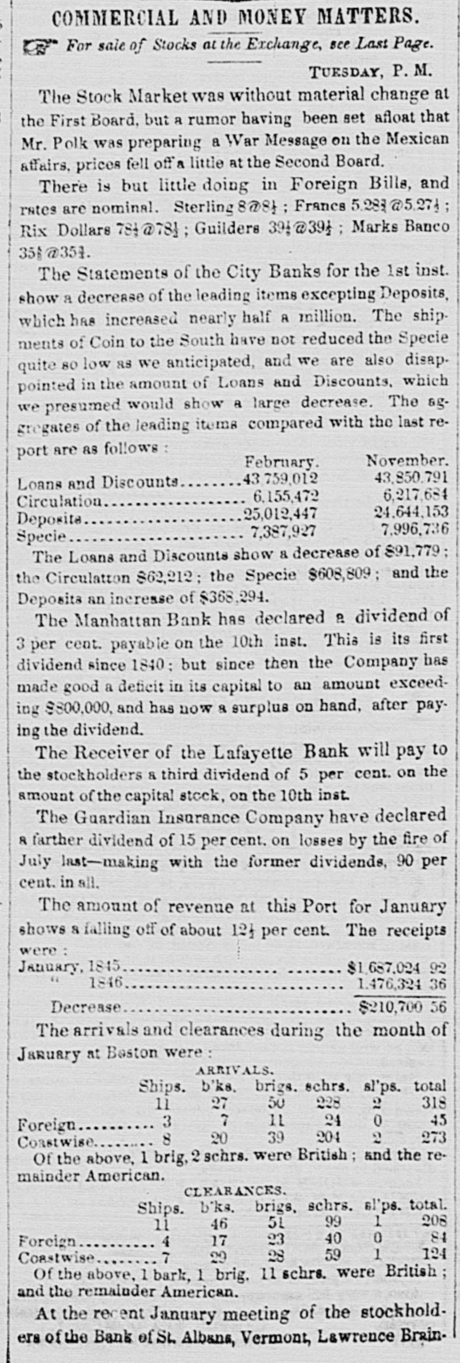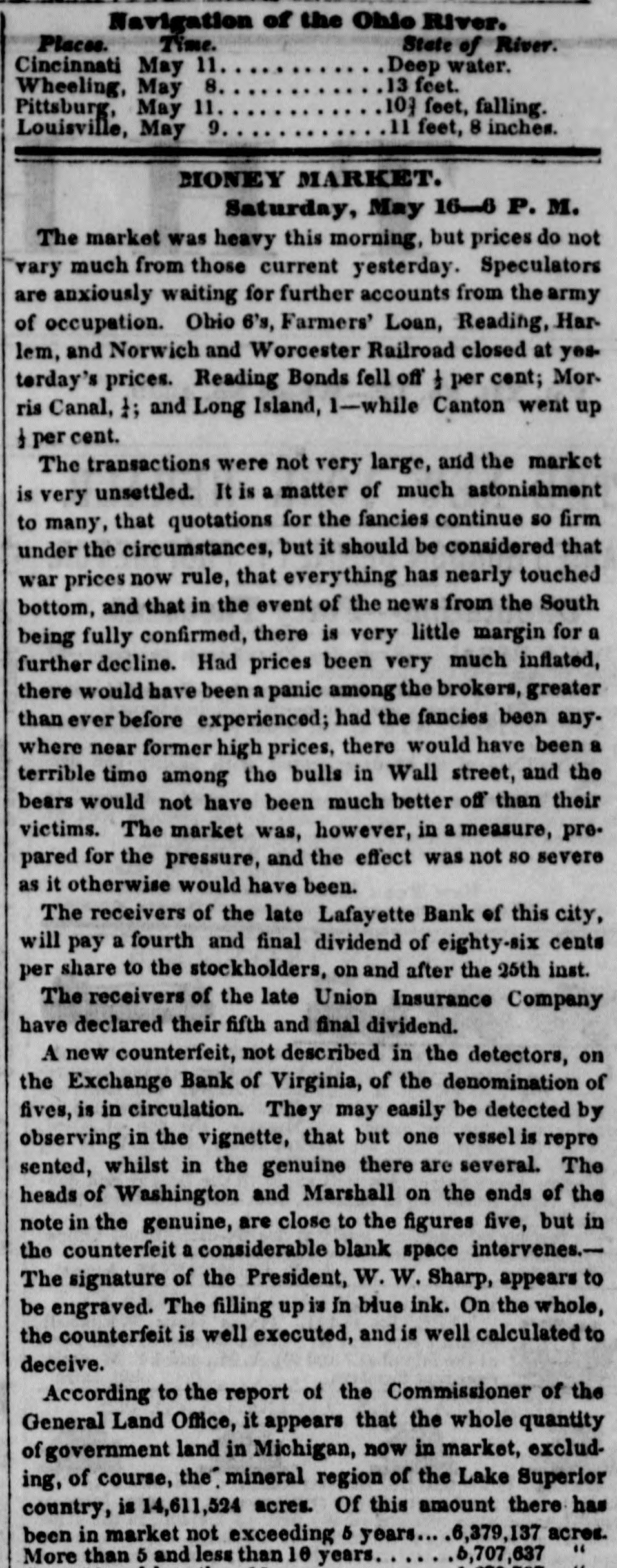 MONEY MARKET. Monday, June 9-6 P.M. The stock market was very heavy to-day, which in a measure can be attributed to the excessive hot weather. Stonington fell off 1 per cent; Norwich and Worcester, 1; Long Island, I Morris Canal, 1; Farmers' Lqan, Ohio 6's, 1. Harlem improved 1 per cent, and Eroton closed firm at Saturday's prices. The transactions were very limited. The trustees of the late Fulton Bank give notice that on the 20th of June they will pay a third surplus dividend of two per cent. Attempts are being made, with prospects of success, to extend the Vicksburg Railroad from Jackson, one of its present termini, to Brandon, so as to open a conneotion with the Georgia and South Carolina Railroads. The Comptroller of this State has given official notice that he will redeem, at par, the outstanding circulating bills of the following insolvent Safety Fund banks:Commercial Bank of New York. Bank of Buffalo. Commercial Bank of Buffalo. Commercial Bank of Oswego. Clinton County Bank. Watervliet Bank. Bank of Lyons. The Comptroller is not authorised to pay interest in any case. Those persons, therefore, who have packages of notes which have been protested, or the payment demanded of the receiver of the bank, in order to obtain interest, will find it necessary to collect the demand through the Receiver. Those persons who hold bills of any of the banks before named, and who have not taken the necessary steps to establish a claim for interest, and are willing to surrender the notes on receiving dollar for dollar, can be paid at this rate on presenting the bills to the Comptroller. The assets of the Bank of Oswego are believed to be sufficient to pay all the debts of that bank, and none of the circulating notes of the Bank of Oswego have been redeemed by the Comptroller. The debts of the Lafayette Bank of New York, includ. ing circulating notes, have been paid by the Receiver from the assets of the bank. The receipts at the Custom House for the week ending Saturday the 9th inst., amounted to $307,000. The monthly report of the Reading Railroad Company for May, 1843,44 and '45, presents the annexed statement of the receipts and business of the road. PHILADELPHIA AND READING RAILROAD. May, 1843. May, 1844. May, 1845. Receipts $31,447 47,763 34 79,822 82 15,205 Coal transported, tons. 35,684 64,698 The business for May, 1845, has been considerably more than the maximum estimate. Up to June 1st, the coal tonnage is over the estimate-800,000 tons for the year-rising nine thousand tons. In connection with this very favorable report and the immense improvement these increased receipts must produce in the affairs of the railroad company, we give a report of the business on the Schuylkill Canal, for one week in each of the past three years. BUSINESS ON THE SCHUYLKILL CANAL. Week ending June 10, 1843. June 8, 1844. June 7, 1845. Coal transported, tons, 18,095 11,869 5,796 For the same week the coal transportation of the Reading Railroad was as follows:1843. 1844. 1845. 2,388 Coal transported, tons, 8,796 18,871 It will be seen that these two works have changed places in the coal carrying trade of Eastern Pennsylvania. What the Schuylkill Canal was, the Reading Railroad will be, and judging from these returns the Schuyl. kill Canal will soon be what the Reading Road was. The annual reports of the Canada Banks, made up to May 31, 1845, compared with those of the same date last year, show an increase in circulation and discounts, and a decrease in the amount of specie on hand. We annex the latest report of the Quebec Bank:-