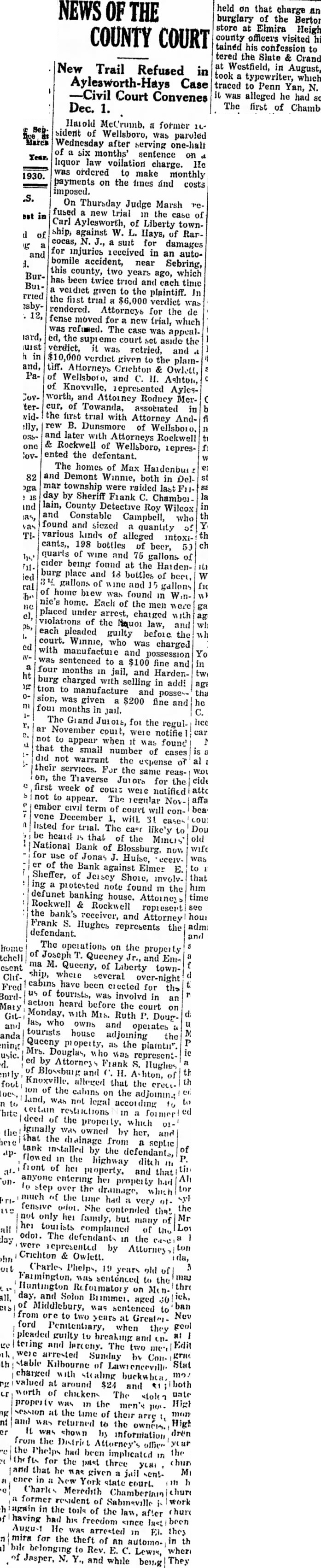 Harold McCrumb. a former 16. sident of Wellsboro, was paroled Wednesday after serving one-half of a six months' sentence on liquor law voilation charge. He was ordered to make monthly payments on the fines and costs imposed. On Thursday Judge Marsh refused a new trial in the case of Carl Aylesworth, of Liberty township, against W. L. Hays, of Rancocas, N. J., a suit for damages for injuries received in an autobomile accident, near Sebring, this county, two years ago, which has been twice tried and each time a verdict given to the plaintiff. In the first trial $6,000 verdict was rendered. Attorneys for the de fense moved for a new trial, which was refused. The case was appealed, the supreme court set aside the verdict, it was retried, and a $10,000 verdict given to the plaintiff. Attorneys Crichton & Owlett, of Wellsboro, and C. 11. Ashton, of Knoxville, represented Aylesworth, and Attorney Rodney Mercur, of Towanda, associated in the first trial with Attorney Andrew B. Dunsmore of Wellsboro. and later with Attorneys Rockwell & Rockwell of Wellsboro, iepresented the defentant. The homes of Max Haidenbur and Demont Winnie, both in Delmar township were raided last F11day by Sheriff Fiank C. Chamberlain, County Detective Roy Wilcox and Constable Campbell, who found and siezed quantity of various kinds of alleged intoxicants,, 198 bottles of beer, 50 quarts of wine and 75 gallons of cider being found at the Haidenburg place and 18 bottles of beet, 34 gallons of wine and 15 gallons of home biew was found in Winnic's home. Each of the men were placed under arrest, charged with violations of the Neuor law, and each pleaded guilty before the court. Winnie, who was charged with manufacture and possession was sentenced to a $100 fine and four months in jail, and Hardenburg charged with selling in add! tion to manufacture and posse-sion, was given a $200 fine and four months in jail. The Grand Juiois, foi the regular November couit, were notifie car. not to appear when it was found that the small number of cases did not warrant the expense of their services. For the same reason, the Tiaverse Juiors for the first week of COULD were notified not to appear. The regular November civil term of court will convene December 1, with 31 cases listed for trial. The cast like'y to be heard that of the Mincis National Bank of Blossburg, now for use of Jonas J. Hulse, eceivcr of the Bank against Elmer E. Sheffer, of Jersey Shore, involving a protested note found in the defunct banking house. Attorney Rockwell & Rockwell repiesert the bank's receiver, and Attorney Frank S. Hughes represents the defendant.