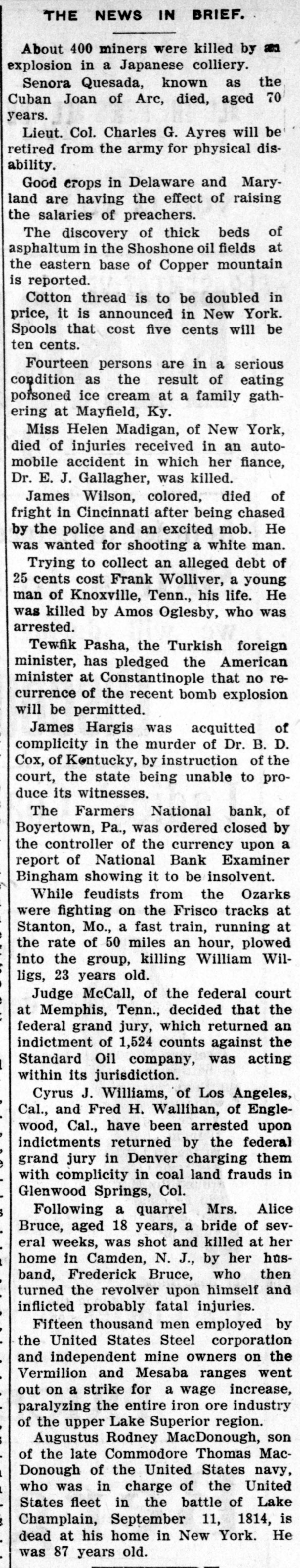 BUSINESS AND FINANCE White Knob 1/4 ....... ½ NEWS AND NOTES 13/4 1% 2½ W. Knob Cop. pr 2½ BONDS. WALL STREET 93 89 93 A. S. Found. 6s. 89 FOR INVESTORS. 82 85 85 Am Writ. Paper 82 67 Found. 6g flat 67 40 40 32 Co. R. Tire deb 4s 32 Active stocks were on an average lower BETTER FEELING PERVADES yesterday than they were in several years. Issues of twenty railroads were at about LOCAL SECURITIES. STOCK MARKET TODAY. 97, compared with 138. the high level last The appended hst of quotations on the year. Sirce December these stocks have active local is furnished by Herfallen 35 per cent. New York traction man J. Egner, room 606 Prudentis buildstocks have fallen to their low levels. Bid. Asked. Ing: After General Improvement, with a Gain Consolidated Traction Co 71% 70% 102 If the big slump had hit the small spec*Con. Traction Co. 5s of More Than a Point, Reac1023/4 131 129 Celluloid ulators relatively as much as it did the tion Sets In. 66 67 'J. Ho. & P. St Rv. 4s. big ones there would have been plenty 68 69 *North Jersey St. Rv. 4s of failures. The utter absence of failures 106 107 *Newark Passenger Ry. 5s shows that the richest men of the coun"Eliz. Plain & Cen Jersey 5s NEW YORK, Aug. 13.-A more confident 631/2 try. who are the ones carrying the burPublic Service int bearing etfs 641/4 94 feeling pervaded the stock market at the *Publie Service 5 p. e. notes. 931/4 dens, have been able to bear the strain. 90 93 Public Service stock opening which arose from the support ex129 131 *Newark Con. Gas 6s. 1944 Standard Oil stock sold down to $425 a tended the prices yesterday at the close "Newark Con. Gas 5s. 1948 1041/2 1051/4 share. the lowest price in a dozen years. 90 89 and the higher market in London this Newark Con. Gas stock The decline from the high level has been 118 117 Essex & Hudson Gas stock morning. Average gains were between ½ over $300 a share. John D. Rockefeller is 100 101 Pat. & Pas. Gas & Elec. 5s 64 68 and per cent. said to own 400,000. His shrinkage in the Pat. & Pas. Gas & Elec. -t~ck. 102 1011/4 *Hudson Co. Gas 5s end of his fortune has amounted to over 11 a. m.-The general improvement ex105 107 Hudson Co. Gas stock $120,000,000. his loss yesterday on this bases ceeded a point, reaching between 2 and 68 961/2 9732 S. J. Gas Elec. & Tr. was $16,000,000, or more than $50,000 a 115 113 Gas Elec & Trac. stock 2½ In Great Northern preferred, Northern 65 66 minute. *United Electric 4s. Pacific, Union Pacific, Amalgamated Cop53 55 Bergen Gas & Elec. stock 100 101 Bar silver has been declining for several per and Smelting. Reactions cut the ad*Newark City Water 4s. 1922 vance in two. 101 1021/2 *Essex Park 4s. 1938 days, both in New York and London, the *And interest. Noon-Advances were cancelled in the latter city being the leading market for silver. second hour. Reading. Canadian Pacific THE COTTON MARKET. and Great Northern preferred fell 1 below President Underwood. of the Erie. says yesterday's close, St. Louis Southwestern NEW YORK, Aug. 13.-The cotton marthere is no truth in the story that he is preferred 6%. Bonds were heavy. ket opened steady, at a decline of 4 to 6 to become interested in a new battery 1 p. m.-A bear raid against Amalpoints in response to lower cables, rumors manufacturing company in Milwaukee, in gamated Copper and St. Paul put them of rain in Texas and fear of further weakwhich many railroad men are reported to under yesterday's lowest at 70 and 118½, ness in Wall Street. Prices sold off to a be interested. respectively. Subsequent rally of 1 to 3 net decline of 8 to 9 points on the active lifted the general market well above yesmonths during the early session, but offerCoffee is from 10 to 15 points lower beterday's final figures. ings were not very heavy, and the market cause of the bearish reports from Europe. 2P. M.-Speculation become rather buoywas a shade steadier in the middle of the The Imperial Japanese government 6 per ant in tone after 1 o'clock, and the best morning on the possibility of unfavorable cent. sterling loan, issued partly in Noprices of the day were made. Smelting weekly reports from the weather bureau vember. 1904, will be redeemed at par and jumped 41/2 beyond yesterday's closing, at midday and local covering. Owing to accrued interest to September 10 next, at Northern Pacific 4½, Union Pacific 3%. the strike, news from the South was 6 per cent. per annum. Reading 2%. Amalgamated Copper 21/2 and scarce and all figures were slow in reachthe rest between and 2 points. ing the exchange. The Public Service Commission of New 3 p. m.-The market closed quiet and The market steadied up to within 2 or 3 York has decided to investigate the strong. Gains were extended in the last points of last night's finals during the suburban railroad service of the New York hour. Louisville and Nashville got up 5 late forenoon on a bullish Southern condiCentral Railroad. with a jump of 3 points between transaction report, but eased off again to about tions, Union Pacific 41/8, Consolidated Gas the previous low level on reports of rain New York city had another bond sale 4, Great Northern preferred 3%, Amalgain Texas. and prices at midday were failure. After two weeks of advertising mated Copper 31/2, Canadian Pacific 3%. about 7 to 8 points net lower bids for $13,000,000 fifty year 4 per cent. Reading 31/4. The market vielded a fracQuotations furnished by Van Schaick & Co. bonds ard $2,000,000 ten year 4 per cent. 2:50 tion afterwards on realizing. assessment bonds were opened it was Open. High. Low. P.M. found the total bids amounted to only 12.22 12.25 12.12 12.24 January NEW YORK STOCK MARKET PRICES. $2,713,485. 11.50 11.53 11.53 11.44 September 12.02 12.03 12.00 11.92 October Following are the quotations of the day's T. A. McIntyre & Co. any: "We feel the 12.04 12.15 12.15 12.13 December prices, as furnished through Byrne & Mc. country cannot be forced into ruin. and Donnell, 800 Broad street: those who can afford to buy stocks on the Op