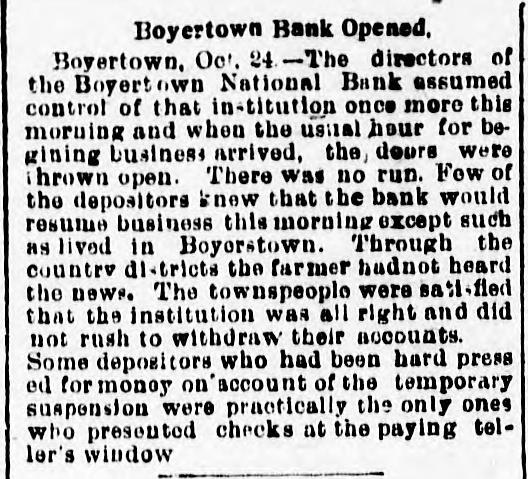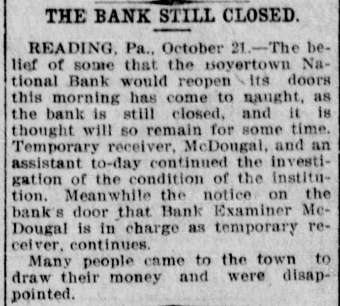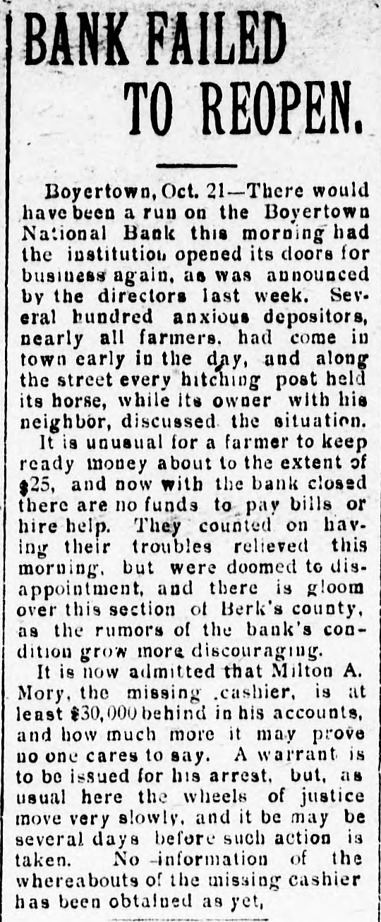TELEGRAPHIC BREVITIES The Duke of York received a grand welcome upon his arrival at Halifax, N. S., today. Mother Josephine of the Ursuline convent at Alton Ills. died yesterday from apoplexy. She had been connected with the order for over sixty years. The steamer Manchester Shipper, which went asbore on Petrie Ledge, off Sydney, N. S., Friday was still on the rocks at one o'clock this afternoon. All the passengers are safe. The Hitchins House, a leading hostery at Hoston, Tex, was almost entirely destroyed by fire this morning. One fatality 18 known to have resulted. The hotel was filled with guests. Nineteen burglars raided Mendota, III., last night and secured valuable plunder. Several citizens bad a fight with the burglars. A policeman was killed and another citizen severely injured. Miss Agnes M. Gill, a pretty girl, still in her teens, is performing the duties of Governor of New Jersey while Governor Vorhees and his staff are at Buffalo. Everybody calls her "Governor." A month ago Joseph Wagner, a helper in the Hotel Rathbun kitchen in Elmira, N. Y., received $700 from bis father's estate, This he aquandered in riotous living and last night, rather than face his family with no money, be committed suicide by taking carbolic acid. Because his father refused to furnish him with spending money, G. Wilson Smoyer, a prominent young man of Allentown, Pa., yesterday made an attempt to poison both his parents, Mr. and Mrs. Benjamin A. Smoyer. Both are in a criticalcondition. The doctors have no hope for the recovery of Mrs. Smoyer. Two engines drawing a heavy freight train on the Central Railroad of Georgia, went through a trestle at Leeds, Ala., this morning, falling 40 feet, followed by five cars. Engineer Webster was probably fatally burt, and Engineer Vaughan and Fireman Car" roll badly injured. Fireman Hunter was killed. Mark Wood, a tramp, suffered a broken leg. Cashier Mory, of the closed National Bank of Boyerton, Pa., is still missing, but the directors of the institution are breathing freely. The discrepancy of $2,000 which had appeared just after the $165,000 in bonds were located in Philadelphia yesterday, has also been accounted for and the officials today are certain that not a cent is missing. It is now said the bank will be reopened on Monday, The hotel at Berlin, N.H, was gutted by fire early this morning. The inmates of the house succeeded in getting out in safety with the exception of Albert Clarke, a traveling man of Manchester. Vt., who, finding escape by the stairs cut off, jumped from a window and was fatally injured. The entire family, consisting of seven persons, of Superintendent John Kessler, were chloroformed at their home in Carlstadt, two miles from Passaic, N. J., last night by snesk thieves. The men secured about $500 worth of valuables. There is no clue. Rear Admiral Francis M. Bunce, U. S. N., died at Hartford, Conn., today. In July the admiral was operated on in Boston for cancer on the tongue and since his return home had failed steadily. He leave; & widow and two children. Mr. Wood Benson, aged 95 years, died in the Hampshire county, W Va., alms house Thursday. Mr. Benson wasthe first locomotive engineer to run a regular trip in the United States. The Paris, Ky., court house is burning. A strong wind is blowing and there is no hope of saving the structure. The building is one of the finest in the State and cost $175,000. Mrs. Lena G. Hoey, the widow of "Old Hoss" Hoey, is dead. Mrs. Hoey was one of the famous French sisters.