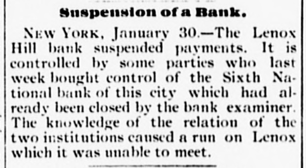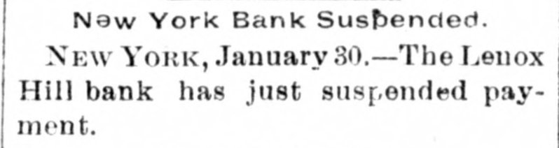 Suspension of a Bank. NEW YORK, January 30.-The Lenox Hill bank suspended payments. It is controlled by some parties who last week bought control of the Sixth National bank of this city which had already been closed by the bank examiner. The knowledge of the relation of the two institutions caused a run on Lenox which it was unable to meet.