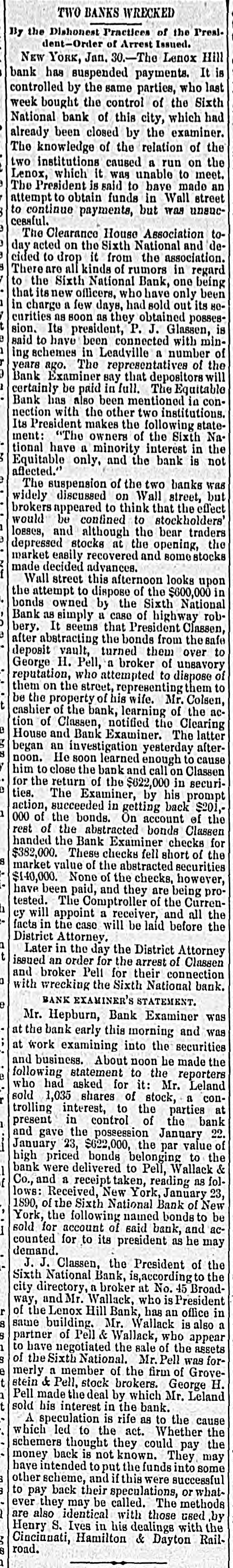 TWO BANKS WRECKED By the Dishonest Practices of the President-Order of Arrest Issued. NEW YORK, Jan. 30.-The Lenox Hill bank has suspended payments. It is controlled by the same parties, who last week bought the control of the Sixth National bank of this city, which had already been closed by the examiner. The knowledge of the relation of the one uo uns B cansed OM1 Lenox, which it was unable to meet. The President is said to have made an attempt to obtain funds in Wall street to continue payments, but was unsuccessful. The Clearance House Association today acted on the Sixth National and decided to drop it from the association. There are all kinds of rumors in regard Sujeq euo Lund National TXIS our of that its new officers, who have only been in charge a few days, had sold out its NOcurities as soon as they obtained possession. Its president, P. J. Glassen, is said to have been connected with mining schemes in Leadville a number of years ago. The representatives of the Bank Examiner say that depositors will certainly be paid in full. The Equitable Bank has also been mentioned in connection with the other two institutions. Its President makes the following statement: "The owners of the Sixth National have a minority interest in the Equitable only, and the bank is not affected.' The suspension of the two banks was widely discussed on Wall street, but brokers appeared to think that the effect would be confined to stockholders' losses, and although the bear traders depressed stocks at the opening, the market easily recovered and stocks made decided advances. Wall street this afternoon looks upon the attempt to dispose of the $600,000 in bonds owned by the Sixth National Bank as simply a case of highway robbery. It seems that President Classen, after abstracting the bonds from thesafe deposit vault, turned them over to George H. Pell, a broker of unsavory reputation, who attempted to dispose of them on the street, representing them to be the property of his wife. Mr. Colsen, cashier of the bank, learning of the action of Classen, notified the Clearing House and Bank Examiner. The latter began an investigation yesterday afternoon. He soon learned enough to cause him to close the bank and call on Classen for the return of the $622,000 in securities. The Examiner, by his prompt action, succeeded in getting back $201,000 of the bonds. On account of the rest of the abstracted bonds Classen handed the Bank Examiner checks for $382,000. These checks fell short of the market value of the abstracted securities $140,000. None of the checks, however, have been paid, and they are being protested. The Comptroller of the Currency will appoint a receiver, and all the facts in the case will be laid before the District Attorney. Later in the day the District Attorney issued an order for the arrest of Classen and broker Peli for their connection with wrecking the Sixth National bank. BANK EXAMINER'S STATEMENT. Mr. Hepburn, Bank Examiner was at the bank early this morning and was at work examining into the securities and business. About noon he made the following statement to the reporters who had asked for it: Mr. Leland sold 1,035 shares of stock, a controlling interest, to the parties at present in control of the bank and gave the possession January 22. January 23, $622,000, the par value of high priced bonds belonging to the bank were delivered to Pell, Wallack & Co., and a receipt taken, reading as follows: Received, New York, January 23, 1890, of the Sixth National Bank of New York, the following named bonds to be sold for account of said bank, and accounted for to its president as he may demand. T Classen the Prosident
