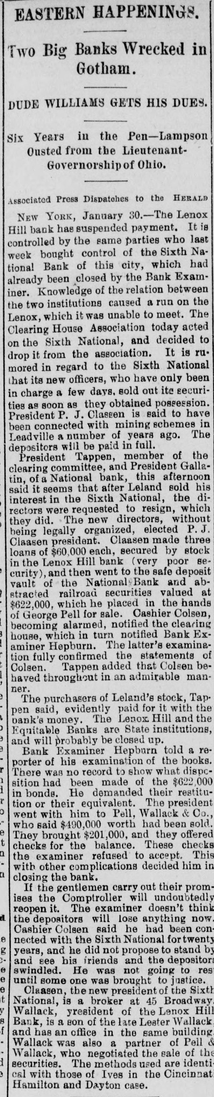EASTERN HAPPENINGS. Two Big Banks Wrecked in Gotham. DUDE WILLIAMS GETS HIS DUES. Six Years in the Pen-Lampson Ousted from the LieutenantGovernorship of Ohio. Associated Press Dispatches to the HERALD New YORK, January 30.-The Lenox Hill bank has suspended payment. It is controlled by the same parties who last week bought control of the Sixth National Bank of this city, which had already been closed by the Bank Examiner. Knowledge of the relation between the two institutions caused a run on the Lenox, which it was unable to meet. The Clearing House Association today acted on the Sixth National, and decided to drop it from the association. It is rumored in regard to the Sixth National that its new officers, who have only been in charge a few days, sold out ite securities as soon as they obtained possession. President P. J. Classen is said to have been connected with mining schemes in Leadville a number of years ago. The depositors will be paid in full. President Tappen, member of the clearing committee, and President Gallatin, of a National bank, this afternoon said it seems that after Leland sold his interest in the Sixth National, the directors were requested to resign, which they did. The new directors, without being legally organized, elected P. J. Claasen president. Claasen made three loans of $60,000 each, secured by stock in the Lenox Hill bank (very poor security), and then went to the safe deposit vault of the National Bank and abstracted railroad securities valued at $622,000, which he placed in the hands of George Pell for sale. Cashier Colsen, becoming alarmed, notified the clearing house, which in turn notified Bank Examiner Hepburn. The latter's examination fully confirmed the statements of Colsen. Tappen added that Colsen behaved throughout in an admirable manner. The purchasers of Leland's stock, Tap. pen said, evidently paid for it with the bank's money. The Lenox Hill and the Equitable Banks are State institutions, and will probably be closed up. Bank Examiner Hepburn told a reporter of his examination of the books. There was no record to show what dispcsition had been made of the $622,000 in bonds. He demanded their restitution or their equivalent. The president b went with him to Pell, Wallack & Co., who said $490,000 worth had been sold. e They brought $201,000, and they offered t checks for the balance. These checks n the examiner refused to accept. This with other complications decided him in a closing the bank. If the gentlemen carry out their promises the Comptroller will undoubtedly reopen it. The examiner doesn't think a the depositors will lose anything now. Cashier Colsen said he had been conle nected with the Sixth National for twenty g years, and he did not propose to stand by Cand see his friends and the depositors e swindled. He was not going to res e until some one was brought to justice. e Claasen, the new president of the Sixth t National, is a broker at 45 Broadway y Wallack, yresident of the Lenox Hill 8 Bank, is a son of the late Leater Wallack f and has an office in the same building Wallack was also a partner of Pell & Wallack, who negotiated the sale of the d securities. The methods used are identie cal with those of Ives in the Cincinnati Hamilton and Dayton case.
