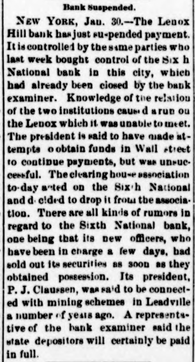 A Bank Scandal. NEW YORK, Jan. 30.-The Lenox Hill bank has just suspended payment. It is controlled by the same parties who last week bought control of the Sixth National bank of this city which had already been closed by the bank examiner. Knowledge of the relation of the two institutions caused a run on the Lenox which it was unable to meet. The Clearing House Association to day acted on the Sixth National and decided to drop it from the association. It is rumored in regard to the Sixth National that its new officers who have only been in charge a few days had sold out its securities as soon as they obtained possession. President P.J. Claassen is said to have been connected with mining schemes in Leadville a number of years ago. D₃positors will be paid in full.