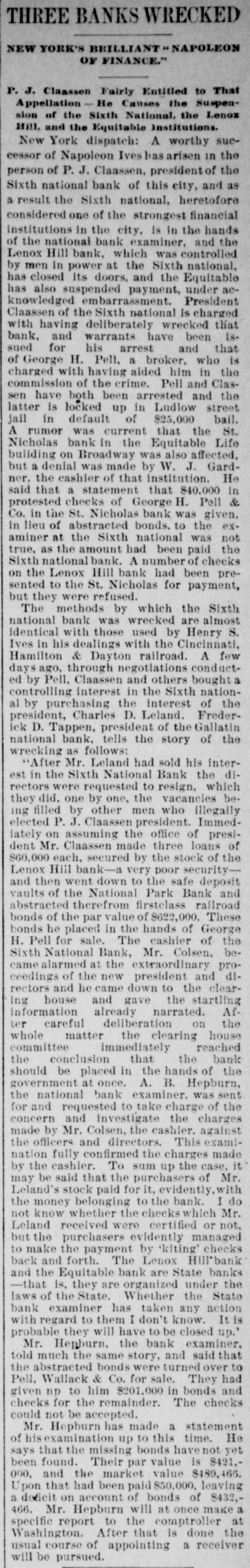REE BANKS WRECKED 7 YORK'S BRILLIANT " NAPOLEON "TONVNIA 40 . Claassen Fairly Entitled to That pellation - He Causes the Suspenn of the Sixth National, the Lenox 1, and the Equitable Institutions. w York dispatch: A worthy sucor of Napoleon Ives has arisen in the on of P. J. Claassen, president of the h national bank of this city, and as sult the Sixth national, heretofore idered one of the strongest financial tutions in the city, is in the hands e national bank examiner, and the ox Hill bank, which was controlled en in power at the Sixth national, closed its doors, and the Equitable also suspended payment, under acvledged embarrassment. President ssen of the Sixth national is charged having deliberately wrecked that c, and warrants have been isfor his arrest and that eorge H. Pell, a broker, who is ged with having aided him in the mission of the crime. Pell and Clashave both been arrested and the street up dn Iooked si J in default of $25,000 bail. umor was current that the St. olas bank in the Equitable Life ding on Broadway was also affected, a denial was made by W. J. Gardthe cashier of that institution. He that a statement that $40,000 in ested checks of George H. Pell & in the St. Nicholas bank was given, eu of abstracted bonds, to the exher at the Sixth national was not . as the amount had been paid the h national bank. A number of checks he Lenox Hill bank had been preed to the St. Nicholas for payment, they were refused. he methods by which the Sixth onal bank was wrecked are almost tical with those used by Henry S. in his dealings with the Cincinnati, ilton & Dayton railroad. A few $ ago, through negotiations conducty Pell, Claassen and others bought a rolling interest in the Sixth nationy purchasing the interest of the ident, Charles D. Leland. FrederD. Tappen, president of the Gallatin onal bank, tells the story of the cking as follows: After Mr. Leland had sold his interin the Sixth National Bank