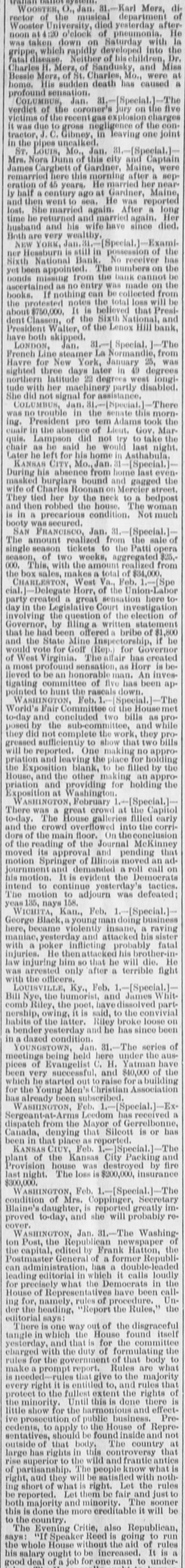 WOOSTER, On Jan. 81,-Karl Merz, di rector of the musical department Wooster University, died yesterday after noon at 4:20 o'clock of pneumonia, H was taken down on Saturday with grippe, which rapidly developed into the fatal disease, Neither of his children, Dr Charles H. Merz, of Sandusky and Mis Bessie Merz, of St. Charles, Mo., were a home. His sudden death has caused profound sensation. COLUMBUS, Jan. 81,-[Special.]-The verdiet of the coroner's jury on the five victims of the recent gasexplosion charges it was due to gross negligence of the con tractor, J. C. Gibney, in leaving one joint in the pipes uncalked. ST. LOUIS, Mo., Jan. 31,-[Special.] Mrs. Nora Dunn of this city and Captain James Cargbett of Gardner, Maine, were remarried here this morning after a seperation of 45 years. He married her near ly half a century ago at Gardner, Maine, and then went to sea, He was reported lost. She married again. After a long time he returned and married again. Her husband and his wife have since died. Both are very wealthy. NEW YORK, ner Hessburn is still in possession of the Sixth National Bank. No receiver has yet been appointed. The numbers on the bonds missing from the bank cannot be ascertained as no entry was made on the books. If nothing can be collected from the protested notes the total loss will be about $750,000. It is believed that President Classen, of the Sixth National, and President Walter, of the Lenox Hill bank, have both skipped. LONDON, Jan. 81.-1 Special. ]-The French Line steamer La Normandie, from Havre for New York, January 25, was sighted three days later in 49 degrees northern latitude 23 degrees west longitude with her machinery partly disabled. She did not signal for assistance. COLUMBUS, Jan. was no trouble in the senate this morning. President pro tem Adams took the chair in the absence of Lieut. Gov. Marquis. Lampson did not try to take the chair as he said he would last night. Later he left for his home in Asthabula. KANSAS CITY, Mo., Jan. 31 [Special.] During his absence from home last evenmasked burglars bound and gagged the wife of Charles Roonan on Mercier street. They tied her by the neck to a bedpost and then robbed the house. The woman is in a precarious condition. Not much booty was secured. SAN FRANCISCO, Jan. 31.-[Special.]The amount realized from the sale of single season tickets to the Patti opera season, of two weeks, aggregated $25.000. This, with the amount realized from the box sales, makes a total of $34,000. CHARLESTON, West Va., Feb. 1,-[Spe cial.]-Delegate Horr, of the Union-Labor party created a great sensation here today in the Legislative Court investigation involving the question of the election of Governor, by filing a written statement that he had been offered a bribe of $1,800 and the State Mine Inspectorship, if he would vote for Goff (Rep for Governor of West Virginia. The affair has created a most profound sensation, as Horr in believed to be an honorable man. An investigating committee of five has been appointed to hunt the rascals down. WASHINGTON, Feb. 1. Special. World's Fair Committee of the Housemet to-day and concluded two bills as proposed by the sub-committee, and while they did not complete the work, they progressed sufficiently to show that two bills will be reported. One making no appropriation and leaving the place for holding the Exposition blank, to be filled by the House, and the other making an appropriation and providing for holding the Exposition at Washington. WASHINGTON, February [Special.] There was a great crowd at the Capitol to-day. The House galleries filled early and the crowd overflowed into the corridors of the main floor. On the conclusion of the reading of the Journal McKinney moved its approval and pending that motion Springer of Illinois moved an adjournment and demanded a roll call on his motion. It is evident the Democrats intend to continue yesterday's tactics. The motion to adjourn was defeated yeas 135, nays 158. WICHITA, Kan., Feb. 1.-[Special.]George Black, a young man doing business here, became violently insane, a raving maniac, yesterday and attacked his sister with a poker inflicting probably fatal injuries. He thenattacked his brother-inlaw injuring him so that he will die. He was arrested only after a terrible fight with the officers. LOUISVILLE, Ky., Feb. 1.-[Special.] Bill Nye, the humorist, and James Whitcomb Riley, the poet, havedissolved partnership, owing, it is said, to the convivial habits of the latter. Riley broke loose on a bender yesterday and he has since been in a dazed condition. YOUNGSTOWN, Jan. 31.-The series of meetings being held here under the auspices of Evangelist C. H. Yatman have been very successful, and $40,000 of the which he started out to raise for building for the Young Men's Christian Association has already been subscribed. WASHINGTON, Feb. 1.-[Special.]-ExSergeant-at-Arms Leedom has received a dispatch from the Mayor of Gerrelbonne, Canada, denying that Silcott is or has been in that place as reported. KANSAS CIUY, Feb. 1,- Special.]-The plant of the Kansas City Packing and Provision house was destroyed by fire last night. The loss is $200,000, insurance $300,000. WASHINGTON, Feb. 1.-[Special.]-The condition of Mrs. Coppinger, Secretary Blaine's daughter, is reported greatly improved to-day, and she will probably recover. WASHINGTON, Jan. 31.-The Washington Post, the Republican newspaper of the capital, edited by Frank Hatton, the Postmaster General of a former Republican administration, has a double-leaded leading editorial in which it calls loudly for precisely what the Democrats in the House of Representatives have been calling for, namely, rules of procedure. Under the heading, "Report the Rules," the editorial says: There is one way out of the disgraceful tangle in which the House found itself yesterday, and that is for the committee charged with the duty of formulating the rules for the government of that body to make a prompt report. Rules are wha