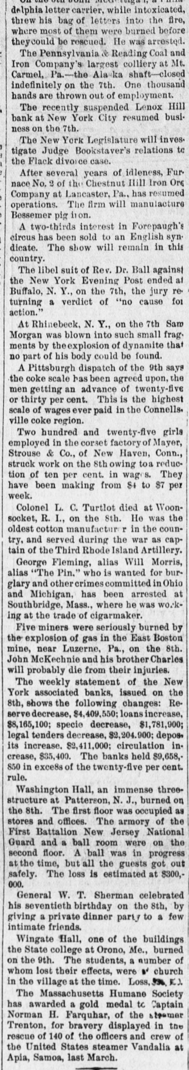 delphia letter carrier, while intoxicated, threw his bag of letters into the fire, where most of them were burned before theycould be rescued. He was arrestęd. The Pennsylvania & Reading Coal and Iron Company's largest colliery at Mt. Carmel, Pa.-the Alaska shaft-closed indefinitely on the 7th. One thousand hands are thrown out of employment. The recently suspended Lenox Hill bank at New York City resumed business on the 7th. The New York Legislature will inves. tigate Judge Bookstaver's relations to the Flack divoice case. After several years of idleness, Furnace No. 2 of the Chestnut Ilill Iron Ore Company at Lancaster, Pa., has resumed operations. The firm will manulacture Bessemer pig iion. A two-thirds interest in Forepaugh's eircus has been sold to an English syn. dicate. The show will remain in this country. The libel suit of Rev. Dr. Ball against the New York Evening Post ended at Buffalo, N. Y., on the 7th, the jury returning a verdict of "no cause foi action." At Rhinebeck, N. Y., on the 7th Sam Morgan was blown into such small frag. ments by the explosion of dynamite that no part of his body could be found. A Pittsburgh dispatch of the 9th says the coke scale has been agreed upon, the men getting an advance of twenty-five or thirty per cent. This is the highest scale of wages ever paid in the Connells. ville coke region. Two hundred and twenty-five girls employed in the corset factory of Mayer, Strouse & Co., of New Haven, Conn., struck work on the 8th owing toa reduction of ten per cent. in wages. They have been making from $4 to $7 per week. Colonel L. C. Turtlot died at Woonsocket, R. I., on the 8th. He was the oldest cotton manufacture r in the country, and served during the war as captain of the Third Rhode Island Artillery. George Fleming, alias Will Morris, alias "The Pin." who is wanted for burglary and other crimes committed in Ohio and Michigan, has been arrested at Southbridge, Mass., where he was working at the trade of cigarmaker. Five miners were seriously burned by the explosion of gas in the East Boston mine, near Luzerne, Pa., on the 8th. John McKechnie and his brother Charles will probably die from their injuries. The weekly statement of the New York associated banks, issued on the 8th, shows the following changes: Reserve decrease, $4,409,550; loans increase, $8,165,100; specie decrease, $1,781,900; legal tenders decrease, $2,204.900; depos, its increase. $2,411,000; circulation increase, $35,400. The banks held $9,658,850 in exce8s of the twenty-five per cent. rule. Washington Hall, an immense threestructure at Patterson, N. J., burned on the 8th. The first floor was occupied as stores and offices. The armory of the First Battalion New Jersey National Guard and a ball room were on the second floor. A ball was in progress at the time, but all the guests got out safely. The loss is estimated at $300,000. General W. T. Sherman celebrated his seventieth birthday on the 8th, by giving a private dinner party to a few intimate friends. Wingate Hall, one of the buildings the State college at Orono, Me., burned on the 9th. The students, a number of whom lost their effects, were church in the village at the time. Loss, $ E.). The Massachusetts Humane Society has awarded a gold medal tc Captain Norman H. Farquhar, of the stoemer Trenton, for bravery displayed in the rescue of 140 of the officers and crew of the United States steamer Vandalia at Apia, Samoa, last March.
