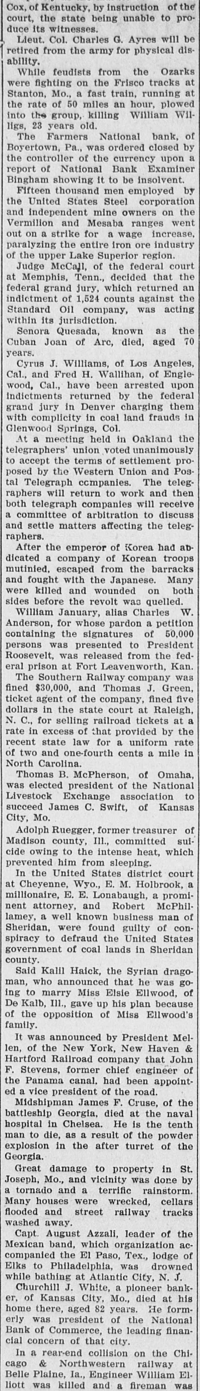 of Cox, of the Kentucky, state being by Instruction unable to will pro- be from retired court, duce Lieut. its witnesses. Col. the Charles army G. for Ayres physical disthe Ozarks at ability. While feudists the from Frisco running tracks at were fighting Mo., a on miles fast train, an hour, plowed Wilthe group, Stanton, the rate of 50 killing William of bank, ligs, into 23 years old. National closed by of Bank The Pa., was the currency Examiner the Boyertown, controller Farmers ordered upon by a report of showing National it men to be employed insolvent. Bingham thousand corporation the Pitteen United independent States mine Steel owners ranges on went the and Mesaba increase, of out Vermilion on a strike the and entire for a iron wage ore region. industry paralyzing the upper Lake of Superior the federal that court the Judge Memphis, McCall, Tenn., which decided returned the an federal at grand jury, counts against acting indictment Oil of 1,524 company, was the Joan within Standard Senora its Quesada, jurisdiction.nown of Arc, died, aged as 70 years. Cuban J. Williams, Wallihan, of Los of Angeles, Englewood, Cal., Cyrus and Cal., Fred have returned H. been by arrested the federal them upon indictments jury in Denver coal charging land frauds in with grand complicity in Col. the Glenwood Springs, held in Oakland a meeting voted unanimously protelegraphers' At accept the union terms of Union settlement and Posto by the Western The teleg- then work to receive raphers telegraph companies to posed tal Telegraph will return ccmpanies. arbitration will and discuss a both committee of affecting the telegAfter of the emperor of Korean troops and raphers. settle company matters Korea barracks had Many ab mutinied. dicated a escaped with the from Japanese. the both fought wounded on and sides were before killed and the revolt alias was Charles quelled. W. Anderson, William January, pardon a petition for the whose signatures to of President 50,000 was from the Roosevelt, was Fort containing persons at presented released Leavenworth, company Kan. was federal prison Southern Railway J. Green, The $30,000, and company, Thomas fined five of the at Raleigh, in the state tickets C., for that provided fined dollars N. ticket agent selling of railroad court uniform by at rate the a rate in excess for a mile of two and recent state one-fourth law cents a in Omaha, North Thomas Carolina. B. McPherson, of the of National to elected president association Livestock was James Exchange C. Swift, of Kansas county, heat, Adolph Mo. Ruegger, Ill., former committed which suiCity, succeed Madison owing to the intense sleeping. treasurer court of United prevented cide him from district a at In Cheyenne, the E. Wyo., E. States Lonabaugh, E. M. Holbrook, McPhil- promi- of a millionaire, and Robert man lamey, a were found nent attorney, well known business of conspiracy to defraud of coal lands in Kalil Haick, the he was government Sheridan, county. Said the that guilty United Syrian Sheridan States drago- go- of man, who announced Miss Elsie Ellwood, because ing to marry Ill., gave up his Miss plan Ellwood's of De the Kalb, opposition of Melfamily. It was announced York, by New President Haven & of the Railroad company engineer Stevens, former been len, Hartford New chief that appoint- John of F. Panama canal. had road. the the president of the Cruse, ed Midshipman a vice James F. at the of naval battleship Georgia, died He is the tenth hospital in Chelsea. result of the powder the explosion man to die, in as the a after turret of St. Georgia. damage to property done in Great and vicinity was rainstorm. by Joseph, Mo., and a terrific cellars a houses were away. Azzali, leader Capt. band, which lodge Mexican the El Paso, flooded companied Many washed tornado and August street wrecked, organization railway was Tex., drowned of tracks the ac- of J. while Elks to bathing Philadelphia, at White, Atlantic a pioneer City, N.J. bank- his Churchill of Kansas City, Mo., died He at former, home there, aged 82 years. of the National cial concern of that erly Bank was of Commerce, president the city. leading finanChirear-end collision on railway the at In a & Northwestern William Elliott cago Belle was Plaine, killed Ia., Engineer and a fireman was