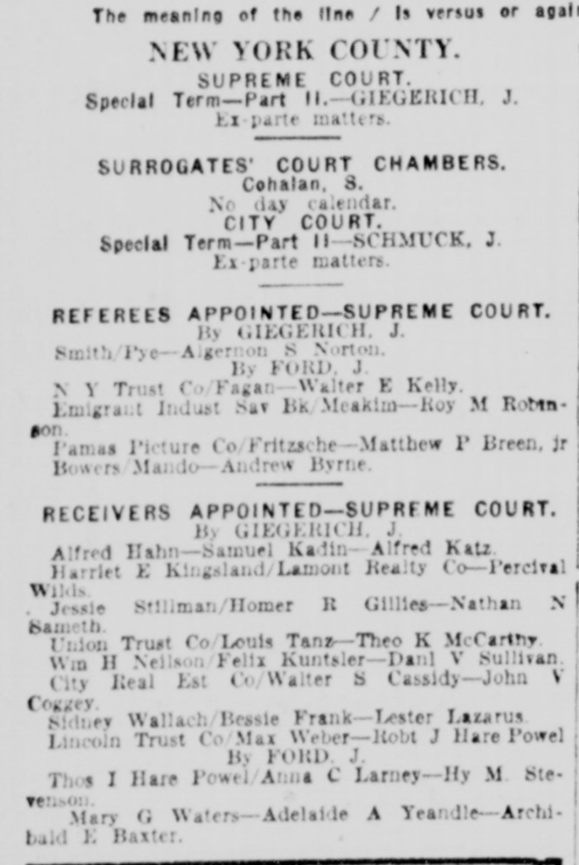 The meaning of the line / Is versus or again NEW YORK COUNTY. SUPREME COURT. Special Term-Part H.-GIEGERICH, J. Ex-parte matters. SURROGATES' COURT CHAMBERS. Cohalan, 8. No day calendar. CITY COURT. Special Term-Part H-SCHMUCK, J. Ex-parte matters. REFEREES APPOINTED-SUPREME COURT. By GIEGERICH, J. Smith/Pye-Algernon S Norton. By FORD, J. N Y Trust Co/Fagan-Walter E Kelly. Emigrant Indust Sav Bk/Meakim-Roy M Robinson. Pamas Picture Co/Fritzsche-Matthew P Breen, jr Bowers/Mando-Andrew Byrne. RECEIVERS APPOINTED-SUPREME COURT. By GIEGERICH, J. Alfred Hahn-Samuel Kadin-Alfred Katz. Harriet E Kingsland/Lamont Realty Co-Percival Wilds. Jessie Stillman/Homer R Gillies-Nathan N Sameth. Union Trust Co/Louis Tanz-Theo K McCarthy. Wm H Neilson/Felix Kuntsler-Danl V Sullivan. City Real Est Co/Walter S Cassidy-John V Coggey. Sidney Wallach/Bessie Frank-Lester Lazarus. Lincoln Trust Co/Max Weber-Robt J Hare Powel By FORD. J. Thos I Hare Powel/Anna C Larney-Hy M. Stevenson. Mary G Waters-Adelaide A Yeandle-Archibald E Baxter.