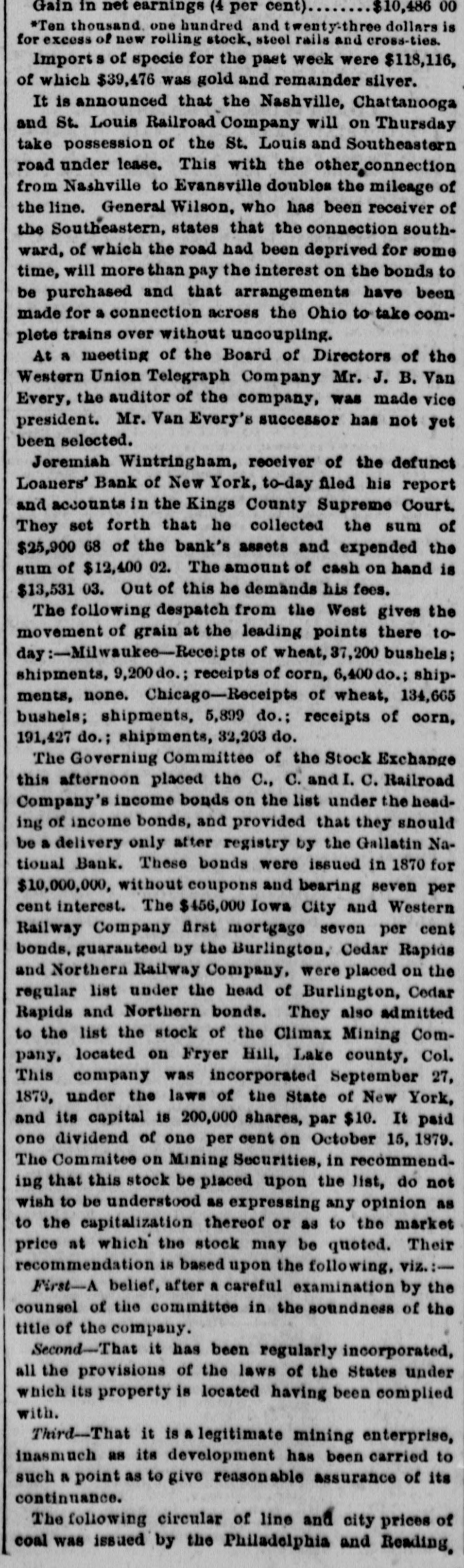 Gain in net earnings (4 per cent) $10,486 00 *Ten thousand, one hundred and twenty-three dollars is for excess of new rolling stock, steel rails and cross-ties. Imports of specie for the past week were $118,116, of which $39,476 was gold and remainder silver. It is announced that the Nashville, Chattanooga and St. Louis Railroad Company will on Thursday take possession of the St. Louis and Southeastern road under lease. This with the other connection from Nashville to Evansville doubles the mileage of the line. General Wilson, who has been receiver of the Southeastern, states that the connection southward, of which the road had been deprived for some time, will more than pay the interest on the bonds to be purchased and that arrangements have been made for a connection across the Ohio to take complete trains over without uncoupling. At a meeting of the Board of Directors of the Western Union Telegraph Company Mr. J. B. Van Every, the auditor of the company, was made vice president. Mr. Van Every's successor has not yet been selected. Jeremiah Wintringham, receiver of the defunct Loaners' Bank of New York, to-day filed his report and accounts in the Kings County Supreme Court. They set forth that he collected the sum of $25,900 68 of the bank's assets and expended the sum of $12,400 02. The amount of cash on hand is $13,531 03. Out of this he demands his fees. The following despatch from the West gives the movement of grain at the leading points there to-day:-Milwaukee-Receipts of wheat, 37,200 bushels; shipments, 9,200 do.; receipts of corn, 6,400 do.; shipments, none. Chicago-Receipts of wheat, 134,665 bushels; shipments, 5,899 do.; receipts of corn, 191,427 do.; shipments, 32,203 do. The Governing Committee of the Stock Exchange this afternoon placed the C., C. and I. C. Railroad Company's income bonds on the list under the heading of income bonds, and provided that they should be a delivery only after registry by the Gallatin National Bank. These bonds were issued in 1870 for $10,000,000, without coupons and bearing seven per cent interest. The $456,000 Iowa City and Western Railway Company first mortgage seven per cent bonds, guaranteed by the Burlington, Cedar Rapids and Northern Railway Company, were placed on the regular list under the head of Burlington, Cedar Rapids and Northern bonds. They also admitted to the list the stock of the Climax Mining Company, located on Fryer Hill, Lake county, Col. This company was incorporated September 27, 1879, under the laws of the State of New York, and its capital is 200,000 shares, par $10. It paid one dividend of one per cent on October 15, 1879. The Commitee on Mining Securities, in recommending that this stock be placed upon the list, do not wish to be understood as expressing any opinion as to the capitalization thereof or as to the market price at which the stock may be quoted. Their recommendation is based upon the following, viz.: First-A belief, after a careful examination by the counsel of the committee in the soundness of the title of the company. Second-That it has been regularly incorporated, all the provisions of the laws of the States under which its property is located having been complied with. Third-That it is a legitimate mining enterprise, inasmuch as its development has been carried to such a point as to give reasonable assurance of its continuance. The following circular of line and city prices of coal was issued by the Philadelphia and Reading,