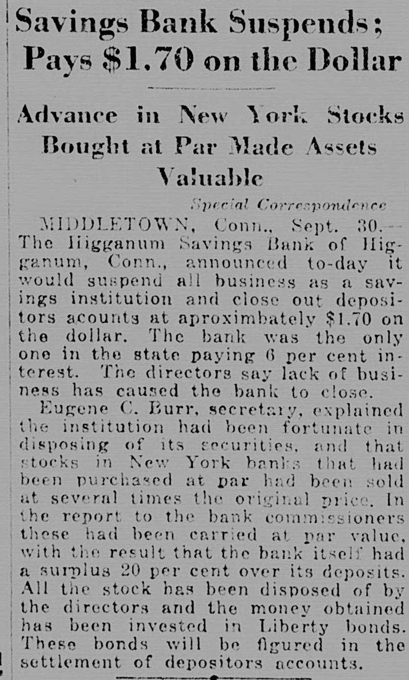 Savings Bank Suspends ; Pays $1.70 on the Dollar Advance in New York Stocks Bought at Par Made Assets Valuable Special Correspondence MIDDLETOWN, Conn.. Sept. 30. The liigganum Savings Bank of Higganum, Conn., announced to-day it would suspend all business as a savings institution and close out depositors acounts at aproximbately $1.70 on the dollar. The bank was the only one in the state paying 6 per cent interest. The directors say lack of business has caused the bank to close. Eugene C. Burr, secretary, explained the institution had been fortunate in disposing of its securities, and that stocks in New York banks that had been purchased at par had been sold at several times the original price. In the report to the bank commissioners these had been carried at par value. with the result that the bank itself had a surplus 20 per cent over its deposits. All the stock has been disposed of by the directors and the money obtained has been invested in Liberty bonds. These bonds will be figured in the settlement of depositors accounts.
