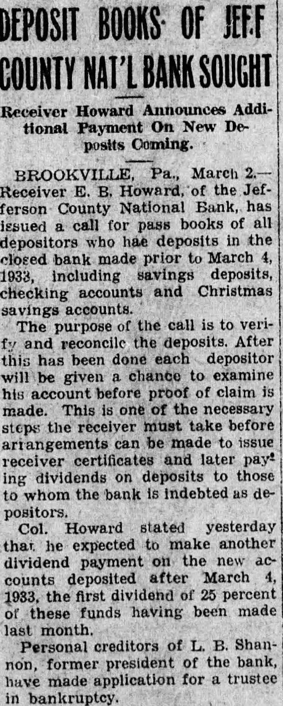 REPAYMENTS Greater Than Loans. R. F. C. Reports Operations For Third Quarter. Closed Banks Get $122,500,000 Of Since For mation 2.6 Billions. Washington, November -The Reconstruction Corporation received more money in repayments during the last three months than it loaned to aid business and agriculture. A summary of the corporation's report for the third quarter, ended September 30, disclosed today that it had disbursed and received repayments totaling $238 186,400 that the corporation had nearly half mil lion dollars less outstanding than June From the time of its formation February the corporation has disbursed authorizations totaling During third quarter the corporation loaned and trust companies of which $122,500,226 reorganization or liquidation of closed banks. Loans Are Iltemized. Loans to building and loan associations insurance companies, $1,525,100 credit unions, $20,663,842 joint stock land banks. corporations, $470,520; rediscounts for gional agricultural credit corporations, $30,015,863; Federal land banks, $5,000,000; credit corporations, $400,000, and railroads Under the 1932 Emergency Relief Act, 19 loans aggregating $55,355,293 authorized and under another section $53,880,543 loaned for financial sales agricultural surpluses foreign markets and to finance orderly keting agricultural commodities and live stock banks on preferred during the quarter totaled and subscriptions for preferred banks companies $19,337,500 The corporation purchased of bank debentures. Cotton Loan Listed. In connection with the stock was said that September 30 many millions of dollars and debentures either have their purchase authorized During the quarter the Secretary of Agriculture allowed $3,500,000 with which purchase The opening National Banks during the first 10 days of Novem announced by D'Connor to have restored $16,084.000 in deposits. During the same period six National Banks had their reorganization plans approved by the Treasury. involving $2,825,000 The reported that with zation have been declared insolvent and appointed These the Jefferson County National Bank of Brookville, Pa., with and the Central City Bank of Central City, Neb., with $98,000 in deposits.