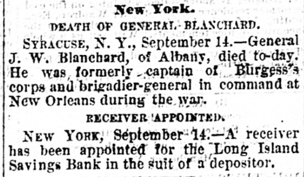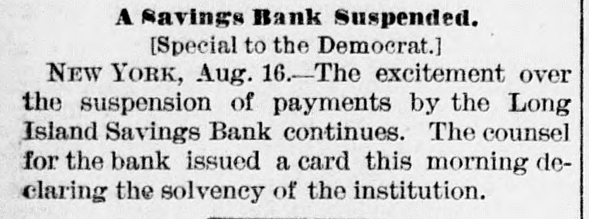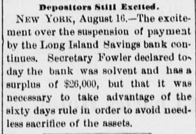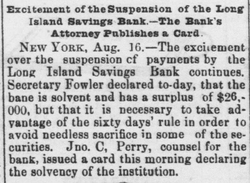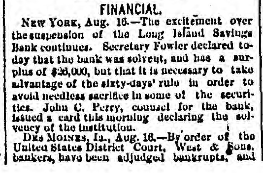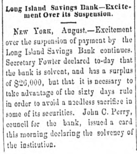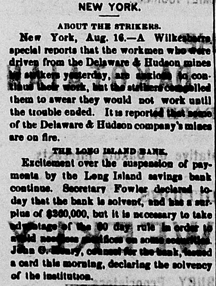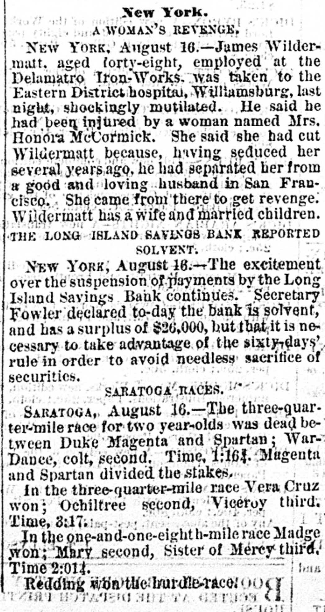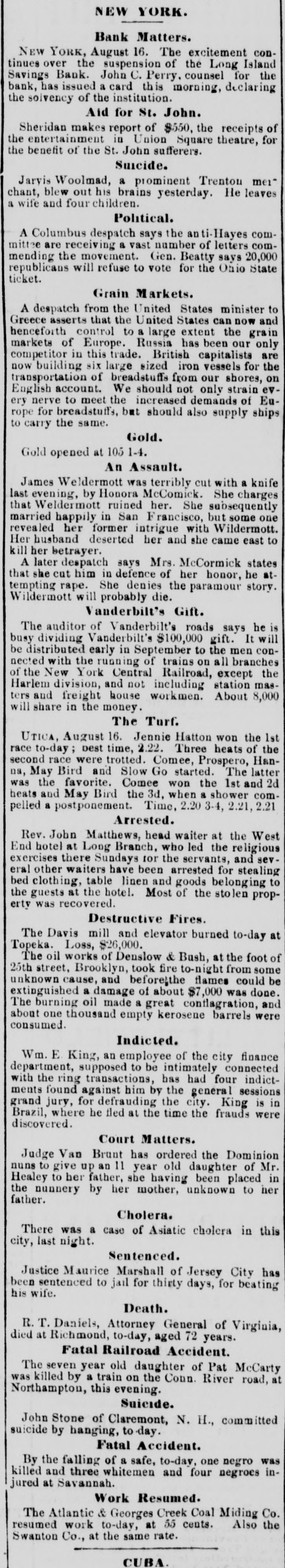 NEW YORK. Bank Matters. NEW YORK, August 16. The excitement continues over the suspension of the Long Island Savings Bank. John C. Perry. counsel for the bank, has issued a card this morning, declaring the solvency of the institution. Aid for St. John. Sheridan makes report of $550, the receipts of the entertainment in Union Square theatre, for the benefit of the St. John sufferers. Suicide. Jarvis Woolmad, a prominent Trentou mer" chant, blew out his brains yesterday. He leaves a wife and four children. Political. A Columbus despatch says the anti-Hayes committee are receiving a vast number of letters commending the movement. Gen. Beatty says 20,000 republicans will refuse to vote for the Ohio State ticket. Grain Markets. A despatch from the United States minister to Greece asserts that the United States can now and henceforth control to a large extent the grain markets of Europe. Russia has been our only competitor in this trade. British capitalists are now building six large sized iron vessels for the transportation of breadstuffs from our shores, on English account. We should not only strain every nerve to meet the increased demands of Europe for breadstuffs, but should also supply ships to carry the same. Gold. Gold opened at 105 1-4. An Assault. James Weldermott was terribly cut with a knife last evening, by Honora McComick. She charges that Weldermott ruined her. She subsequently married happily in San Francisco, but some one revealed her former intrigue with Wildermott. Her husband deserted her and she came east to kill her betrayer. A later despatch says Mrs. McCormick states that she cut him in defence of her honor, he attempting rape. She denies the paramour story. Wildermott will probably die. Vanderbilt's Gift. The auditor of Vanderbilt's roads says he is busy dividing Vanderbilt's $100,000 gift. It will be distributed early in September to the men connected with the running of trains on all branches of the New York Central Railroad, except the Harlem division, and not including station masters and freight house workmen. About 8,000 will share in the money. The Turf. UTICA, August 16. Jennie Hatton won the 1st race to-day; best time, 2.22. Three heats of the second race were trotted. Comee, Prospero, Hanna, May Bird and Slow Go started. The latter was the favorite. Comee won the 1st and 2d heats and May Bird the 3d, when a shower compelled a postponement. Time. 2.20 3.4, 2.21, 2.21 Arrested. Rev. John Matthews, head waiter at the West End hotel at Long Branch, who led the religious exercises there Sundays for the servants, and several other waiters have been arrested for stealing bed clothing, table linen and goods belonging to the guests at the hotel. Most of the stolen property was recovered. Destructive Fires. The Davis mill and elevator burned to-day at Topeka. Loss, $26,000. The oil works of Denslow & Bush, at the foot of 25th street, Brooklyn, took fire to-night from some unknown cause, and beforethe flames could be extinguished a damage of about $7,000 was done. The burning oil made a great conflagration, and about one thousand empty kerosene barrels were consumed. Indicted. Wm. E King, an employee of the city finance department, supposed to be intimately connected with the ring transactions, has had four indictments found against him by the general sessions grand jury, for defrauding the city. King is in Brazil, where he fled at the time the frauds were discovered. Court Matters. Judge Van Brunt has ordered the Dominion nuns to give up an 11 year old daughter of Mr. Healey to her father, she having been placed in the nunnery by her mother, unknown to her father. Cholera. There was a case of Asiatic cholera in this city, last night. Sentenced. Justice Maurice Marshall of Jersey City has been sentenced to jail for thirty days, for beating his wife. Death. R. T. Daniels, Attorney General of Virginia, died at Richmond, to-day, aged 72 years. Fatal Railroad Accident. The seven year old daughter of Pat McCarty was killed by a train on the Conn. River road, at Northampton, this evening. Suicide. John Stone of Claremont, N. H., committed suicide by hanging, to day. Fatal Accident. By the falling of a safe, to-day, one negro was killed and three whitemen and four negroes injured at Savannah. Work Resumed. The Atlantic & Georges Creek Coal Miding Co. resumed work to-day, at 55 cents. Also the Swanton Co., at the same rate. CUBA.
