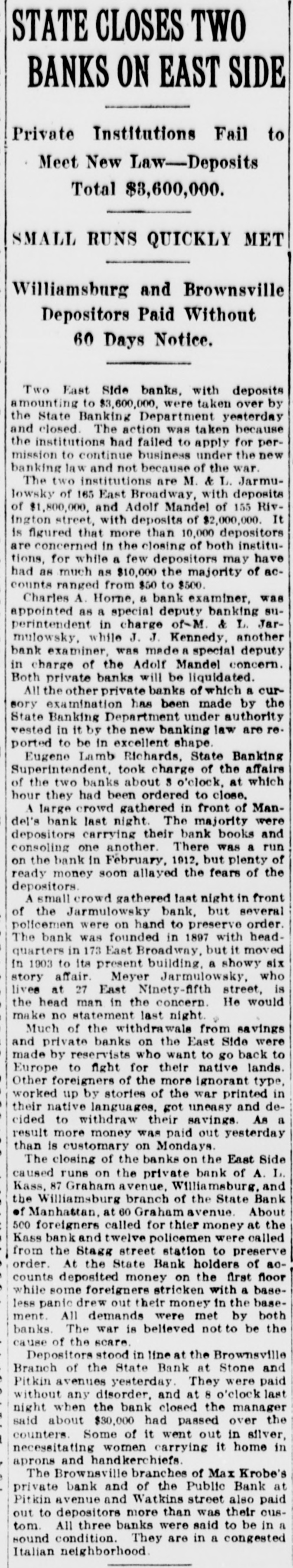 STATE CLOSES TWO BANKS ON EAST SIDE Private Institutions Fail to Meet New Law-Deposits Total $3,600,000. SMALL RUNS QUICKLY MET Williamsburg and Brownsville Depositors Paid Without 60 Days Notice. Two East Side banks, with deposits amounting to $3,600,000, were taken over by the State Banking Department yesterday and closed. The action was taken because the institutions had failed to apply for permission to continue business under the new banking law and not because of the war. The two institutions are M. & L. Jarmulowsky of 165 East Broadway, with deposits of $1,800,000, and Adolf Mandel of 155 Rivington street, with deposits of $2,000,000. It is figured that more than 10,000 depositors are concerned in the closing of both institutions, for while a few depositors may have had as much as $10,000 the majority of accounts ranged from $50 to $500. Charles A. Horne, a bank examiner, was appointed as a special deputy banking superintendent in charge of-M. & L. Jarmulowsky, while J. J. Kennedy, another bank examiner, was made R special deputy in charge of the Adolf Mandel concern. Both private banks will be liquidated. All the other private banks of which a cursory examination has been made by the State Banking Department under authority vested in it by the new banking law are reported to be in excellent shape. Eugene Lamb Richards, State Banking Superintendent, took charge of the affairs of the two banks about 8 o'clock, at which hour they had been ordered to close. A large crowd gathered in front of Mandel's bank last night. The majority were depositors carrying their bank books and consoling one another. There was a run on the bank in February, 1912, but plenty of ready money soon allayed the fears of the depositors. A small crowd gathered last night in front of the Jarmulowsky bank, but several policemen were on hand to preserve order. The bank was founded in 1897 with headquarters in 173 East Broadway. but it moved in 1903 to its present building. a showy six story affair. Meyer Jarmulowsky, who lives at 27 East Ninety-fifth street, is the head man in the concern. He would make no statement last night. Much of the withdrawals from savings and private banks on the East Side were made by reservists who want to go back to Europe to fight for their native lands. Other foreigners of the more ignorant type, worked up by stories of the war printed in their native languages, got uneasy and decided to withdraw their savings. As a result more money was paid out yesterday than is customary on Mondays. The closing of the banks on the East Side caused runs on the private bank of A. L. Kass, 87 Graham avenue, Williamsburg. and the Williamsburg branch of the State Bank of Manhattan, at 60 Graham avenue. About 500 foreigners called for thier money at the Kass bank and twelve policemen were called from the Stagg street station to preserve order. At the State Bank holders of aocounts deposited money on the first floor while some foreigners stricken with a baseless panic drew out their money in the basement. All demands were met by both banks. The war is believed not to be the cause of the scare. Depositors stood in line at the Brownsville Branch of the State Bank at Stone and Pitkin avenues yesterday. They were paid without any disorder, and at 8 o'clock last night when the bank closed the manager said about $30,000 had passed over the
