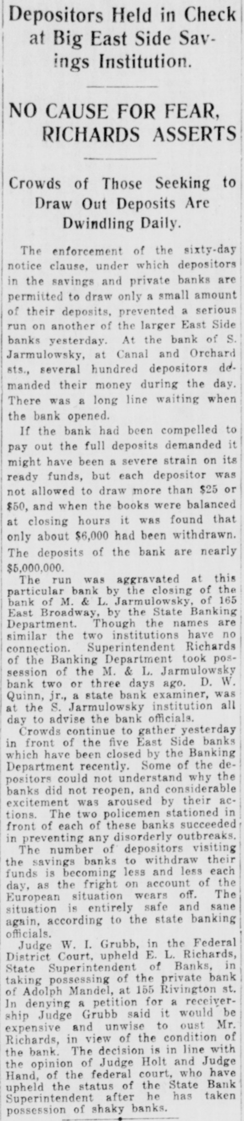 Depositors Held in Check at Big East Side Savings Institution. NO CAUSE FOR FEAR, RICHARDS ASSERTS Crowds of Those Seeking to Draw Out Deposits Are Dwindling Daily. The enforcement of the sixty-day notice clause, under which depositors in the savings and private banks are permitted to draw only a small amount of their deposits, prevented a serious run on another of the larger East Side banks yesterday. At the bank of S. Jarmulowsky, at Canal and Orchard sts., several hundred depositors demanded their money during the day. There was a long line waiting when the bank opened. If the bank had been compelled to pay out the full deposits demanded it might have been a severe strain on its ready funds, but each depositor was not allowed to draw more than $25 or $50, and when the books were balanced at closing hours it was found that only about $6,000 had been withdrawn. The deposits of the bank are nearly $5,000,000. The run was aggravated at this particular bank by the closing of the bank of M. & L. Jarmulowsky, of 165 East Broadway, by the State Banking Department. Though the names are similar the two institutions have no connection. Superintendent Richards of the Banking Department took possession of the M. & L. Jarmulowsky bank two or three days ago. D. W. Quinn, jr., a state bank examiner, was at the S. Jarmulowsky institution all day to advise the bank officials. Crowds continue to gather yesterday in front of the five East Side banks which have been closed by the Banking Department recently. Some of the depositors could not understand why the banks did not reopen, and considerable excitement was aroused by their actions. The two policemen stationed in front of each of these banks succeeded in preventing any disorderly outbreaks. The number of depositors visiting the savings banks to withdraw their funds is becoming less and less each day, as the fright on account of the European situation wears off. The situation is entirely safe and sane again, according to the state banking officials. Judge W. I. Grubb, in the Federal District Court, upheld E. L. Richards, State Superintendent of Banks, in taking possessing of the private bank of Adolph Mandel, at 155 Rivington st. In denying a petition for a receivership Judge Grubb said it would be expensive and unwise to oust Mr. Richards, in view of the condition of the bank. The decision is in line with the opinion of Judge Holt and Judge Hand, of the federal court, who have upheld the status of the State Bank Superintendent after he has taken possession of shaky banks.