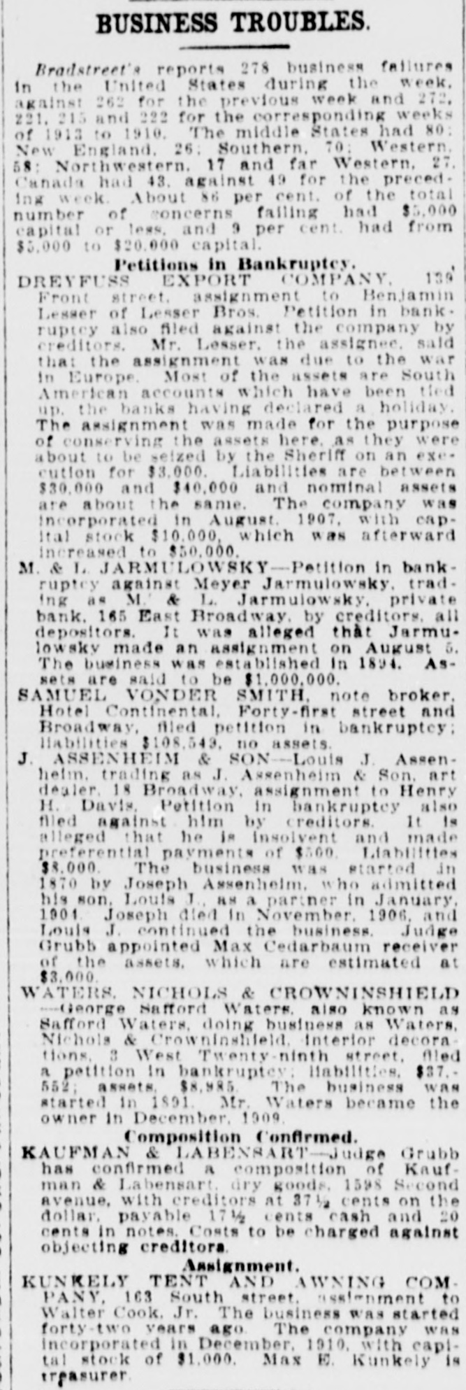 BUSINESS TROUBLES. Bradstreet's reports 278 business failures in the United States during the week. against 262 for the previous week and 272, 221. 215 and 222 for the corresponding weeks of 1913 to 1910. The middle States had 80: New England. 26: Southern, 70: Western. 58: Northwestern. 17 and far Western, 27. Canada had 43. against 49 for the preceding week. About 86 per cent. of the total number of soncerns failing had $5,000 capital or less, and 9 per cent. had from $5,000 to $20.000 capital. Petitions in Bankruptcy. DREYFUSS EXPORT COMPANY, 139 Front street. assignment to Benjamin Lesser of Lesser Bros. Petition in bank. ruptcy also filed against the company by creditors. Mr. Lesser. the assignee. said that the assignment was due to the war in Europe. Most of the assets are South American accounts which have been tied up. the banks having declared a holiday. The assignment was made for the purpose of conserving the assets here. as they were about to be seized by the Sheriff on an execution for $3,000. Liabilities are between $30,000 and $40,000 and nominal assets are about the same. The company was incorporated in August. 1907, with capItal stock $10,000, which was afterward increased to $50,000. M. & L JARMULOWSKY-Petition in bankruptcy against Meyer Jarmulowsky. trading as M. & L. Jarmulowsky, private bank. 165 East Broadway. by creditors. all depositors. It was alleged that Jarmulowsky made an assignment on August 5. The business was established In 1894. Assets are said to be $1,000,000. SAMUEL VONDER SMITH, note broker. Hotel Continental, Forty-first street and Broadway, filed petition in bankruptcy: liabilities $108,549. no assets. J. ASSENHEIM & SON-Louis J. Assenhelm. trading as J. Assenheim & Son. art dealer. 18 Broadway, assignment to Henry H. Davis. Petition in bankruptcy also filed against him by creditors. It is alleged that he is Insolvent and made preferential payments of $500. Liabilittes $8.000. The business was started in 1870 by Joseph Assenheim. who admitted his son. Louis 1., as a partner in January, 1901 Joseph died In November. 1906, and Louis J. continued the business. Judge Grubb appointed Max Cedarbaum receiver of the assets. which are estimated at $3,000. WATERS. NICHOLS & CROWNINSHIELD George Safford Waters. also known as Safford Waters, doing business as Waters. Nichols & Crowninshield, Interior decorations. 3 West Twenty-ninth street, filed a petition In bankruptcy: Habilities. $37.552; assets $8,985 The business was started in 1891. Mr. Waters became the owner in December. 1909. Composition Confirmed. KAUFMAN & LABENSART-Judge Grubb has confirmed a composition of Kaufman & Labensart. dry goods. 1598 Second avenue, with creditors at 37½ cents on the dollar. payable 17 1/2 cents cash and 20 cents in notes. Costs to be charged against objecting creditors. Assignment. KUNKELY TENT AND AWNING COMPANY, 163 South street. assignment to Walter Cook. Jr. The business was started forty-two years ago The company was incorporated in December. 1910. with capital stock of $1,000. Max E. Kunkely is treasurer.