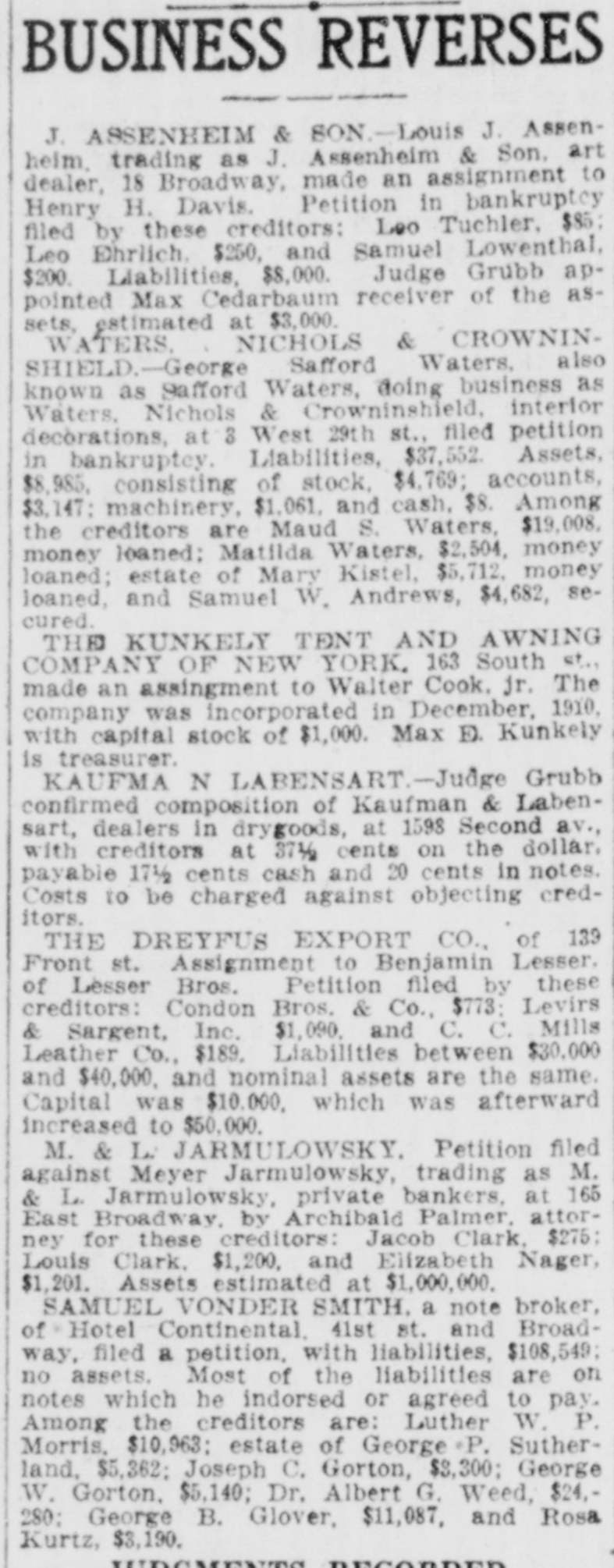 BUSINESS REVERSES J. ASSENHEIM & SON.-Louis J. Assenhelm. trading as J. Assenheim & Son, art dealer, 18 Broadway, made an assignment to Henry H. Davis. Petition in bankruptcy filed by these creditors: Leo Tuchler, $85; Leo Ehrlich, $250, and Samuel Lowenthal, $200. Liabilities, $8,000. Judge Grubb appointed Max Cedarbaum receiver of the assets, estimated at $3,000. WATERS, NICHOLS & CROWNINSHIELD.-George Safford Waters, also known as Safford Waters, doing business as Waters, Nichols & Crowninshield, interior decorations, at 3 West 29th st., filed petition in bankruptcy. Liabilities, $37,552. Assets, $8,985, consisting of stock, $4,769; accounts, $3,147: machinery, $1,061, and cash, $8. Among the creditors are Maud S. Waters, $19,008, money loaned: Matilda Waters, $2,504, money loaned; estate of Mary Kistel, $5,712, money loaned, and Samuel W. Andrews, $4,682, secured. THE KUNKELY TENT AND AWNING COMPANY OF NEW YORK. 163 South st., made an assingment to Walter Cook, Jr. The company was incorporated in December, 1910. with capital stock of $1,000. Max E. Kunkely is treasurer. KAUFMA N LABENSART.-Judge Grubb confirmed composition of Kaufman & Labensart, dealers in drygoods, at 1598 Second av., with creditors at 371/2 cents on the dollar, payable 17½ cents cash and 20 cents in notes. Costs to be charged against objecting creditors. THE DREYFUS EXPORT CO., of 139 Front st. Assignment to Benjamin Lesser. of Lesser Bros. Petition filed by these creditors: Condon Bros. & Co., $773; Levirs & Sargent, Inc. $1,090. and C. C. Mills Leather Co., $189, Liabilities between $30,000 and $40,000. and nominal assets are the same. Capital was $10,000. which was afterward increased to $50,000. M. & L. JARMULOWSKY. Petition filed against Meyer Jarmulowsky, trading as M. & L. Jarmulowsky, private bankers, at 165 East Broadway. by Archibald Palmer, attorney for these creditors: Jacob Clark, $275: Louis Clark. $1,200, and Elizabeth Nager, $1,201. Assets estimated at $1,000,000. SAMUEL VONDER SMITH. a note broker, of Hotel Continental. 41st st. and Broadway, filed a petition, with liabilities, $108,549; no assets. Most of the liabilities are on notes which he indorsed or agreed to pay. Among the creditors are: Luther W. P. Morris. $10,963: estate of George P. Sutherland, $5,362: Joseph C. Gorton, $8,300; George W. Gorton, $5,140; Dr. Albert G. Weed, $24,280: George B. Glover, $11,087, and Rosa Kurtz, $3,190.