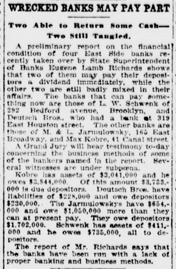 WRECKED BANKS MAY PAY PART Two Able to Return Some CashTwo Still Tangled. A preliminary report on the financial condition of four East Side banks recently taken over by State Superintendent of Banks Eugene Lamb Richards shows that two of them may pay their depositors a dividend immediately, while the other two are etill badly mixed in their affairs. The banks that can pay some. thing now are those of L. W. Schwenk of 292 Bedford avenue, Brooklyn, and Deutsch Bros., who had a bank at 319 East Houston street. The other banks are those of M. & L. Jarmulowsky, 165 East Broadway. and Max Kobre, 41 Canal street A Grand Jury will hear testimony to-day concerning the business methods of some of the bankers named in the report. Several witnesses are under subpoena. Kobre has assets of $3,041,000 and he owes $3,844,000. Of this amount $3,783.000 18 due depositors. Deutsch Broe. have liabilities of $228,000 and owe depositors $230,000. The Jarmulowskys have $654.000 and owe $1,050,000 more than they can at present pay. They owe depositors $1,702,000. Schwenk has assets of $411.000 and he owes $735,000, all to depositore. The report of Mr. Richards says that the banks have been run with a lack of proper banking and business methods.