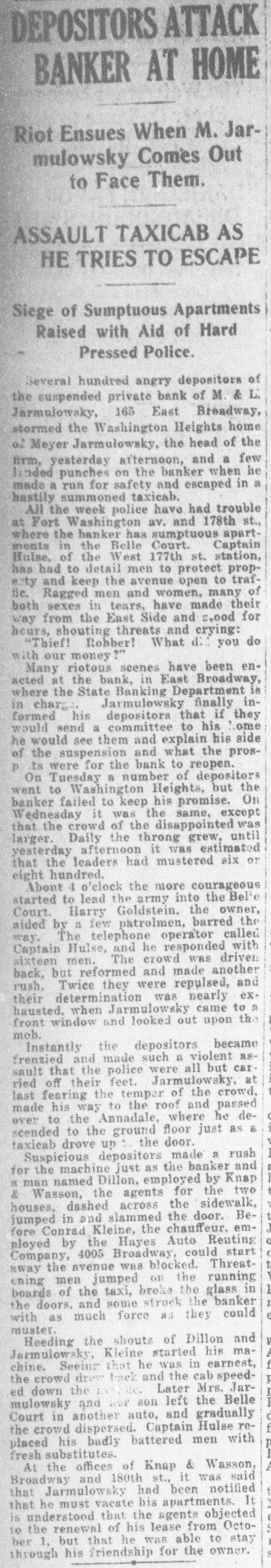 DEPOSITORS ATTACK BANKER AT HOME Riot Ensues When M. Jarmulowsky Comes Out to Face Them. ASSAULT TAXICAB AS HE TRIES TO ESCAPE Siege of Sumptuous Apartments Raised with Aid of Hard Pressed Police. Several hundred angry depositors of the suspended private bank of M. & L. Jarmulowsky, 165 East Breadway, stormed the Washington Heights home of Meyer Jarmulowsky, the head of the firm, yesterday aiternoon, and a few linded punches on the banker when he made a run for safety and escaped in a hastily summoned taxicab. All the week police have had trouble at Fort Washington av. and 178th st., where the banker has sumptuous apartments in the Belle Court. Captain Hulse, of the West 177th st. station, has had to detail men to protect propenty and keep the avenue open to traffie. Ragged men and women, many of both sexes in tears, have made their way from the East Side and s.ood for hours, shouting threats and crying: "Thief! Robber! What did you do with our money Many riotous scenes have been enacted at the bank, in East Broadway, where the State Banking Department is in charge Jarmulowsky finally informed his depositors that if they would send a committee to his '.ome he would see them and explain his side of the suspension and what the prosP. ts were for the bank to reopen. On Tuesday a number of depositors went to Washington Heights, but the banker failed to keep his promise. On Wednesday it was the same, except that the crowd of the disappointed was larger. Daily the throng grew, until yesterday afternoon it was estimated that the leaders had mustered six or eight hundred. About 4 o'clock the more courageous started to lead the army into the Belie Court. Harry Goldstein. the owner, aided by a few patrolmen, barred the way, The telephone operator called Captain Hulse, and he responded with sixteen men. The crowd was driven back, but reformed and made another rush. Twice they were repulsed, and their determination was nearly exhausted, when Jarmulowsky came to a front window and looked out upon the mob. Instantly the depositors became frenzied and made such a violent assault that the police were all but carried off their feet. Jarmulowsky, at last fearing the temper of the crowd, made his way to the roof and passed over to the Annadale, where he descended to the ground floor just as & taxicab drove up the door. Suspicious depositors made a rush for the machine just as the banker and a man named Dillon, employed by Knap & Wasson, the agents for the two houses, dashed across the sidewalk, jumped in and slammed the door. Before Conrad Kleine, the chauffeur. em0 ployed by the Hayes Auto Renting Company, 4005 Broadway, could start away the avenue was blocked. Threatening men jumped on the running boards of the taxi, broke the glass in I the doors, and some struck the banker o with as much force as they could muster. ed Heeding the shouts of Dillon and Jarmulowsky, Kleine started his machine. Seeins that he was in earnest, the crowd drew back and the cab speedI ed down the Later Mrs. Jarmulowsky and nor son left the Belle Court in another auto, and gradually f the crowd dispersed. Captain Hulse replaced his badly battered men with fresh substitutes. At the offices of Knap & Wasson, Broadway and 180th st., it was said that Jarmulowsky had been notified that he must vacate his apartments. It is understood that the agents objected to the renewal of his lease from October 1, but that he was able to stay through his friendship for the owner.