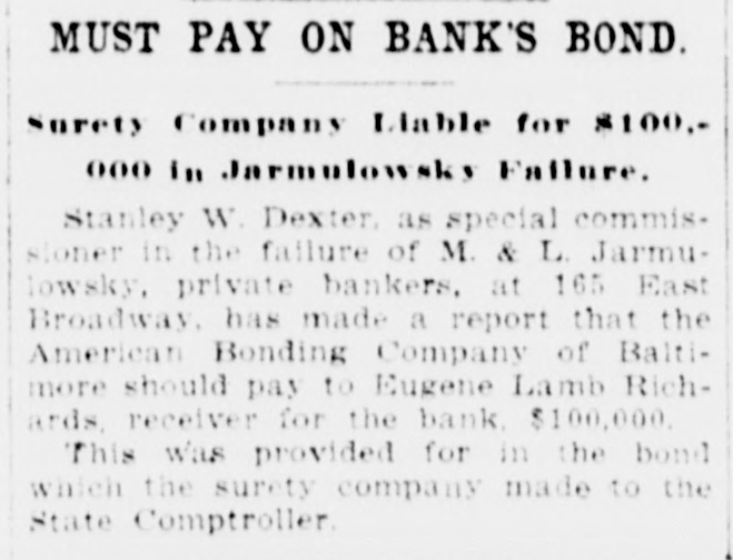 MUST PAY ON BANK'S BOND. Surety Company Liable for $100.000 in Jarmulowsky Failure. Stanley W. Dexter, as special commissioner in the failure of M. & L. Jarmulowsky, private bankers, at 165 East Broadway. has made a report that the American Bonding Company of Baltimore should pay to Eugene Lamb Richards, receiver for the bank. $100,000. This was provided for in the bond which the surety company made to the State Comptroller.